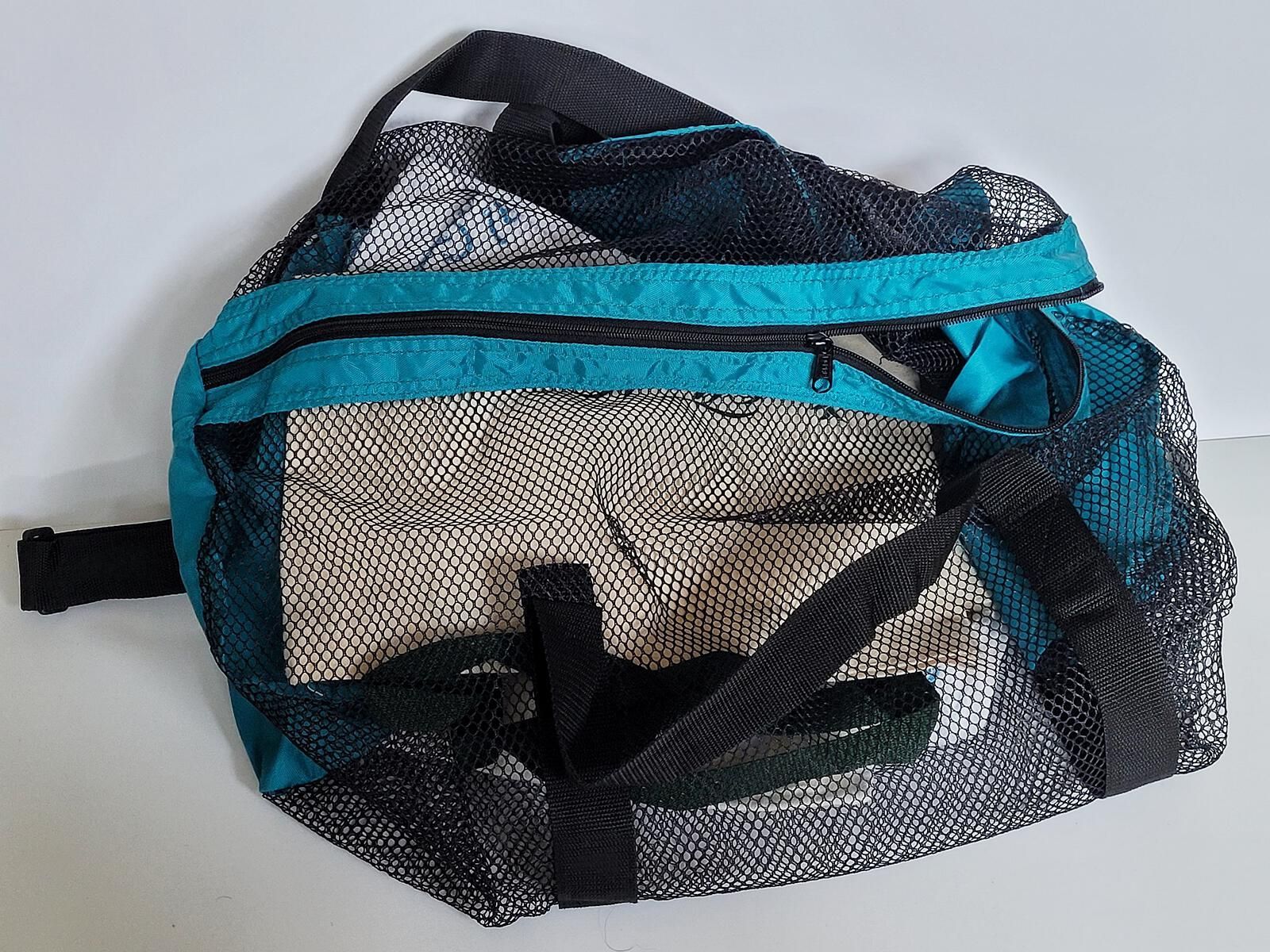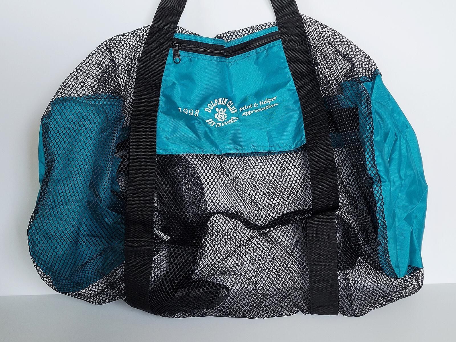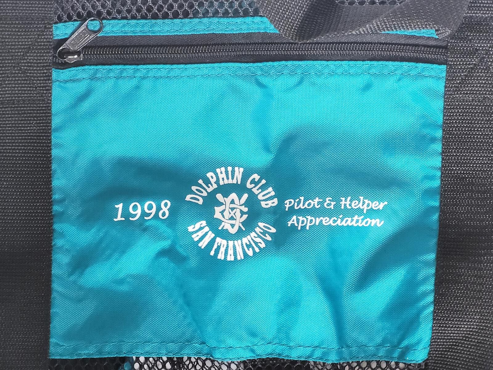 Nylon mesh duffle with shoulder strap and zippered top. Teal colored panels with white printing: Dolphin Club with Logo, and 1998 Pilot & Helper Appreciation. Includes a zipped pocket (8"X7").