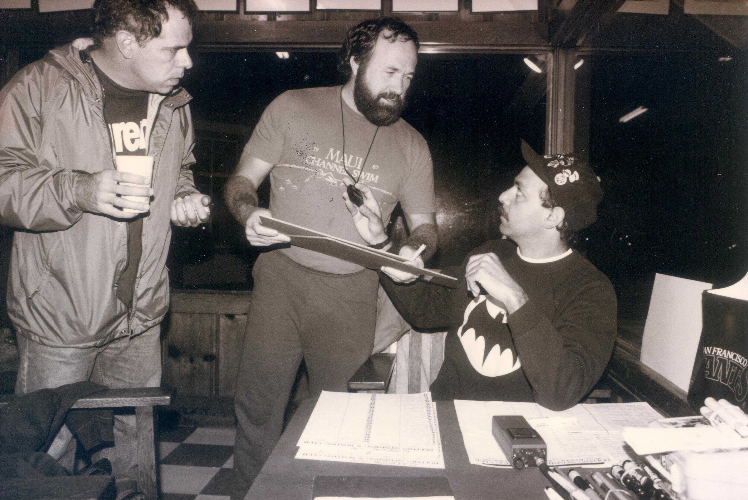 Swim Commissioner Dave Zovickian (seated) discussing plans with Mike Webb and Tim Callahan