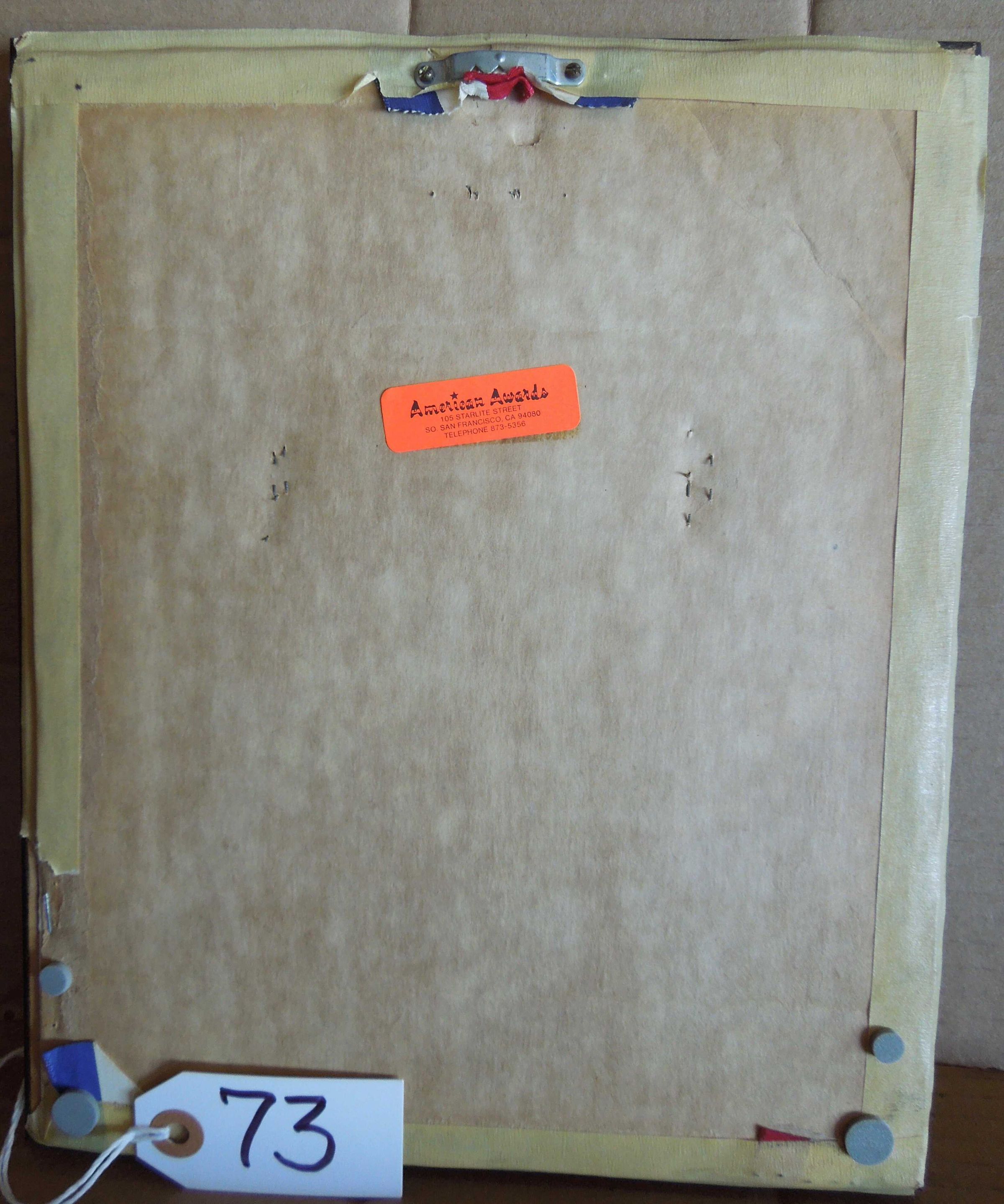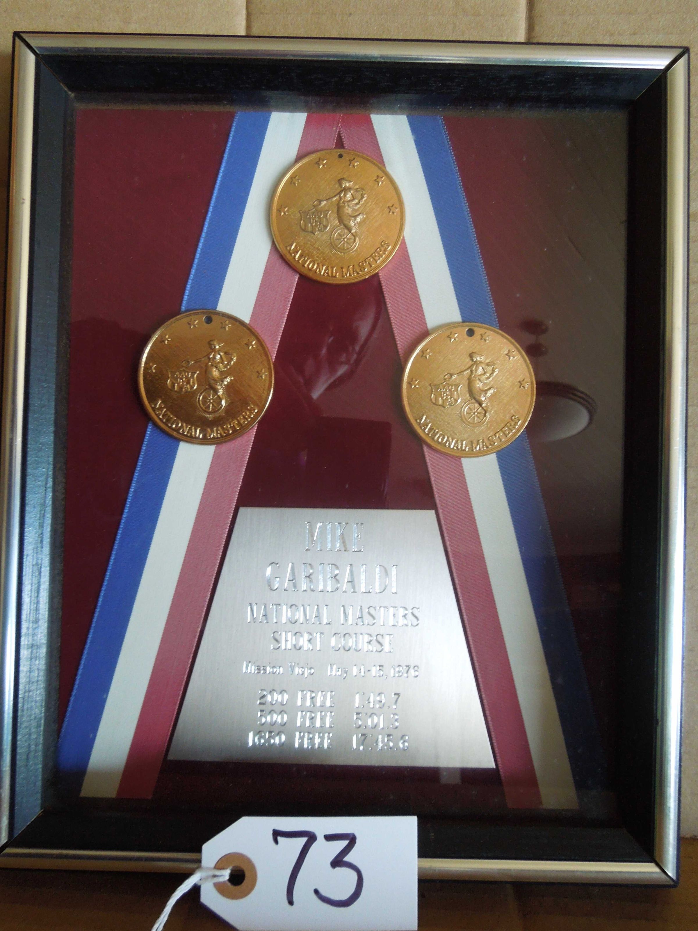 Black/gold frame with 3 colored brass medals mounted on red backing with tricolor ribbon; Contains USMS medals won by Mike Garibaldi 1978.