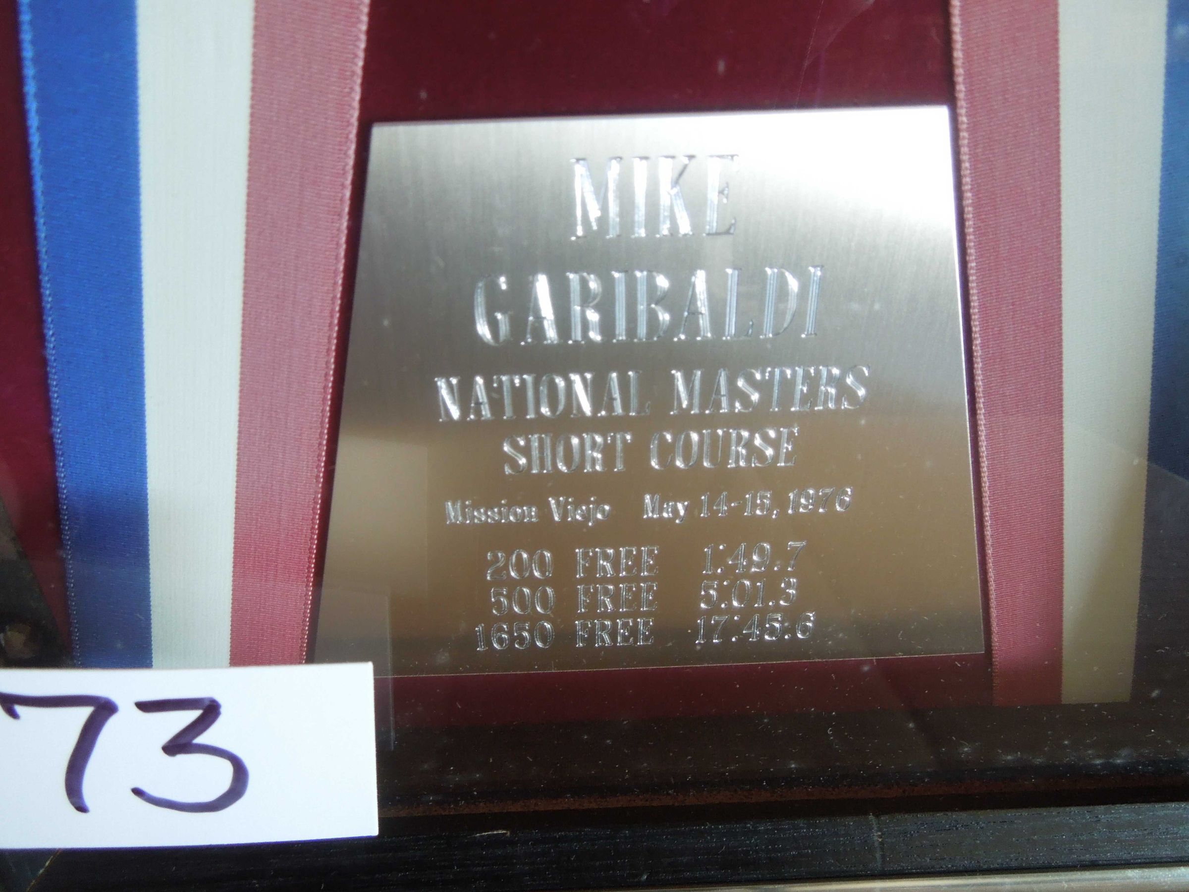 Engraved on silver color plate: "Mike - Garibaldi - National Masters - Short Course Mission Viejo May 14-15, 1976 - 200 FREE 1:49.7 - 500 FREE 5:01.3 - 1650 Free 17:45.6"Made/Created