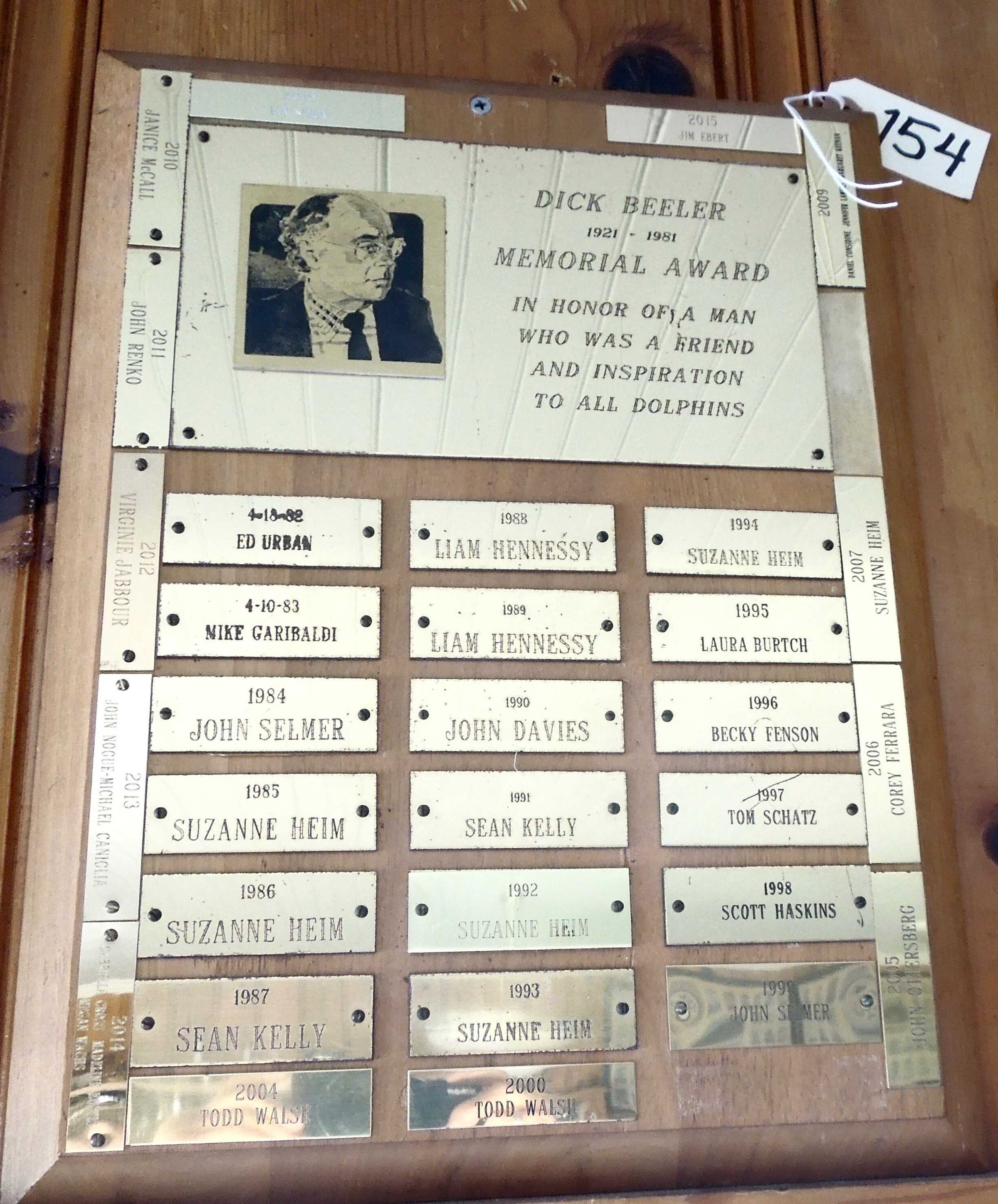 Wood plaque with large header gold tone title plate with printed photograph of Dick Beeler;