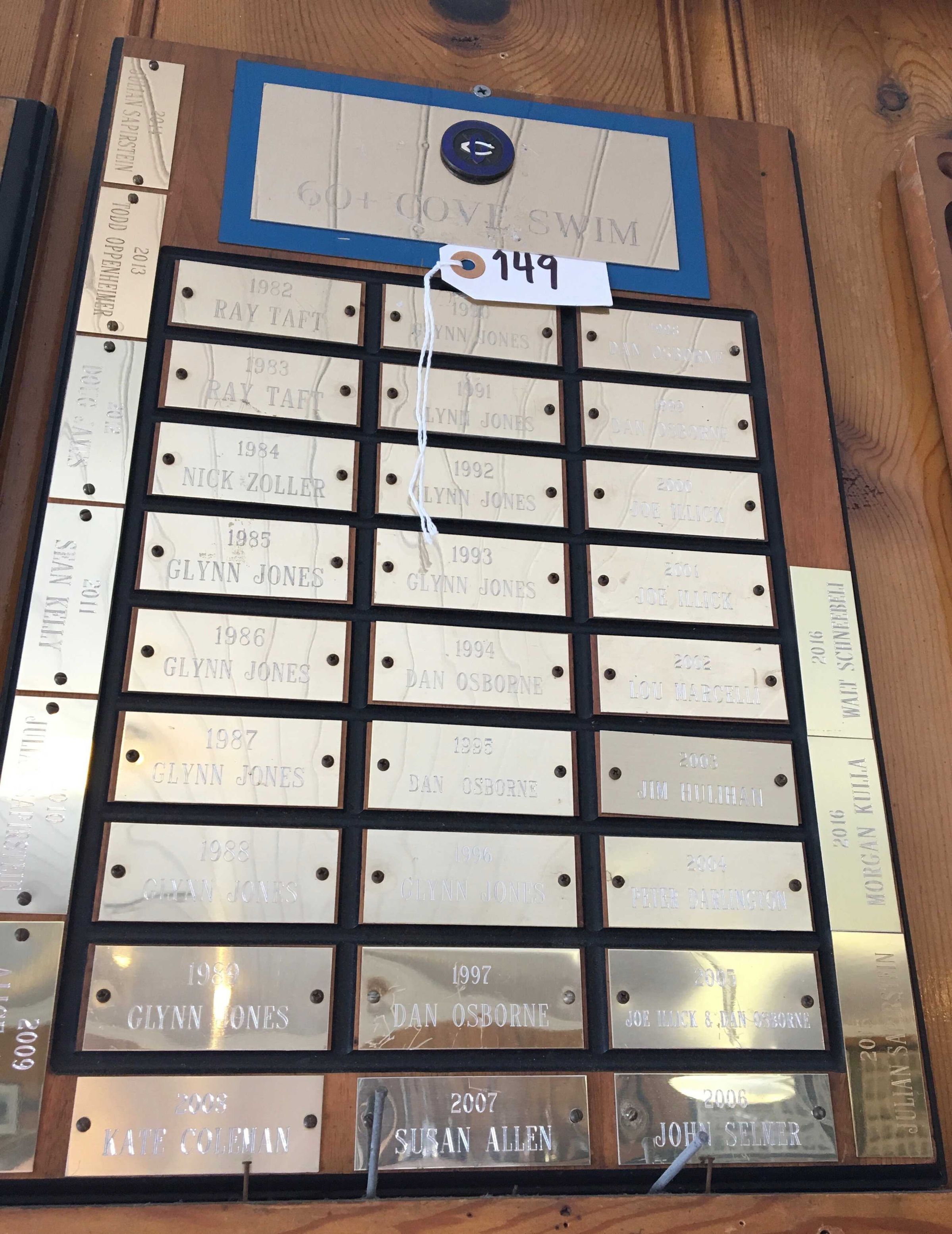 Wood plaque with gold tone title plate on blue background with DC medallion above title: "60+ Cove Swim"