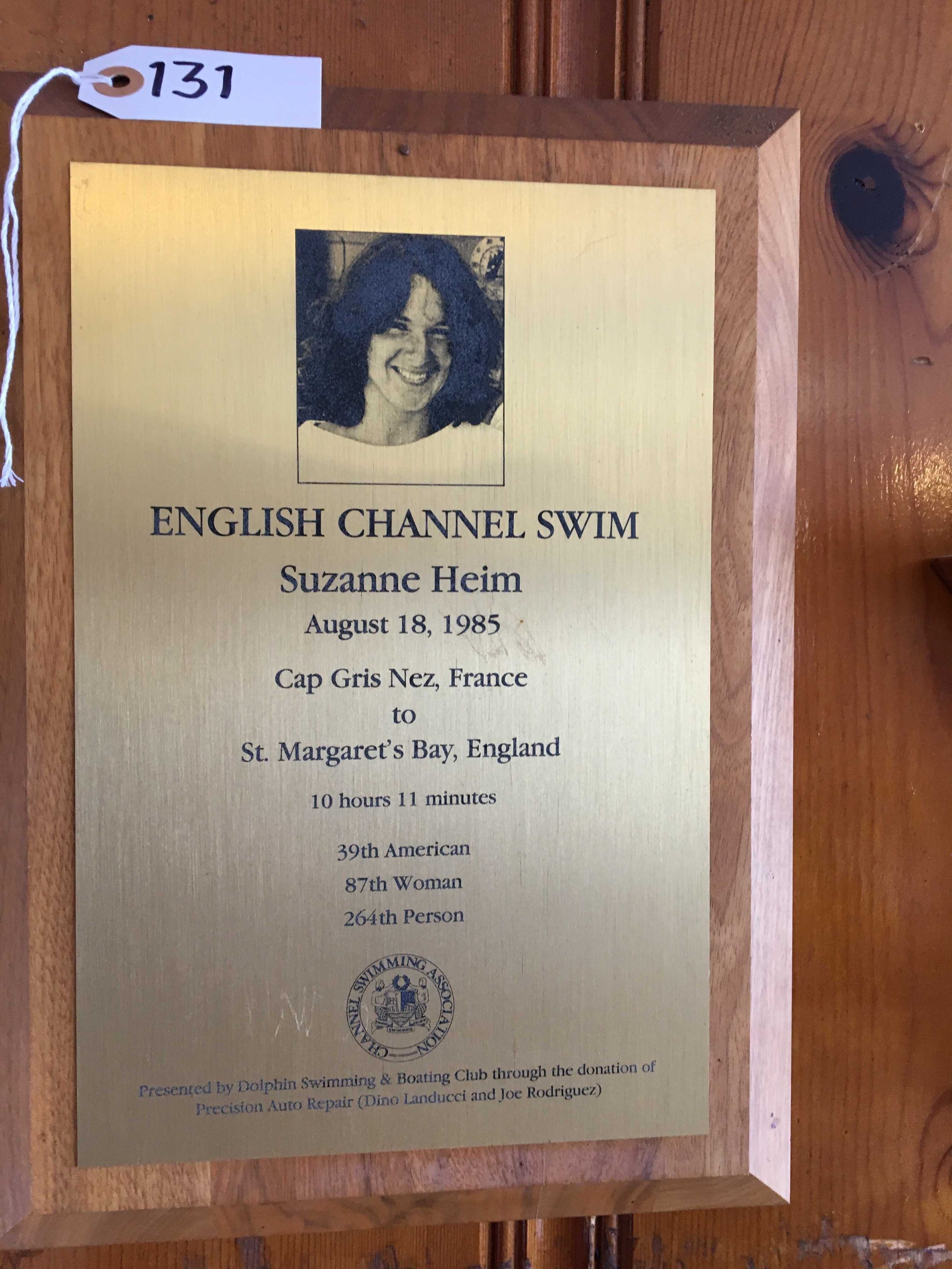 Text on plate: "English Channel Swim - Suzanne Heim - August 18, 1985 - Cap Gris Nez, France - to - St. Margaret's Bay, England - 10 hours 11 minutes - 39th American - 87th Woman - 264th Person.
