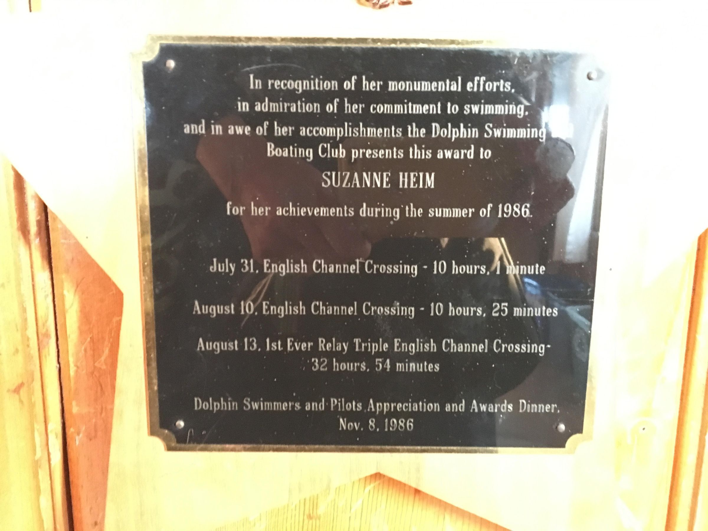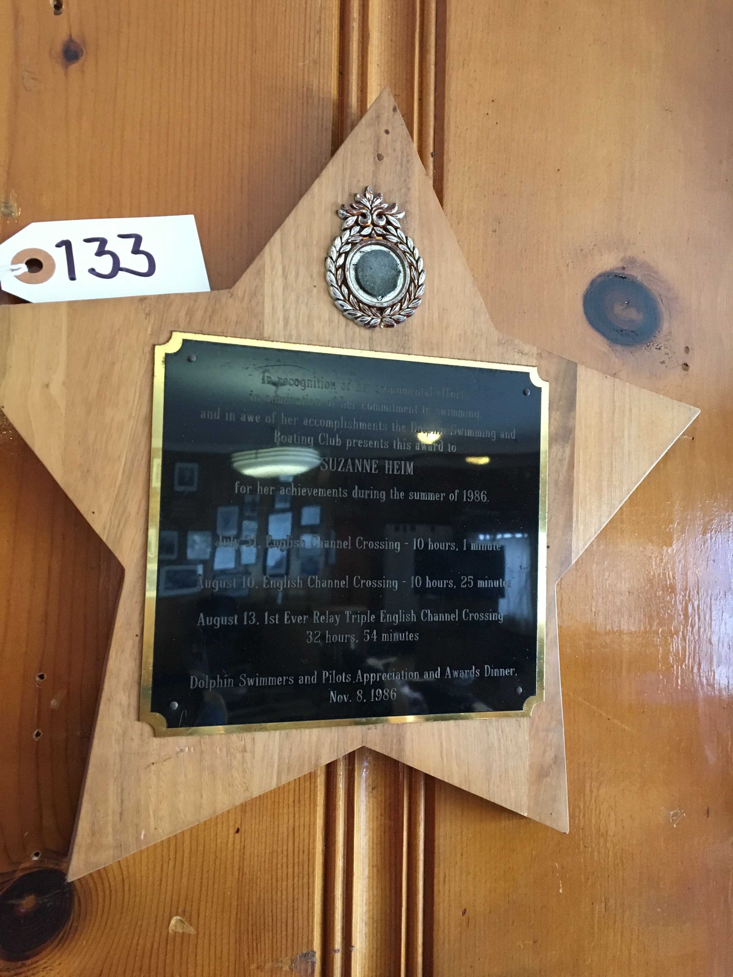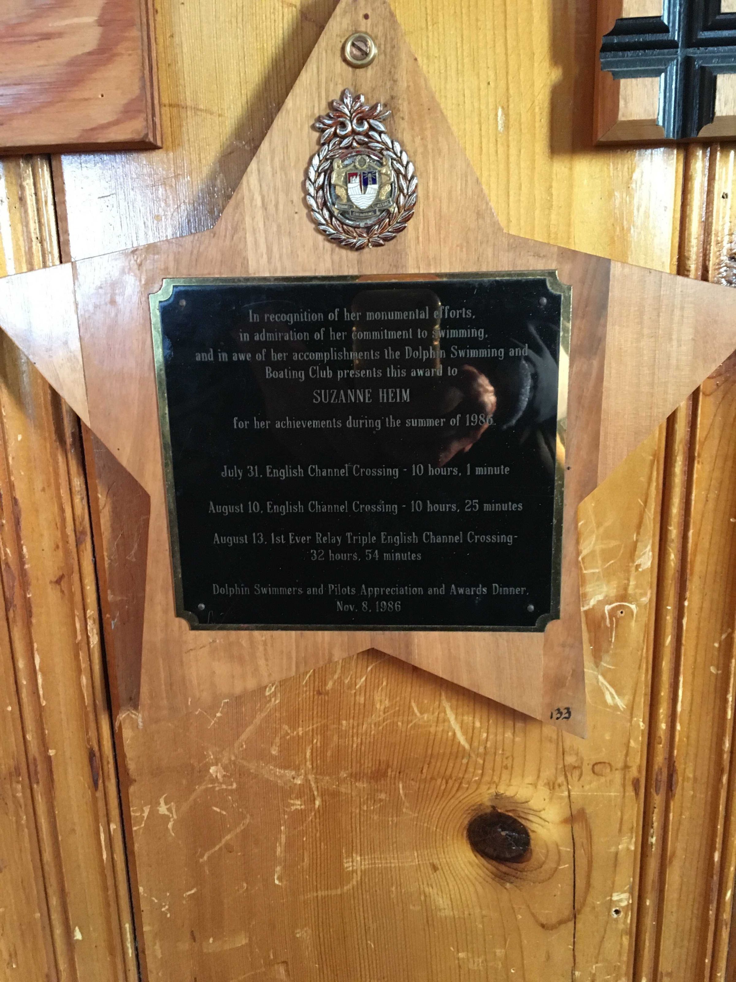 5 point star shaped wood plaque with brass medallion near top point and engraved black plate with gold edge in center, honoring Suzanne Heim for English Channel swims.