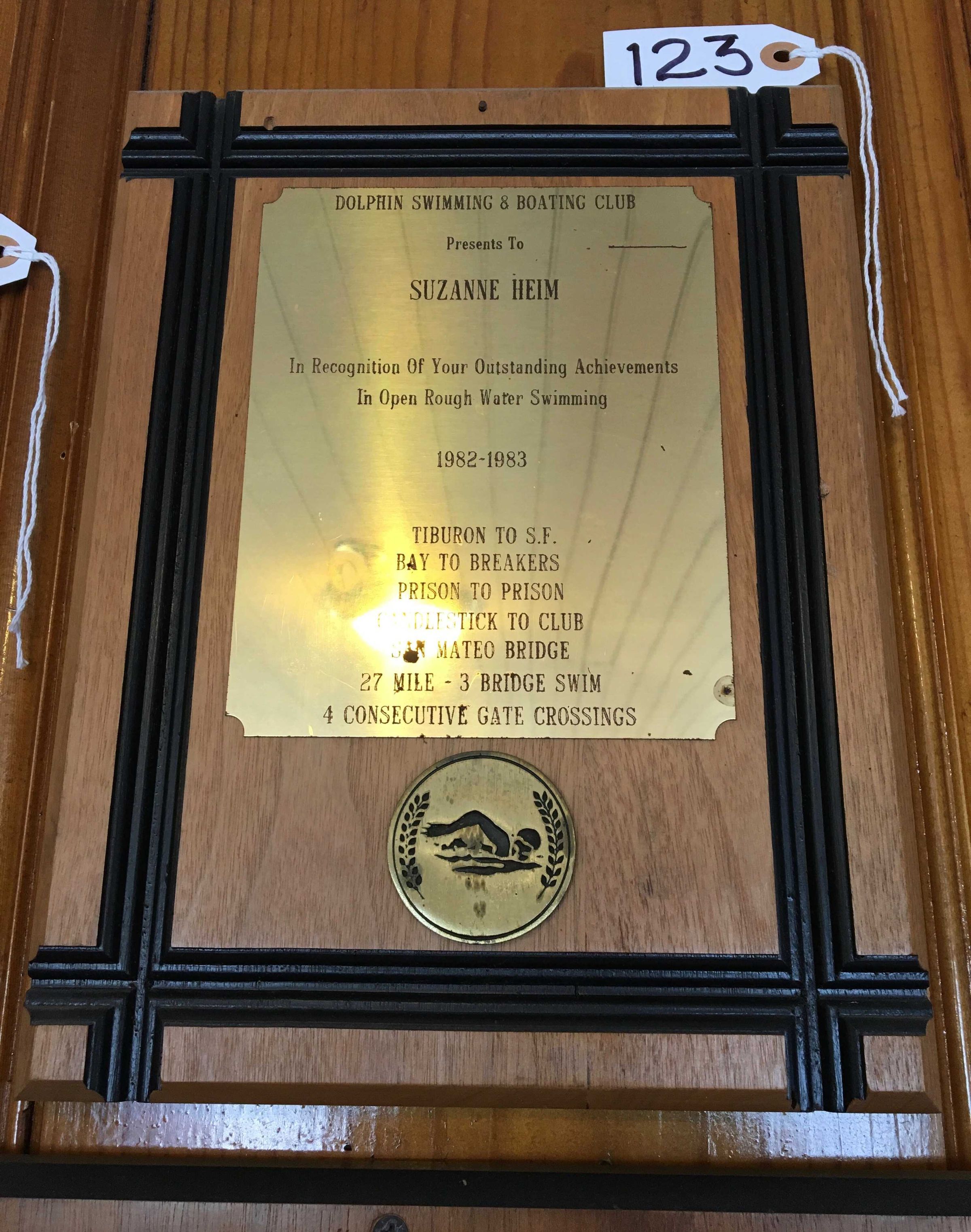 Text on plate: "Dolphin Swimming & Boating Club - Presents To - Suzanne Heim - In Recognition Of Your Outstanding Achievements - In Open Rough Water Swimming - 1982-1983 - Tiburon to SF - Bay to Breakers - Prison to Prison - Candlestick to Club - San Mateo Bridge - 27 Mile - 3 Bridge Swim - 4 Consecutive Gate Crossings"Made/Created