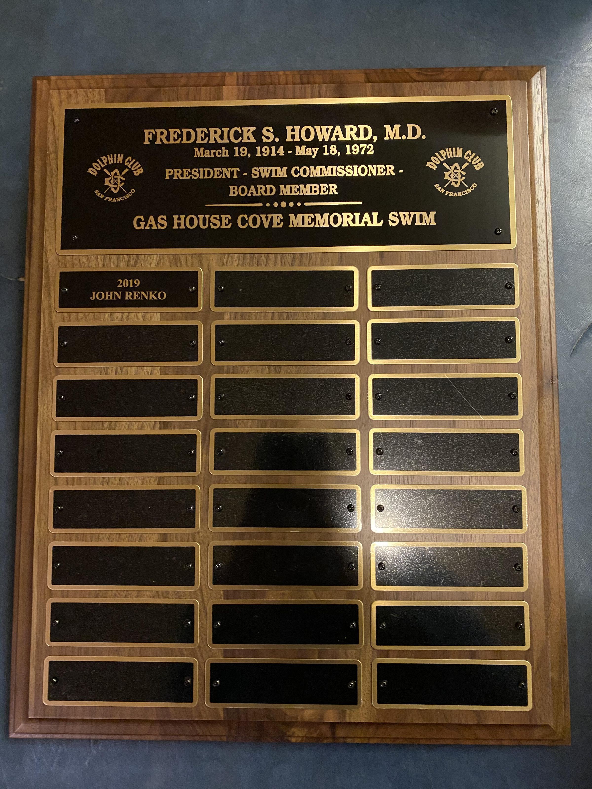 Text on title plate: "Frederick S. Howard, M.D. - March 19, 1914-May 18, 1972 - President, Swim Commissioner - Board Member - Gas House Cove Memorial Swim"