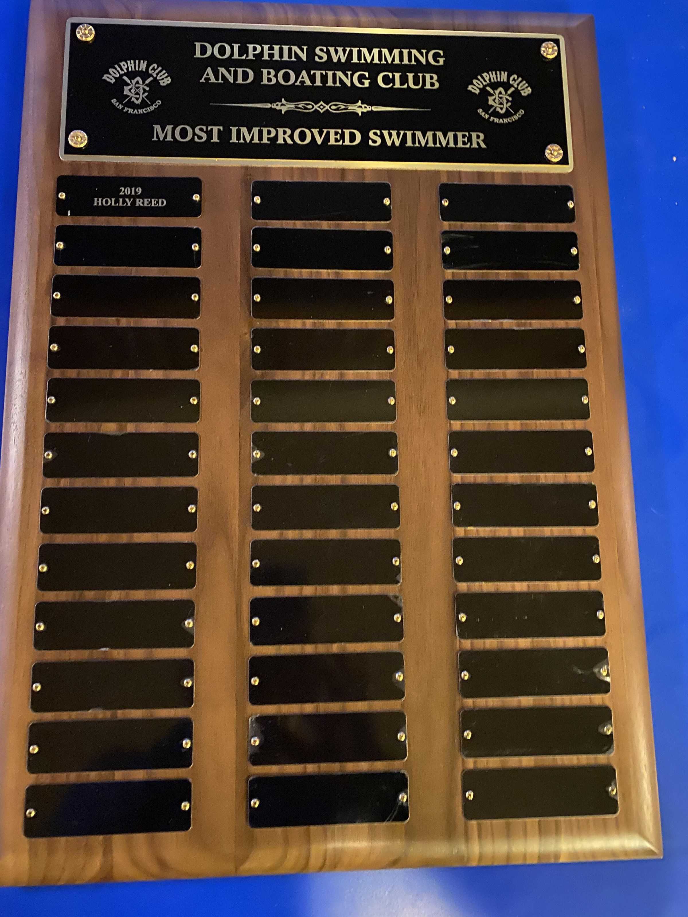 Title plate reads:"Dolphin Swimming and Boating Club - Most Improved Swimmer"