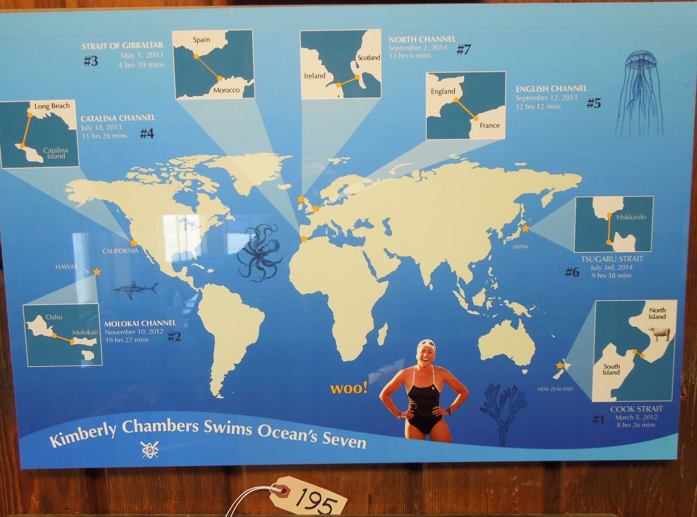 Kim Chamber's photo on world map with locations and details of seven ocean's swims.
