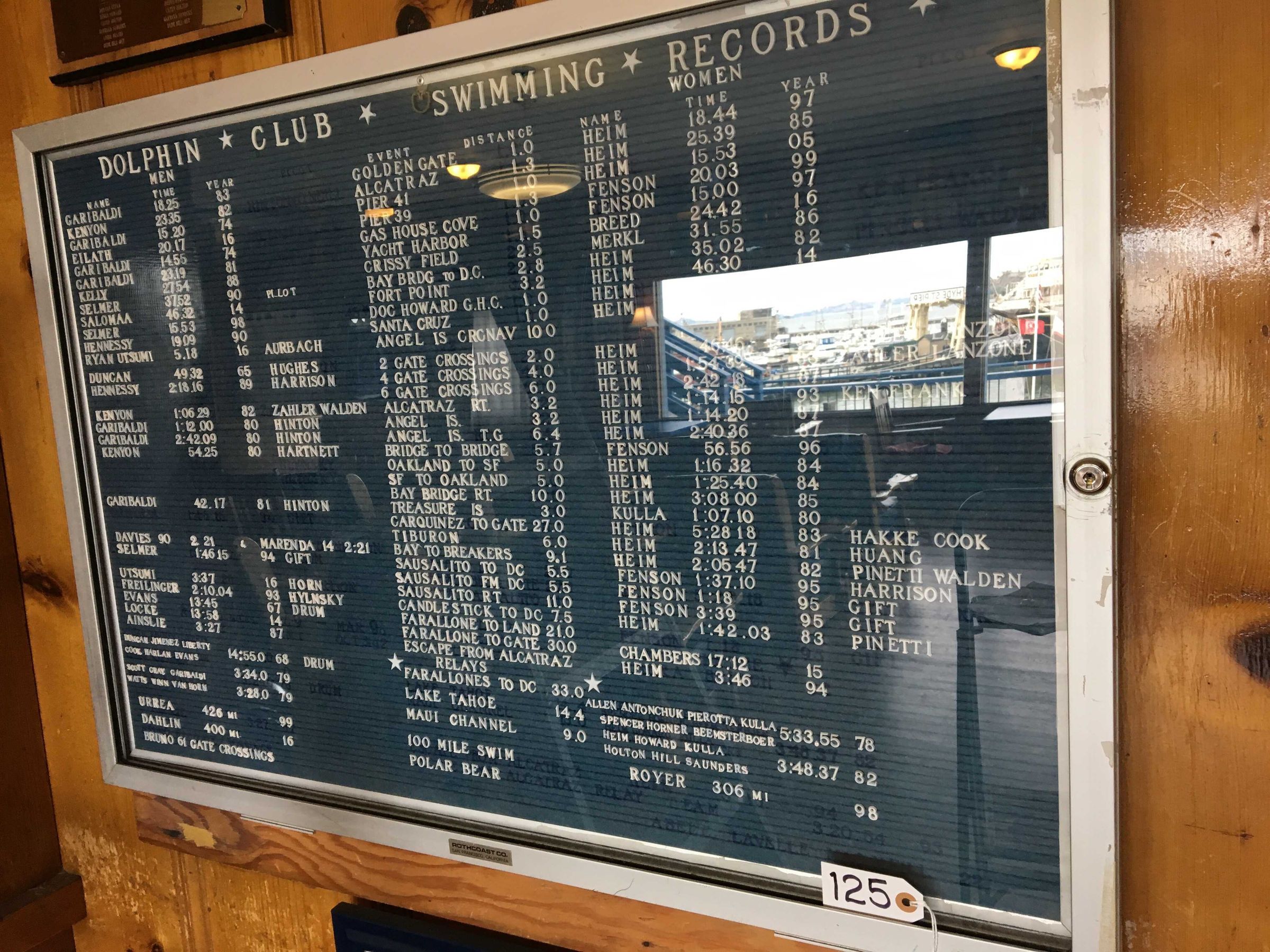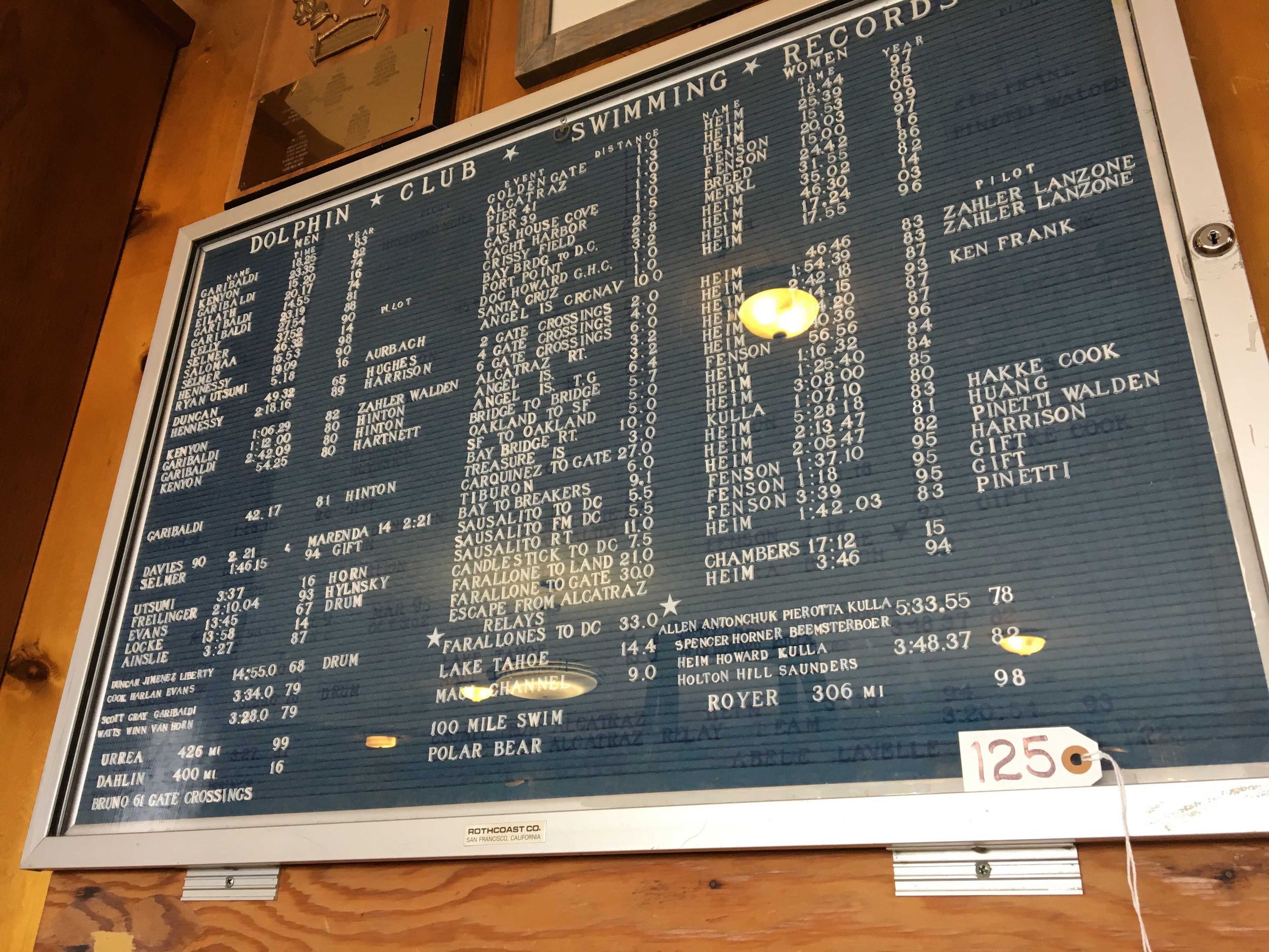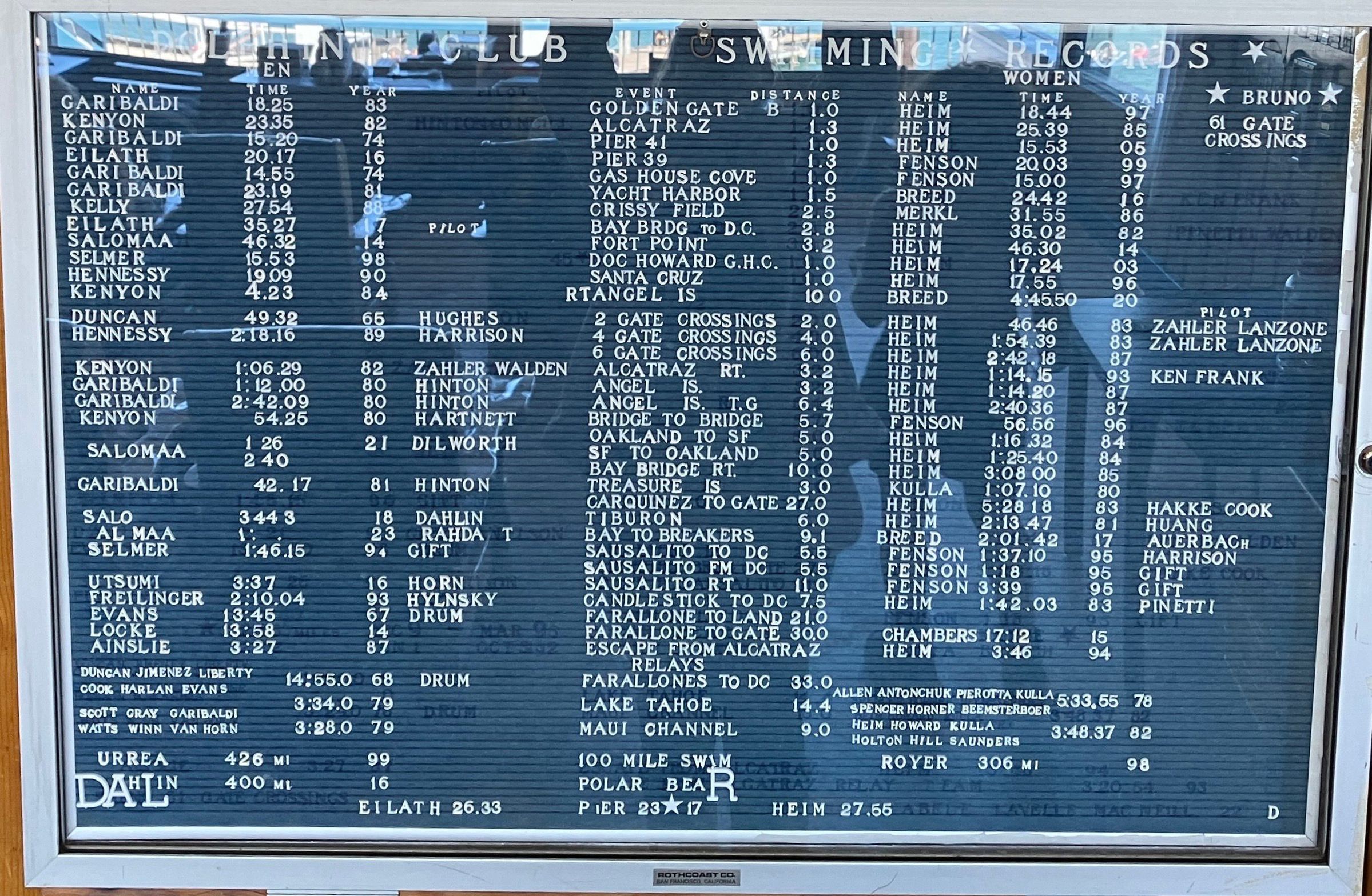 Silver framed blue board with white plastic lettering listing Dolphin Club Swimming Records; front glass door opens with key; many names of swimmers, pilots, events, times, distances and years 1965 to present.Use