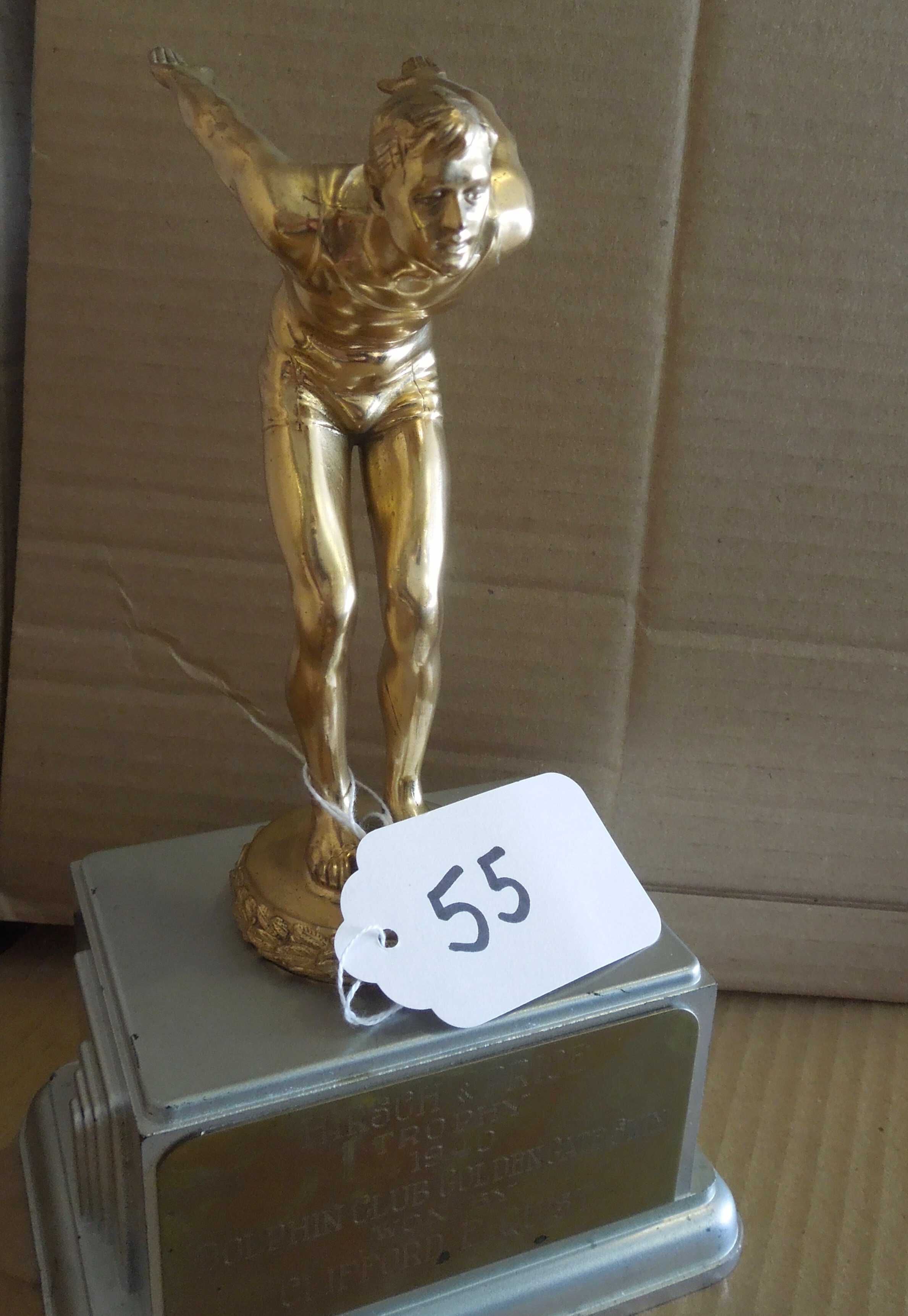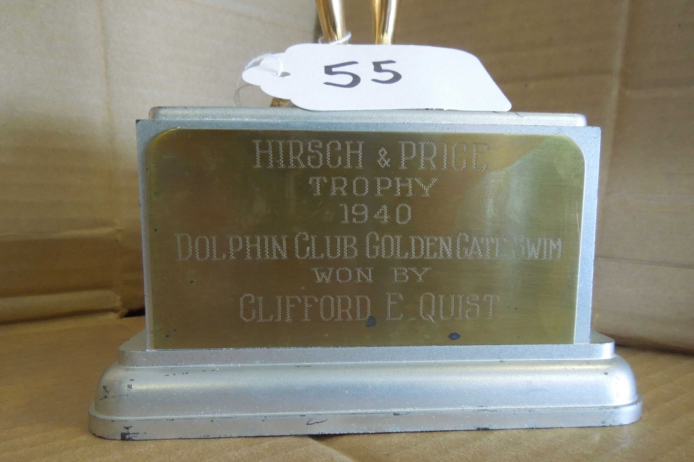 Gold color swimmer figure on rectangular silver color plastic base. Metal plate on front inscribed: " Hirsch & Price Trophy - 1940 - Dolphin Club Golden Gate Swim - Won by - Clifford E. Quist"Made/Created