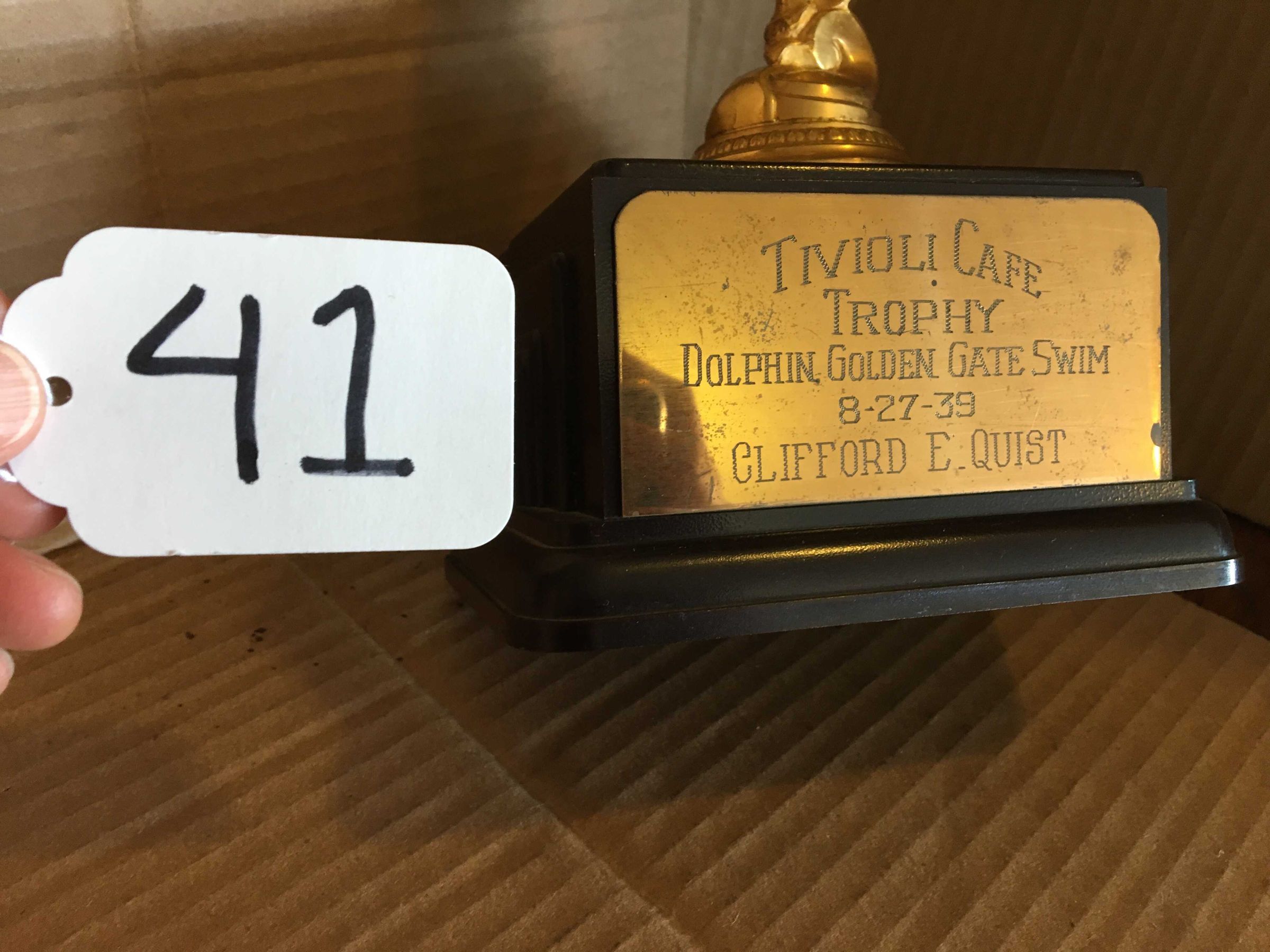Engraved on plate: "Tivoli Café -Trophy - Dolphin Golden Gate Swim - 8-27-39 - Clifford E. Quist"