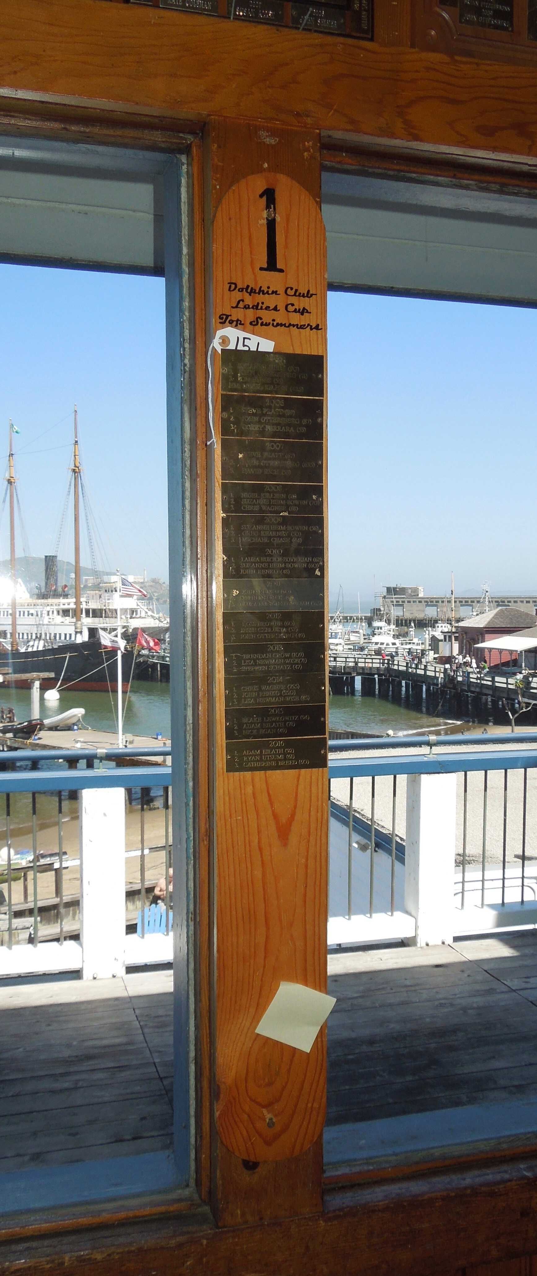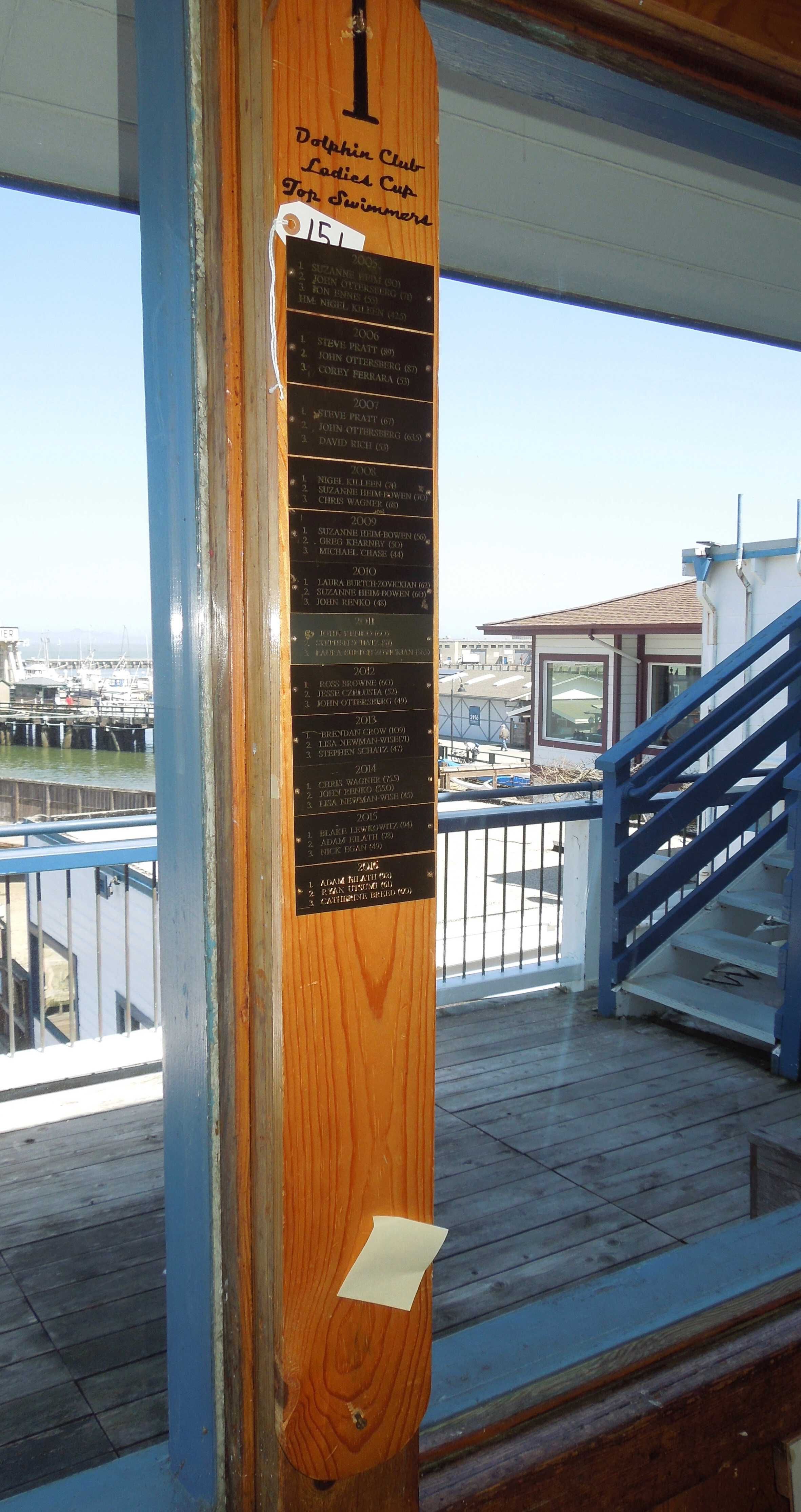 Tall narrow oval wooden plaque with black painted '1' at top, and black script title: "Dolphin Club - Ladies Cup - Top Swimmers"