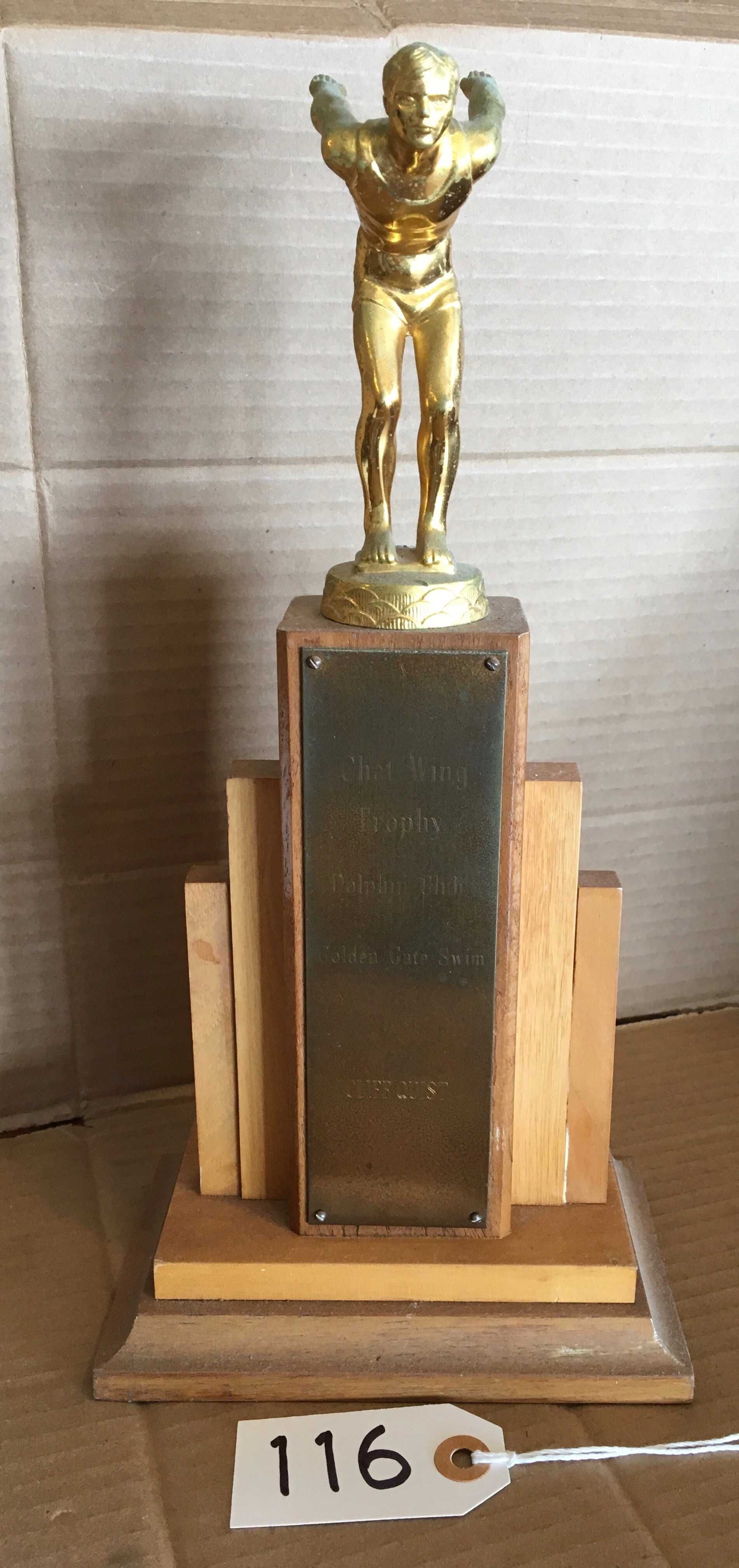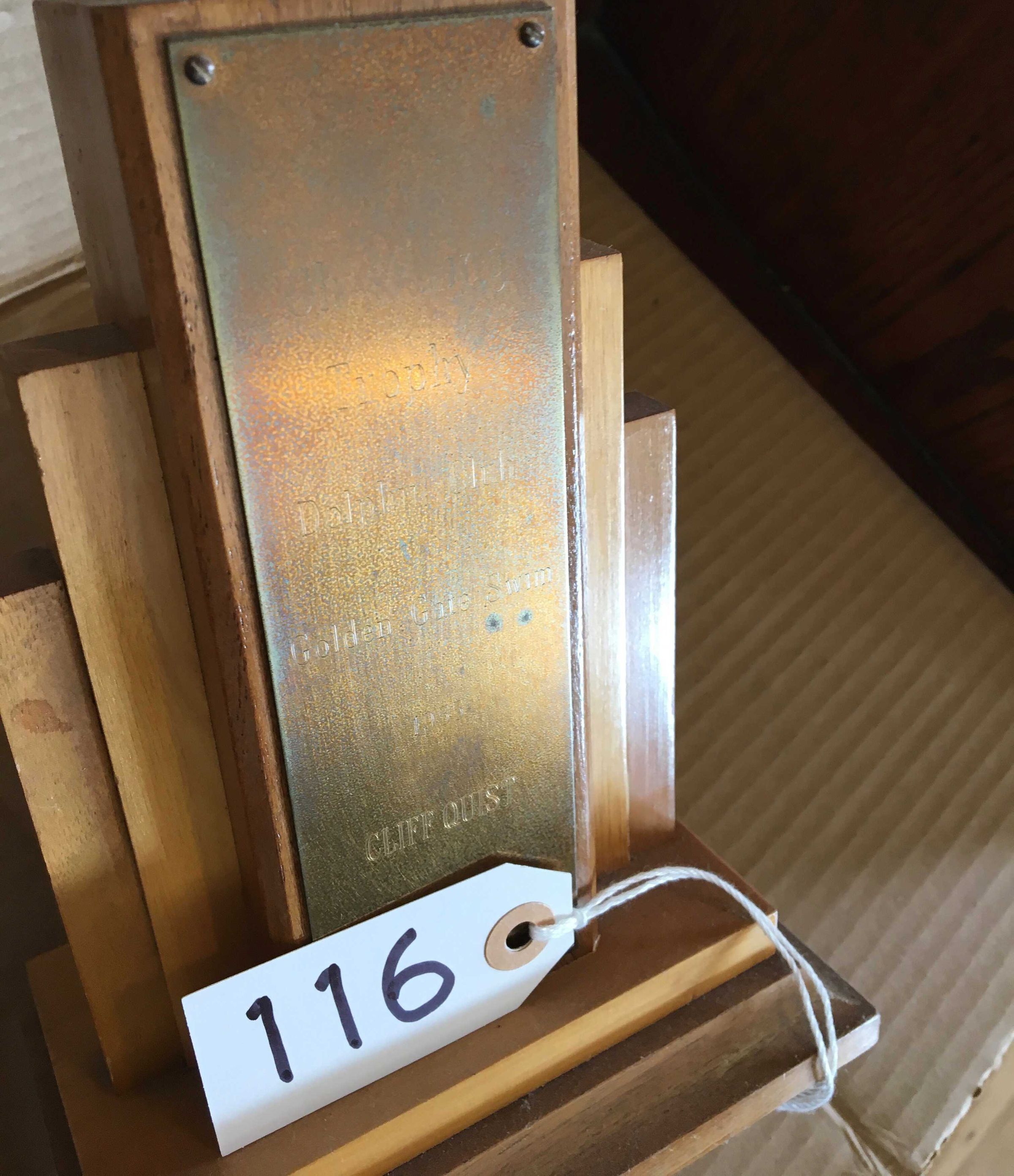 Text on plate: "Chet Wing -Trophy - Dolphin Club - Golden Gate Swim 1955 - Cliff Quist"