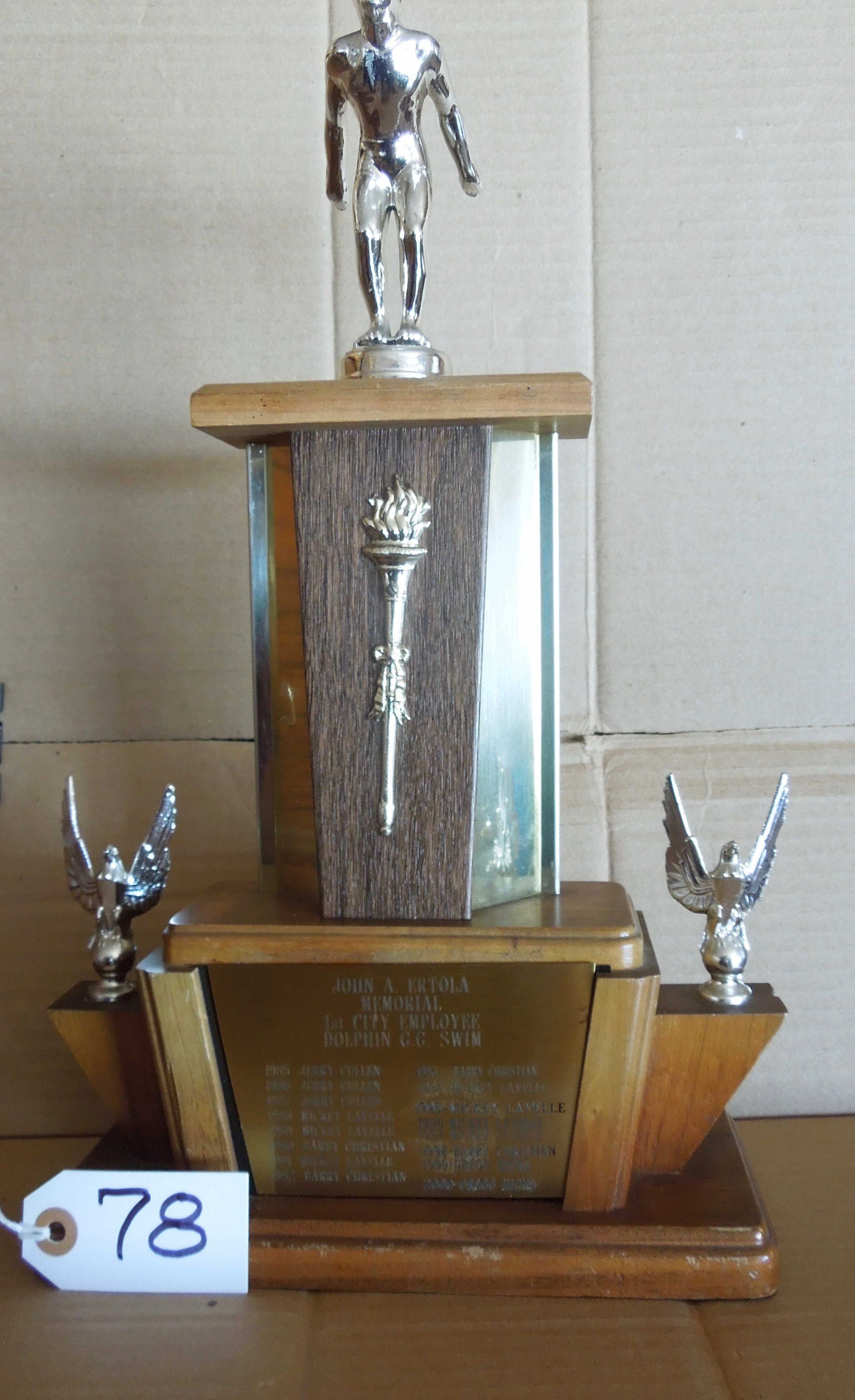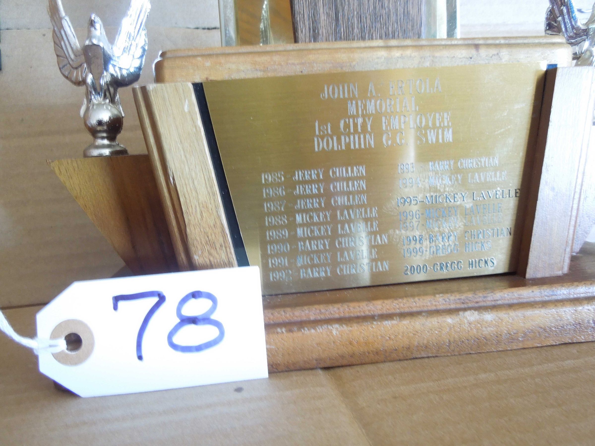 Brass plate #1 on lower front of base engraved: "John A. Ertola - Memorial -1st City Employee -Dolphin G.G. Swim" and lists names for 1985-2000.
