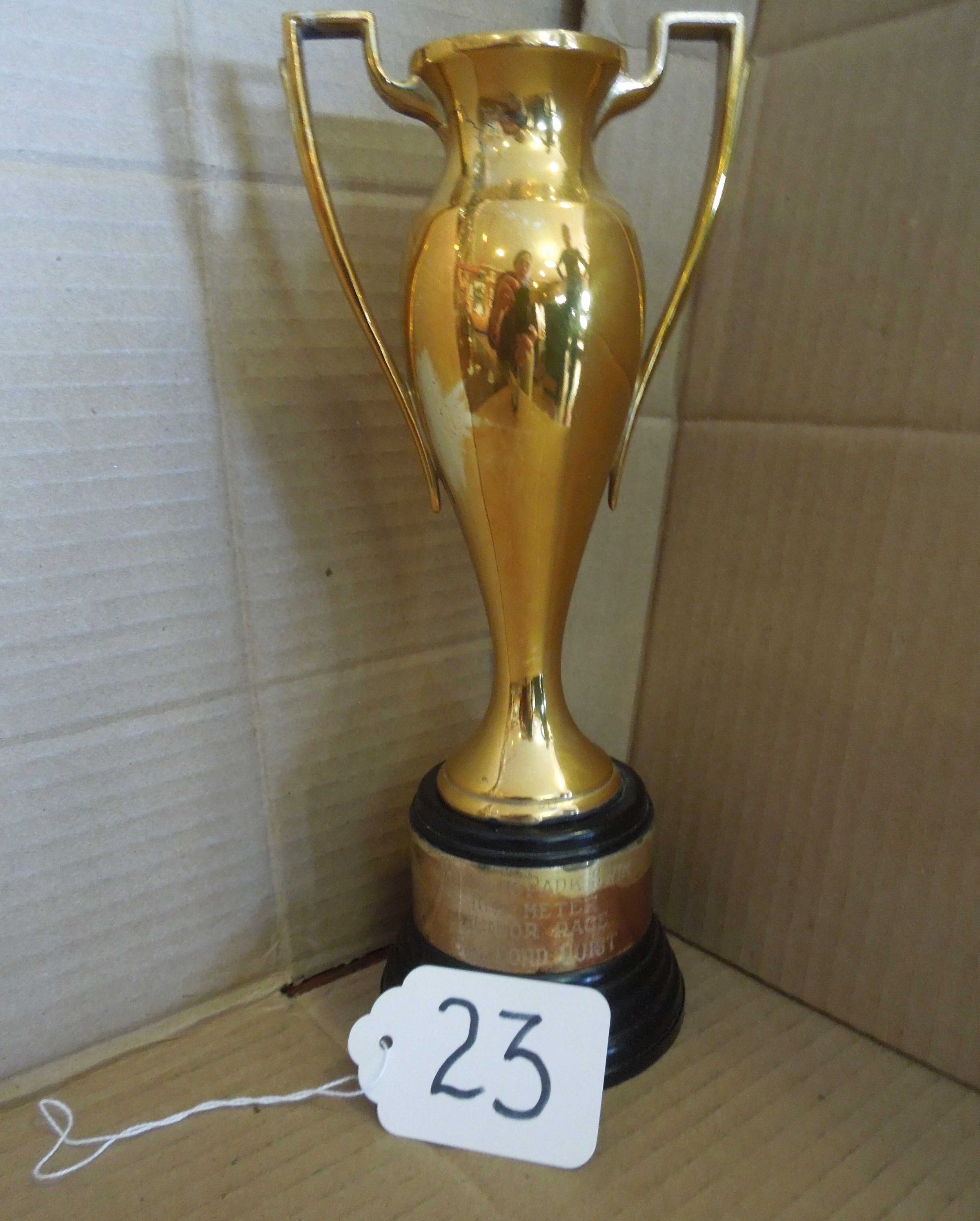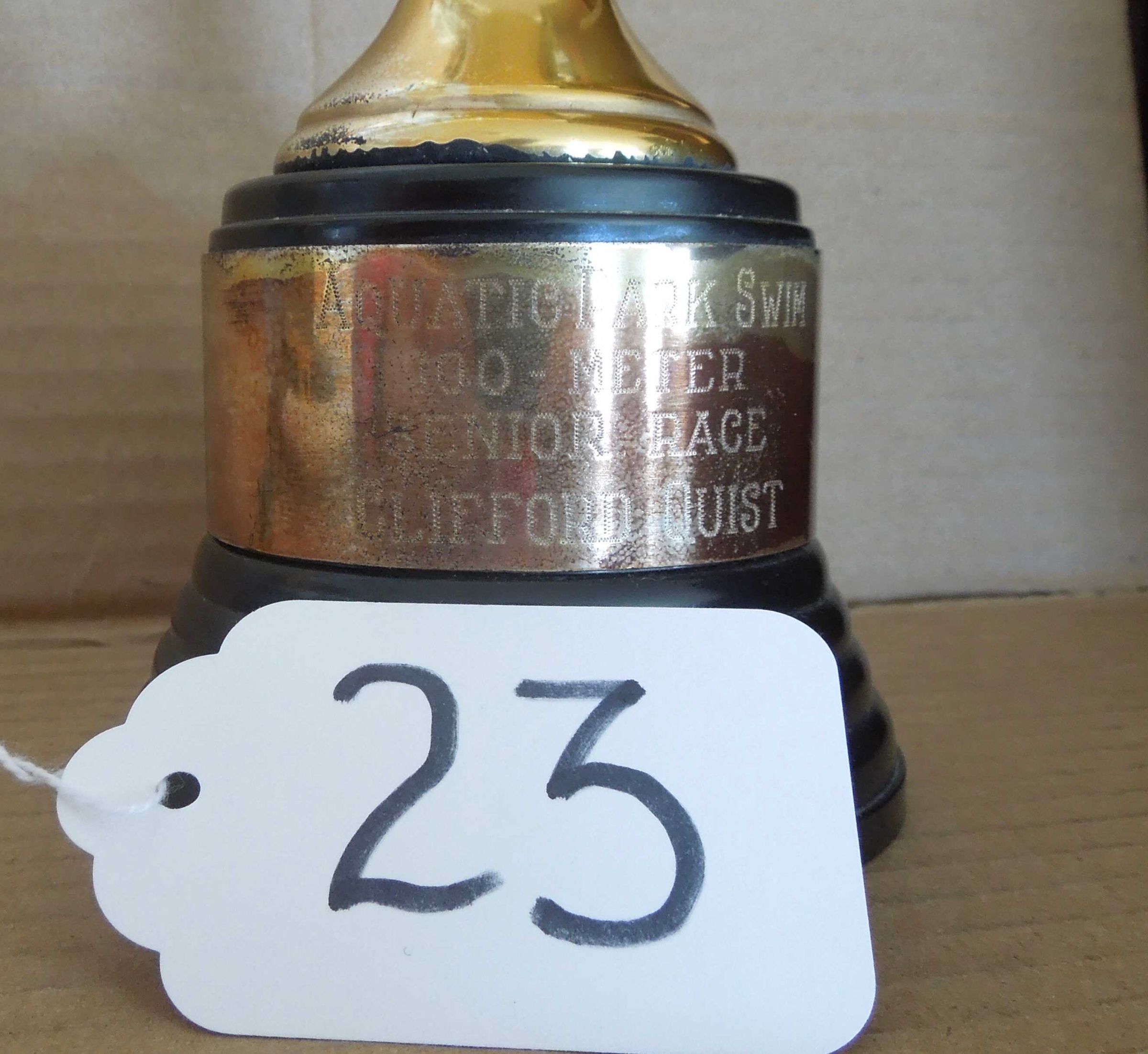 Gold colored two-handled cup trophy on black plastic base with metal band around base. Engraved on metal band: "Aquatic Park Swim - 100-Meter - Senior Race - Clifford Quist;" On bottom inside of base is name of maker: "