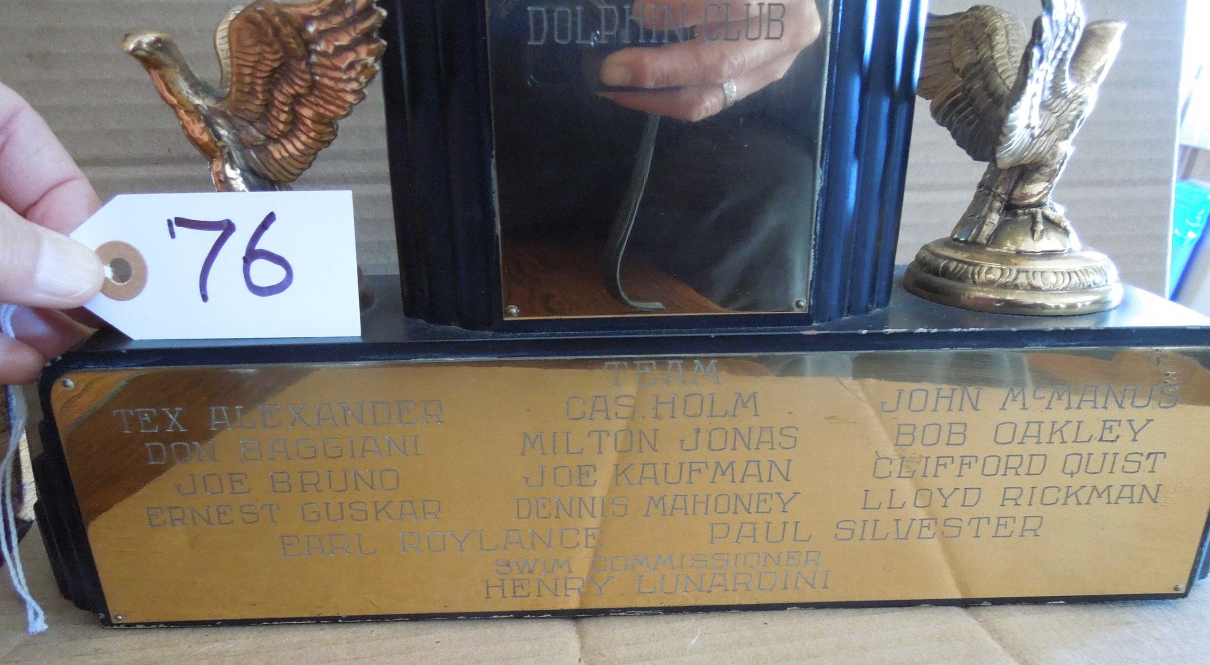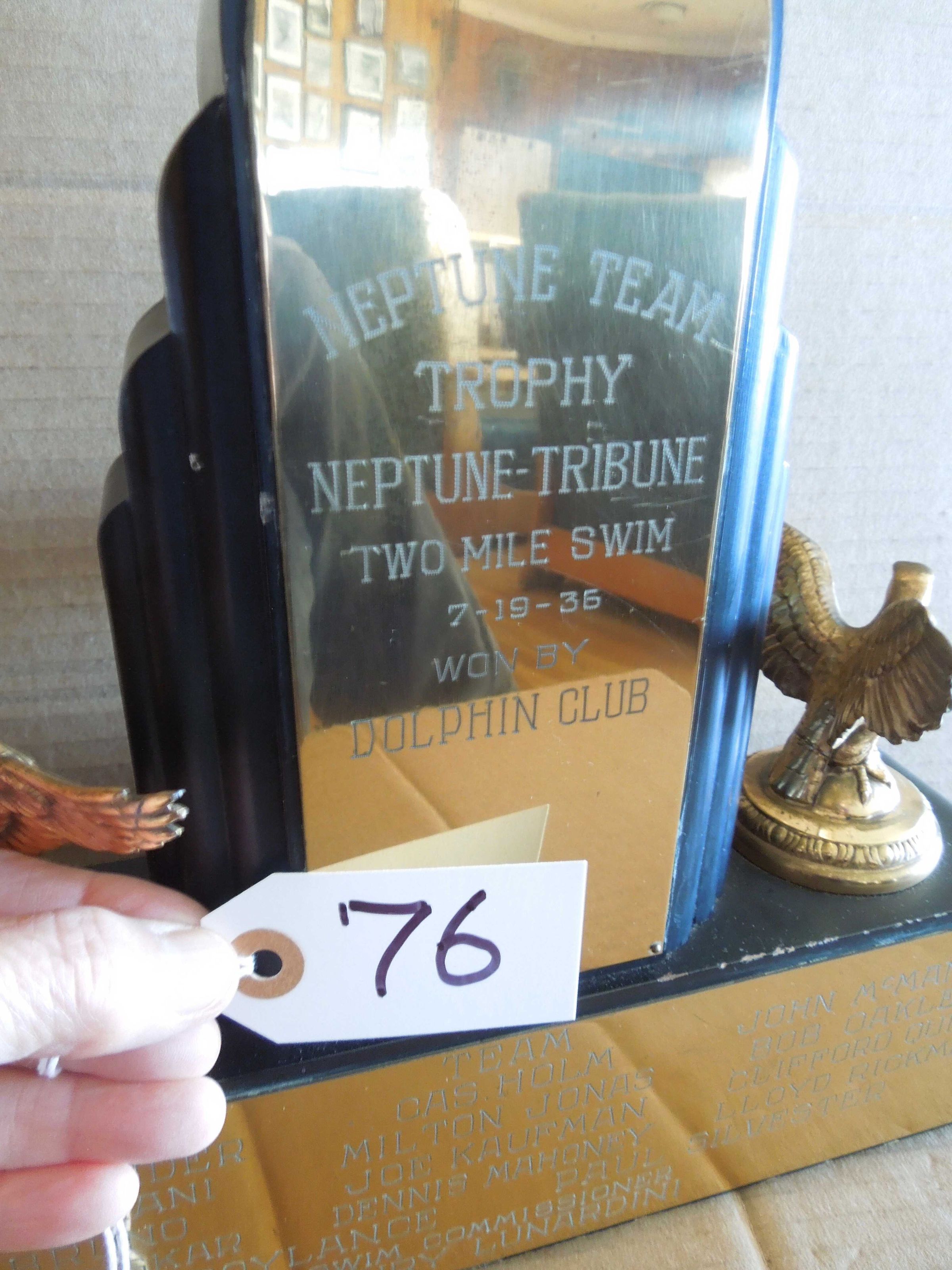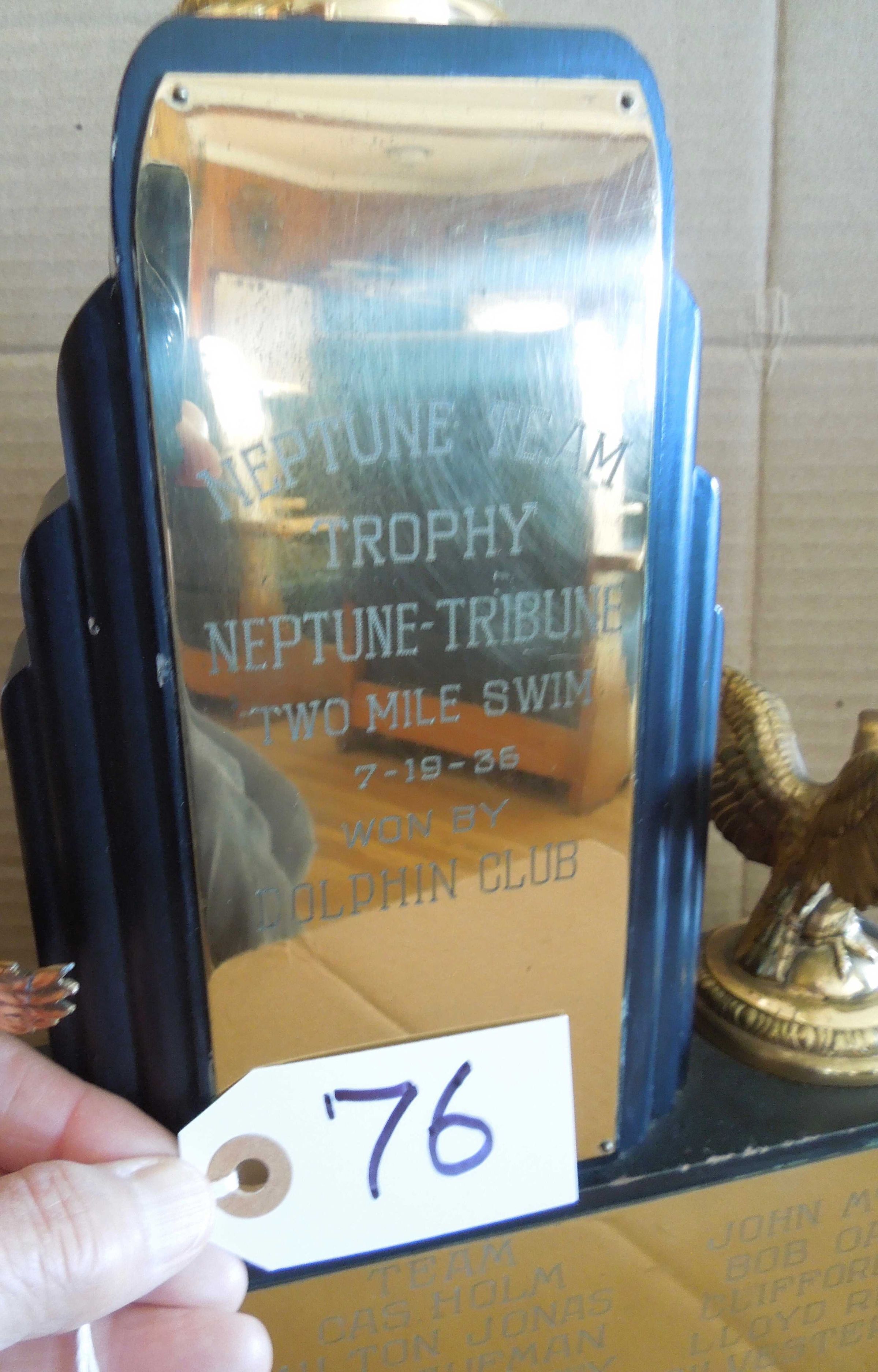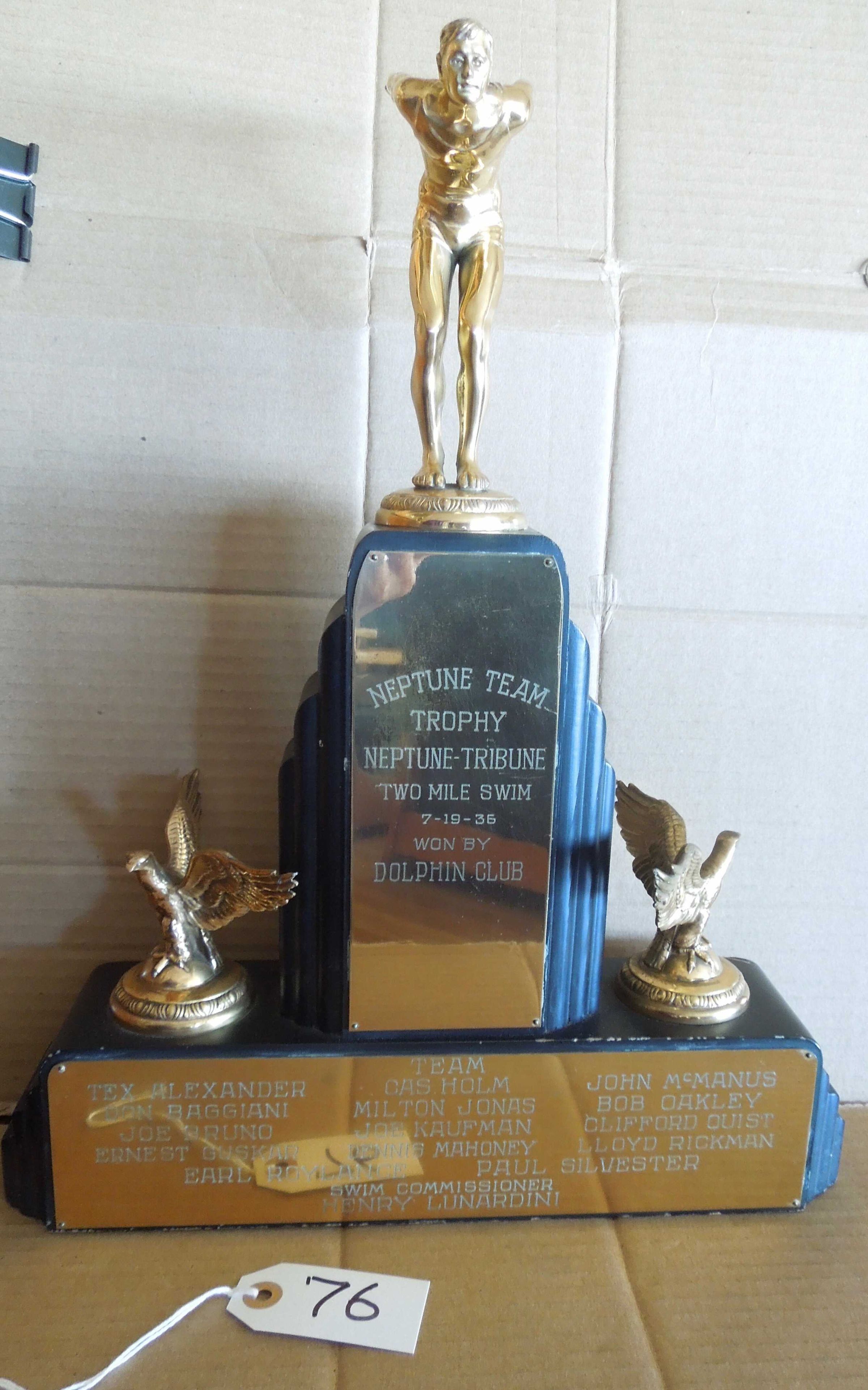 Swimmer figure on top of center pillar with brass plate engraved: "Neptune Team - Trophy - Neptune-Tribune - Two Mile Swim - 7/19/36 - Won By - Dolphin Club" Rectangular wood base under pillar with figure has eagles on each side. Engraved plate on front of base: "Team" - names of 14 swimmers (including, Don Baggiani, Joe Bruno, John McManus et al.) and "Swim Commissioner Henry Lunardini"Made/Created