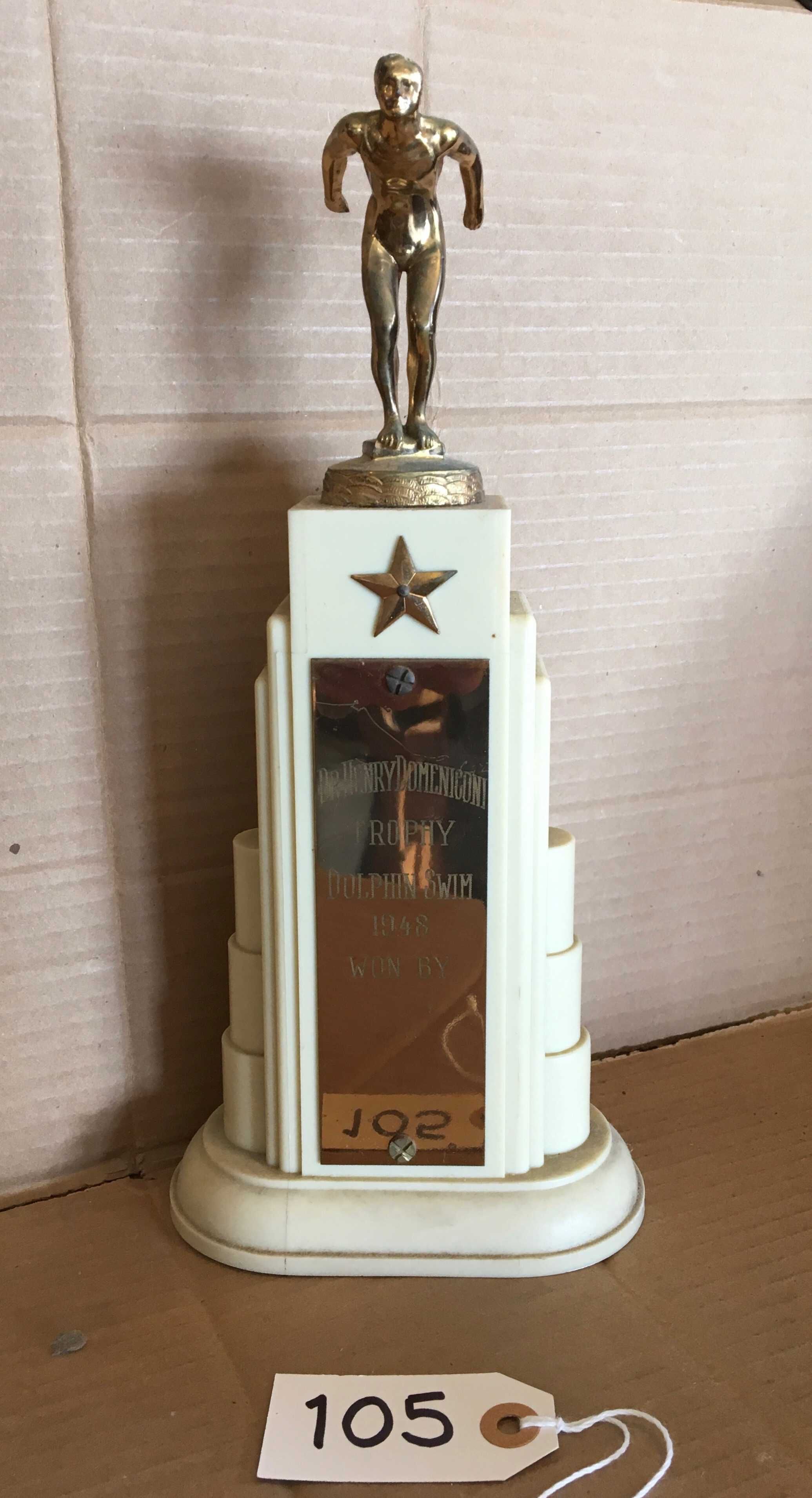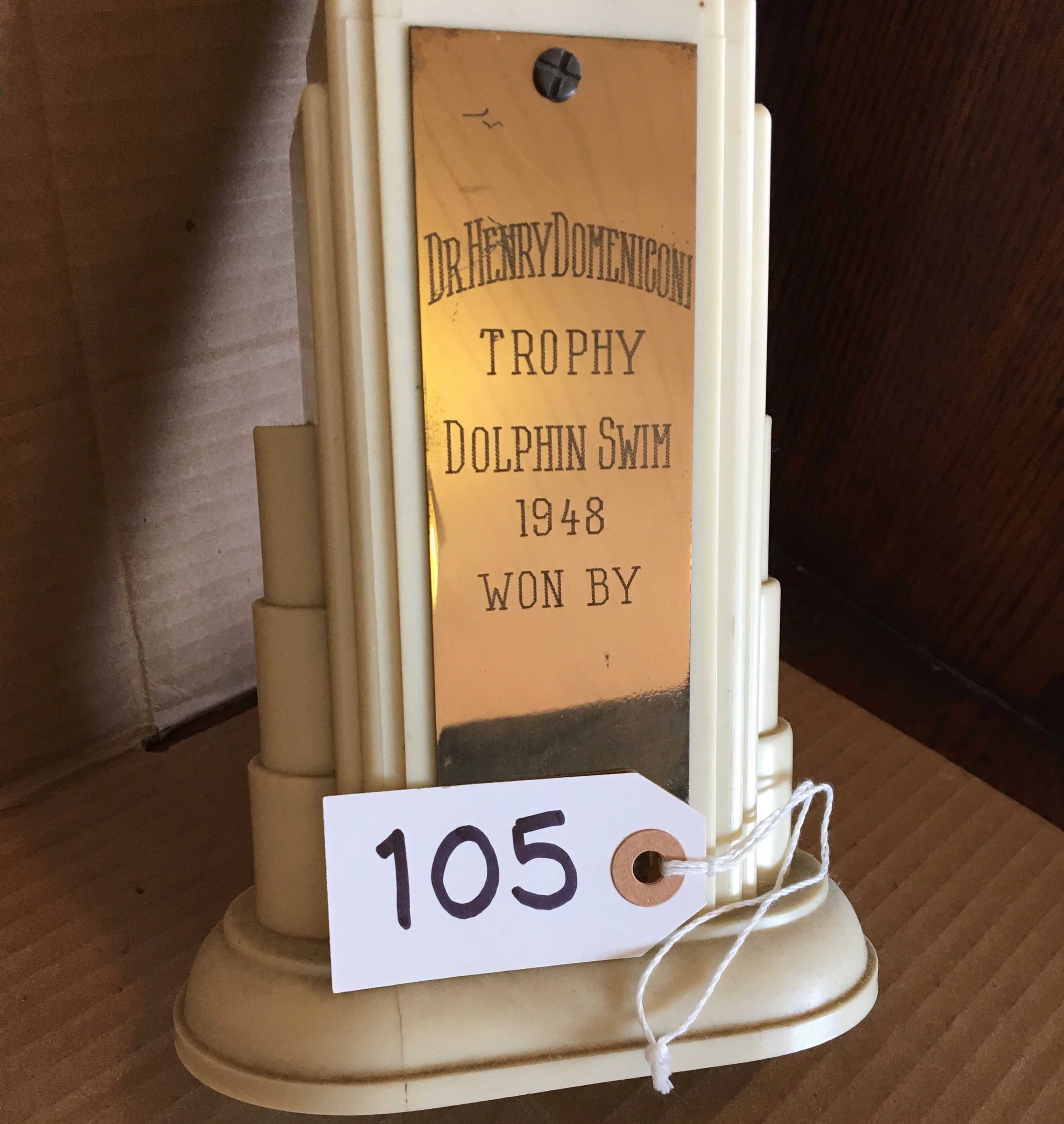 Large vertical brass plate engraved: "Dr. Henry Domeniconi - Trophy - Dolphin Swim - 1948 - Won By" (no winner name)Made/Created