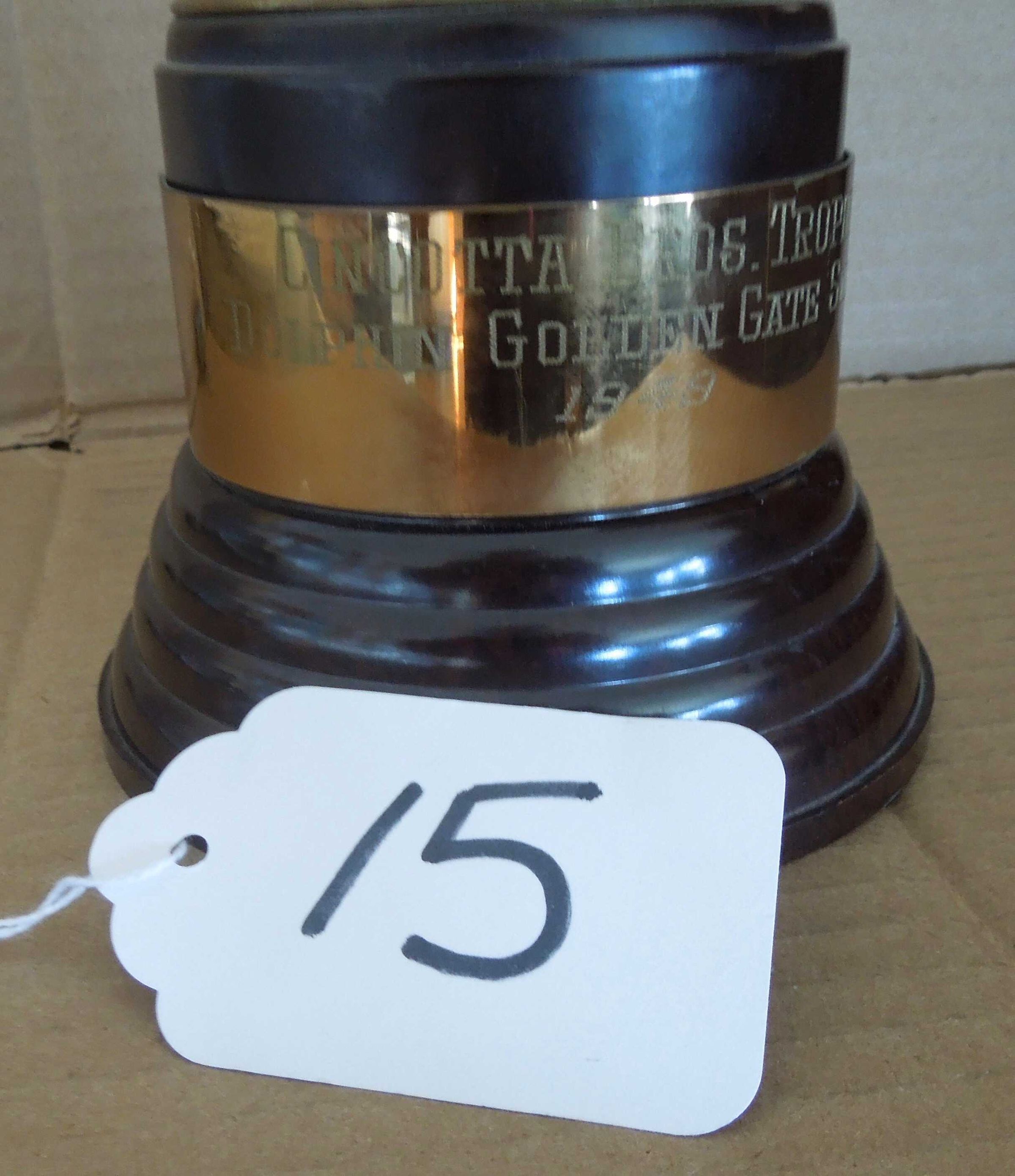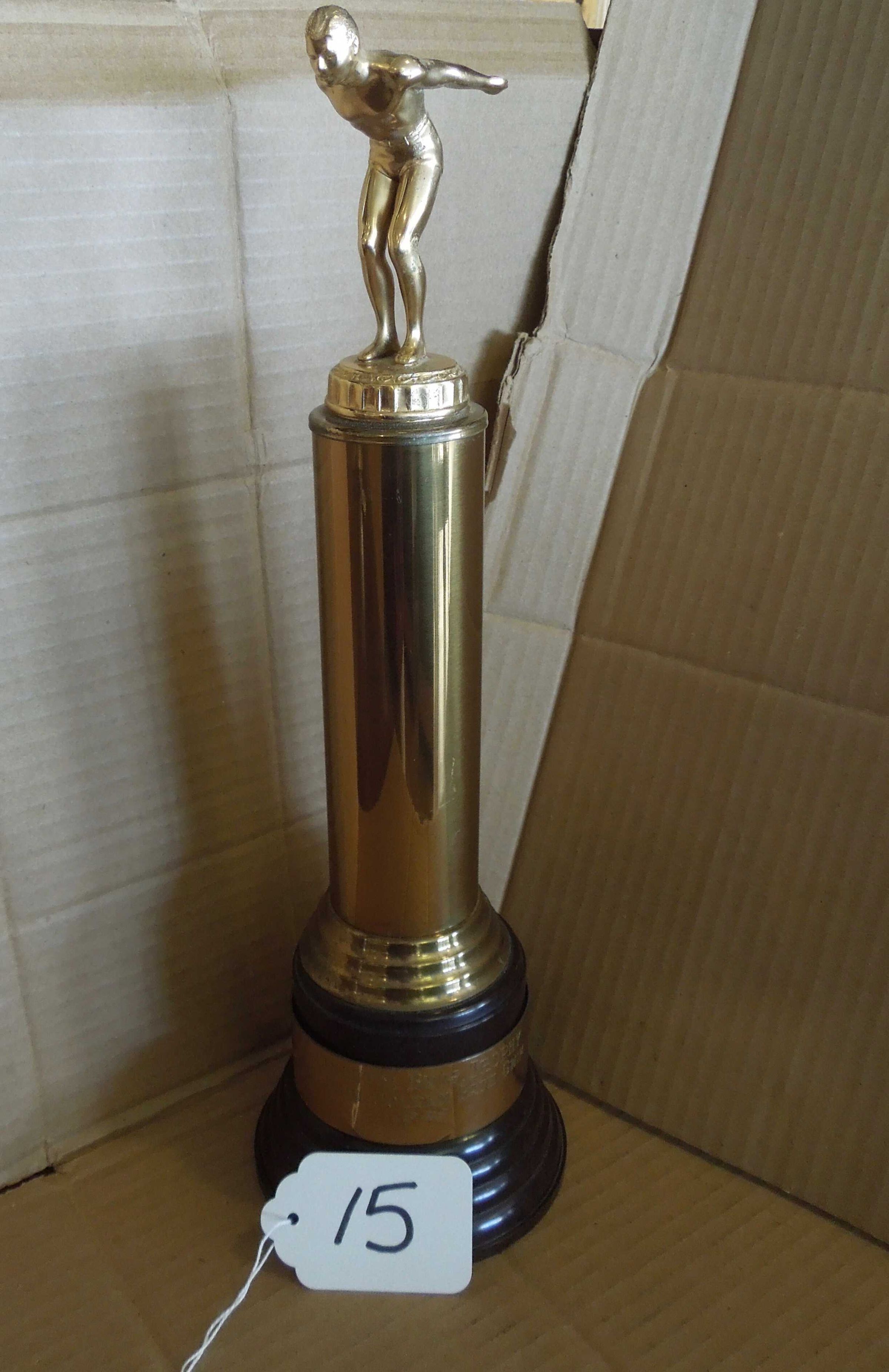 Gold color metal column trophy with male swimmer on top in ready to dive position; column sits on gold color base with two black bands; Engraved on base: "Cincotta Bros. Trophy - Dolphin Golden Gate Swim - 1949"