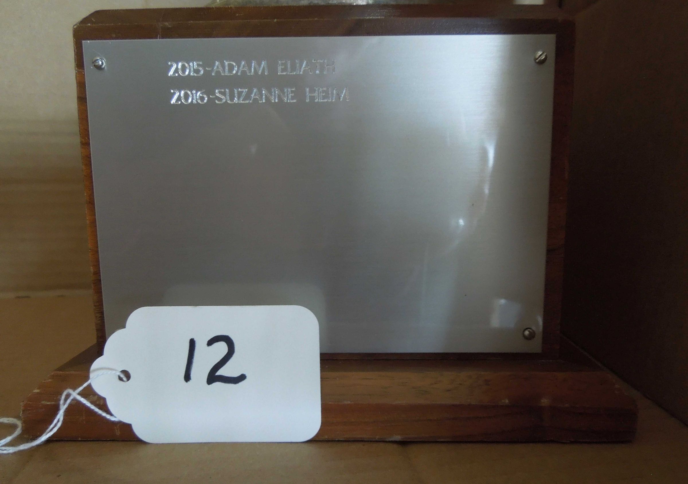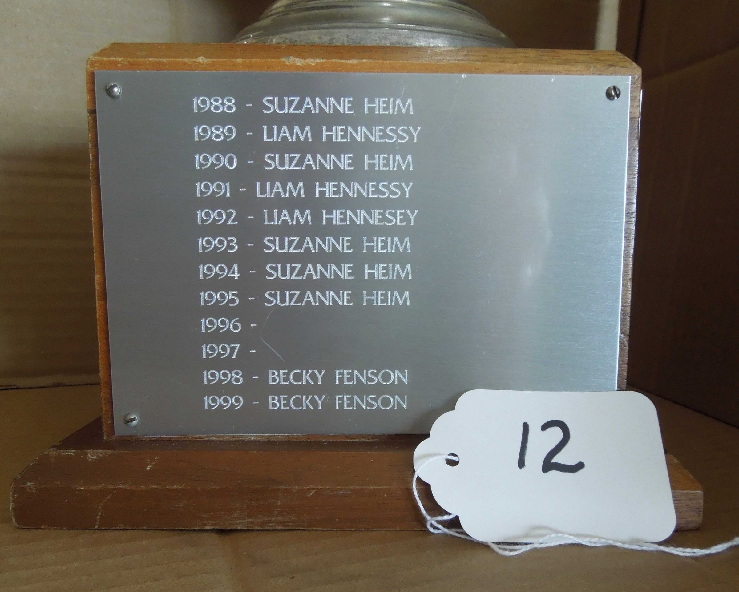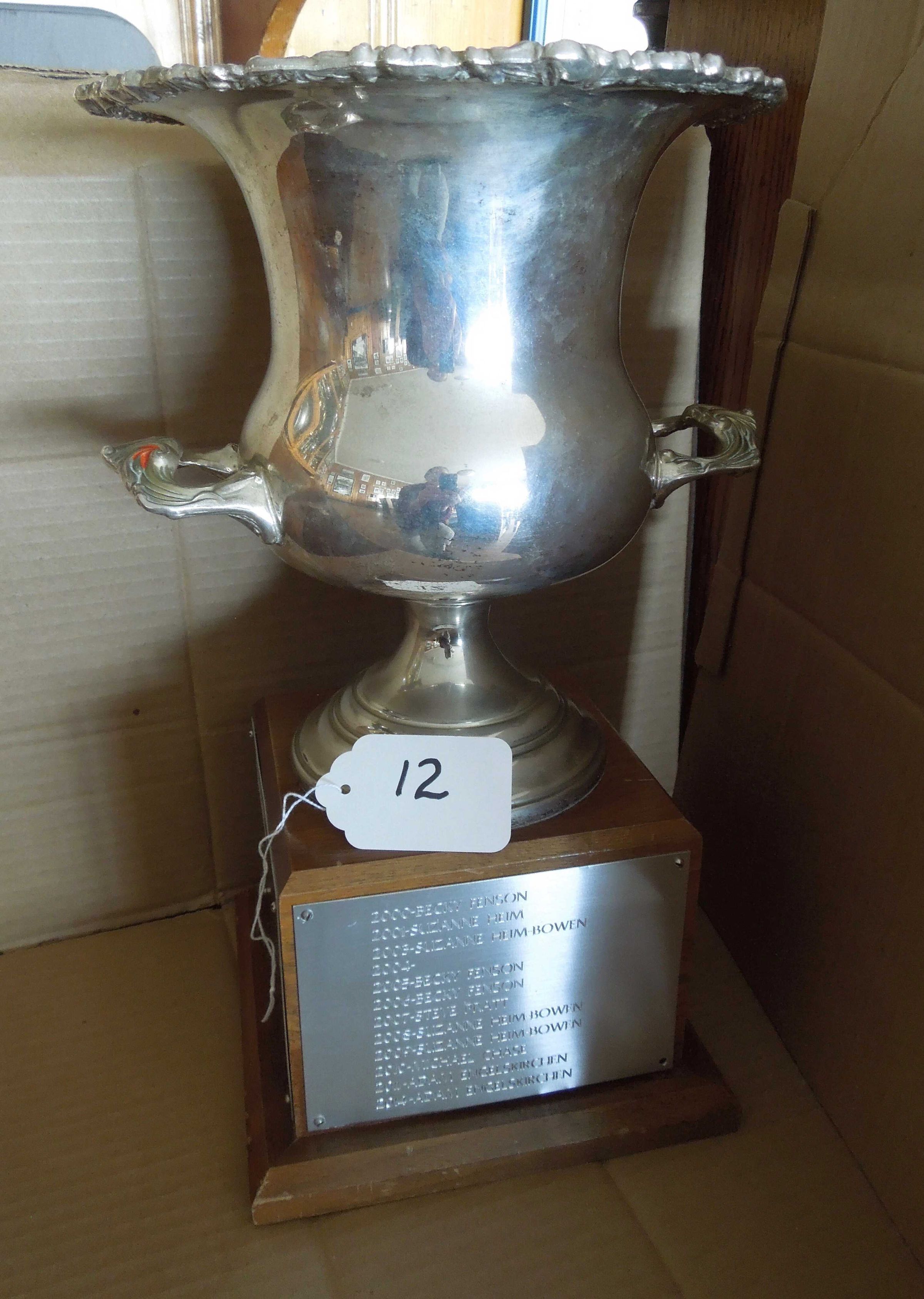 2 handled silvertone engraved cup on square wooden base with engraved silver plates on 3 sides; metal plate on front: "New Years Day Alcatraz Swim"; metal plates on sides of base give names of winners since 1988; Trophy used 1988 to presentMade/Created