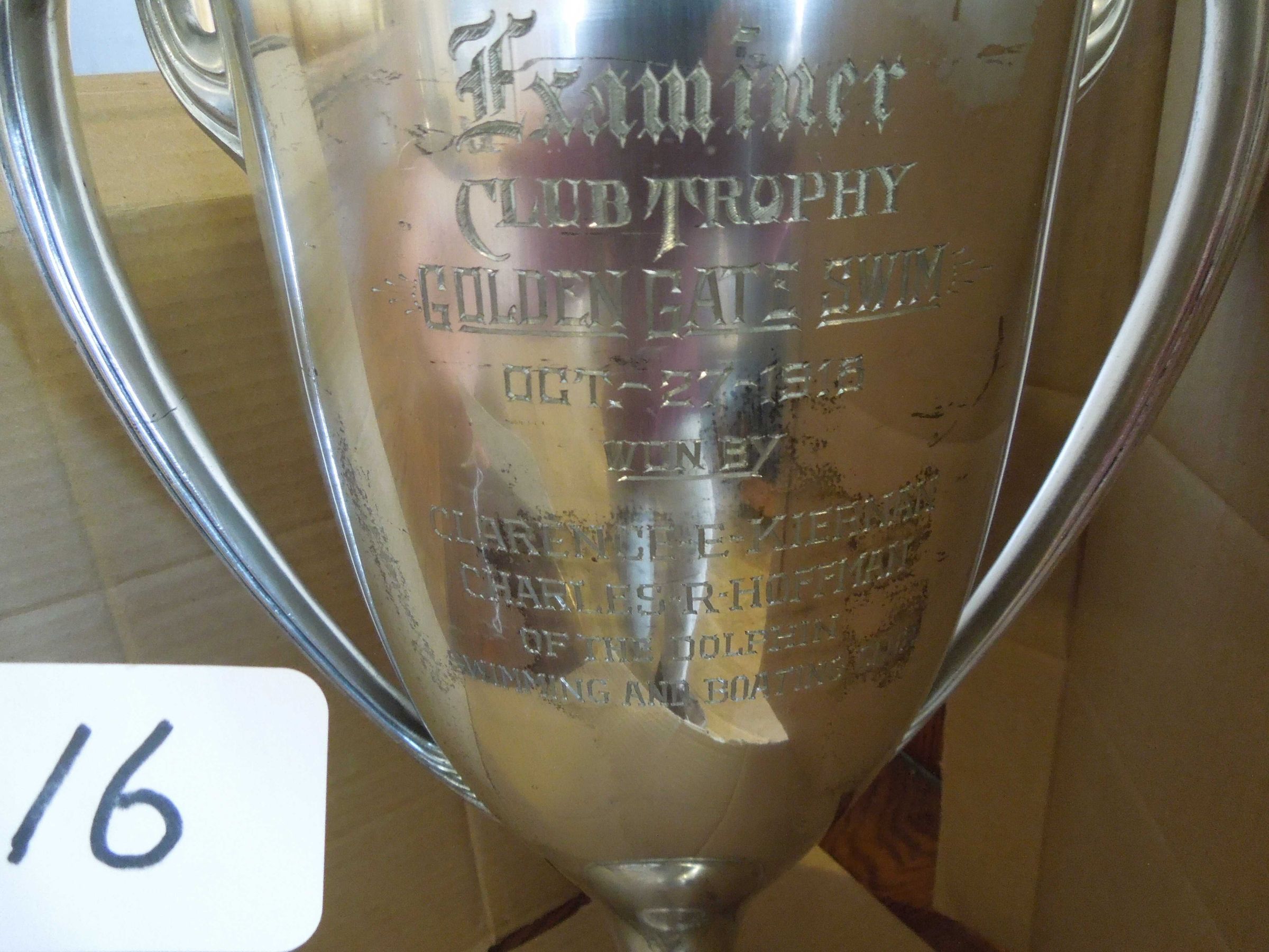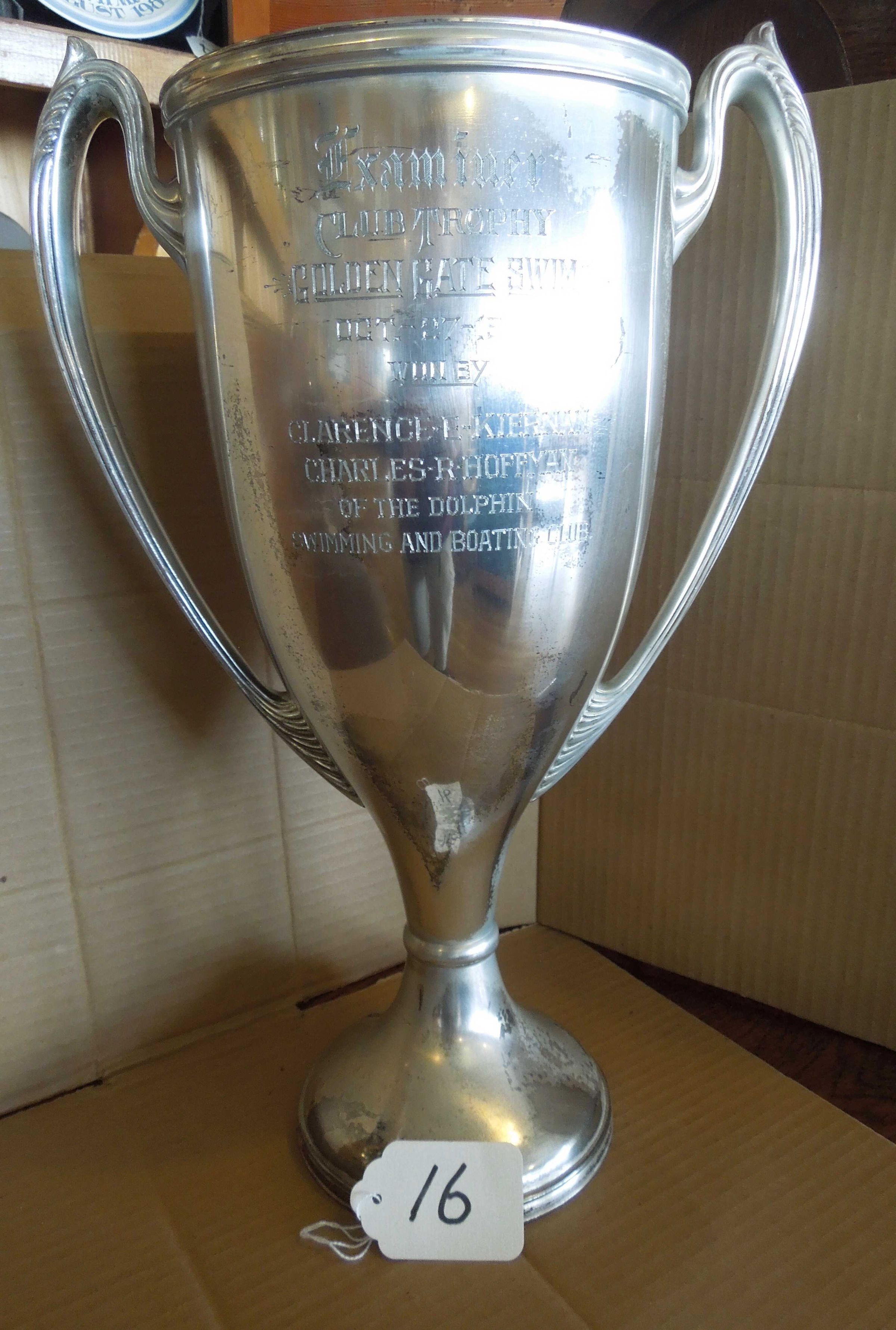 Two handled silver color cup trophy: engraved on front: "Examiner - Club Trophy - Golden Gate Swim - Oct. 27,1918 - Won by - Clarence E. Kieran - Charles R. Hoffman - of the Dolphin Swimming and Boating Club"