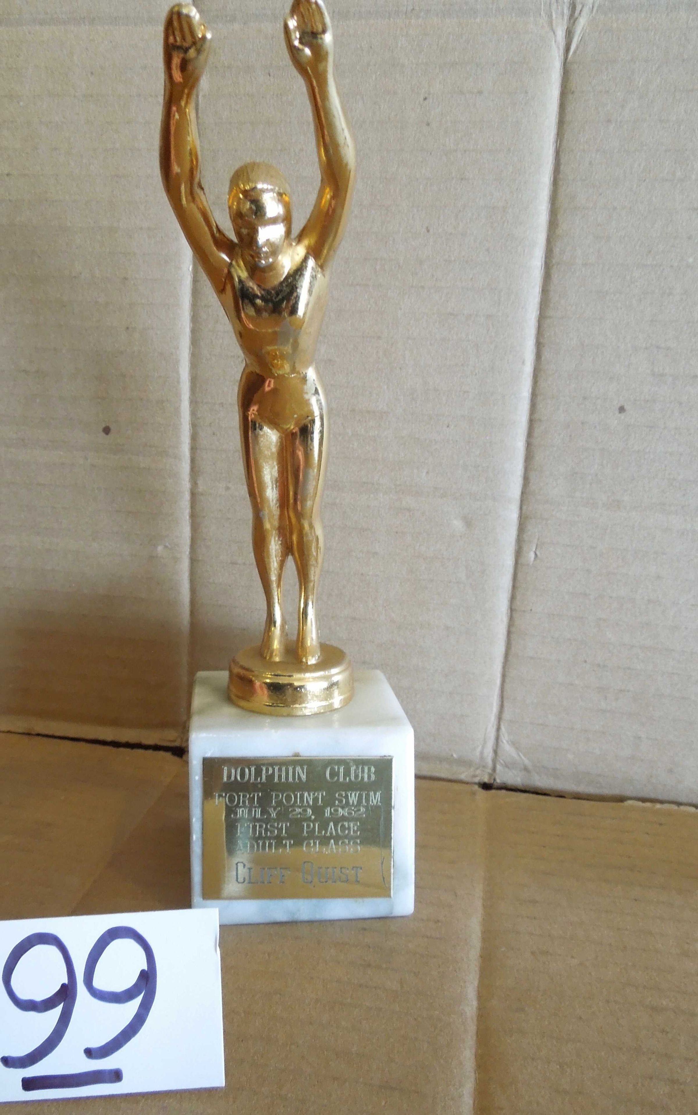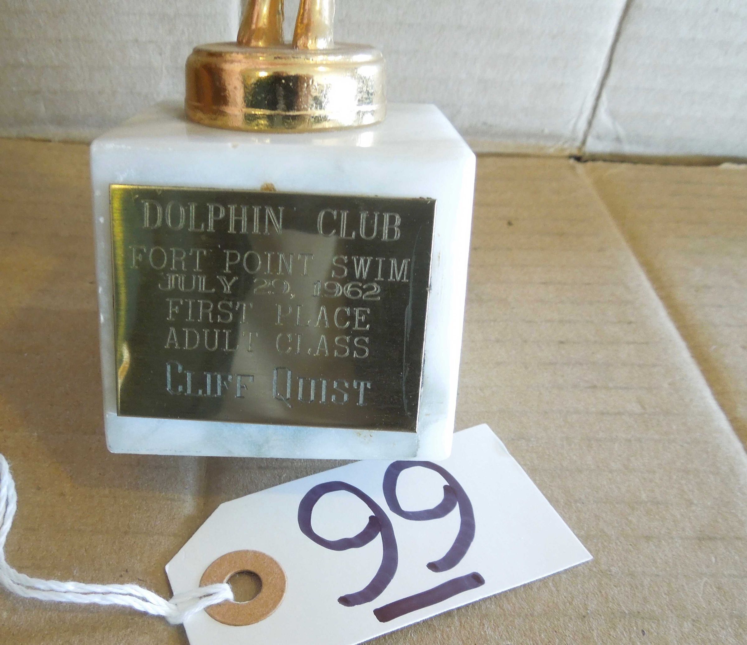 Brass plate on pedestal engraved: "Dolphin Club - Fort Point Swim - July 29, 1962 - First Place - Adult Class - Cliff Quist"Made/Created