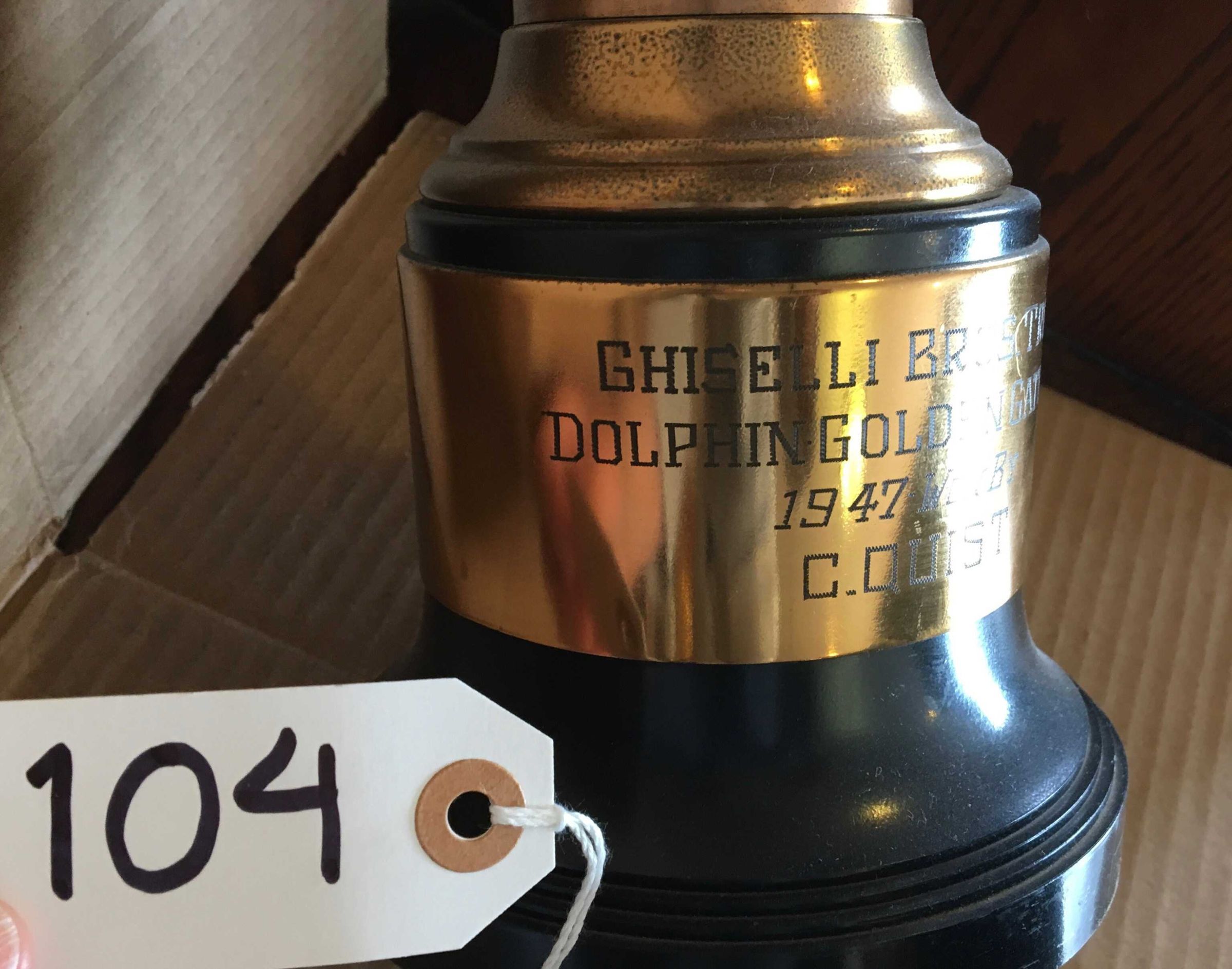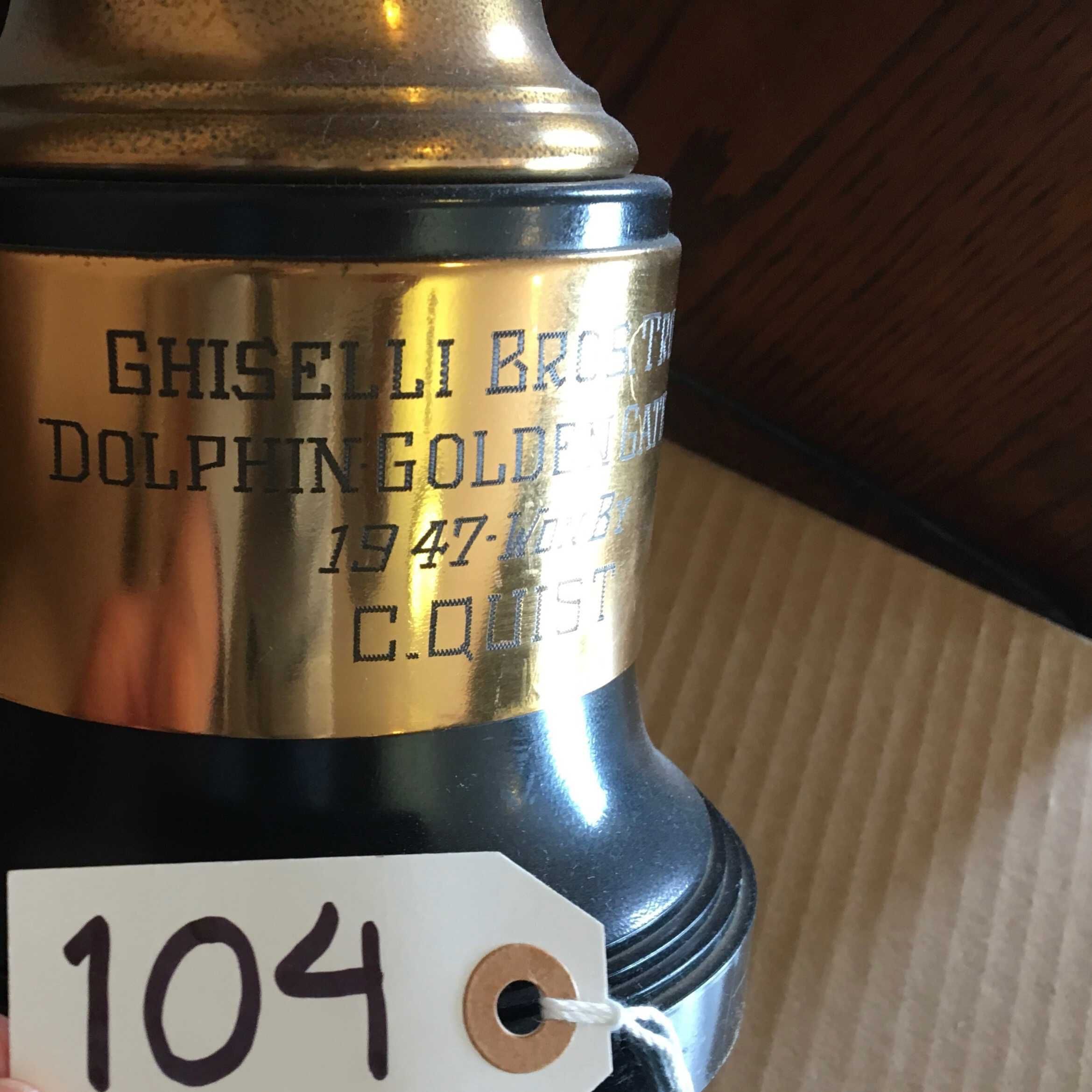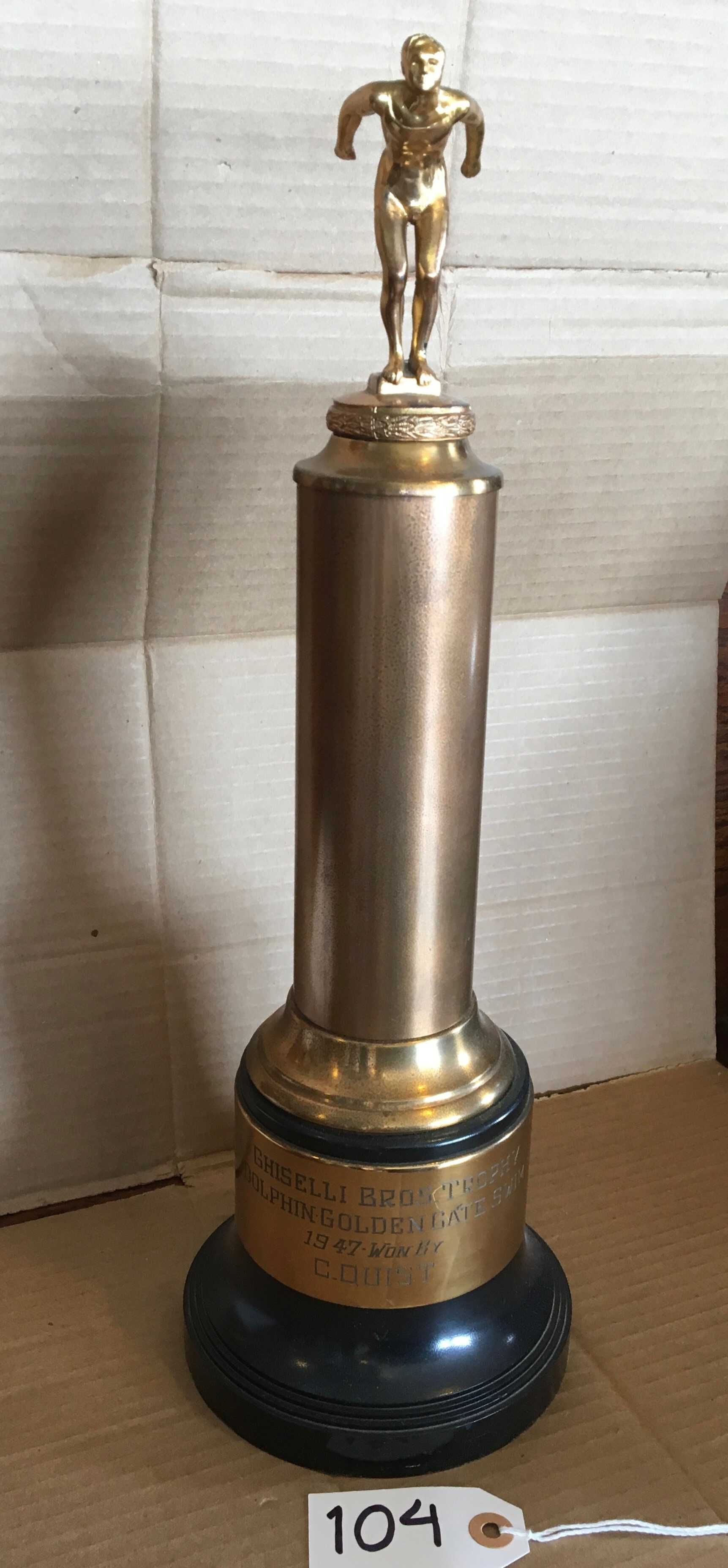 Brass plate above base engraved: "Ghiselli Bros. Trophy - Dolphin Golden Gate Swim - 1947 won by - C. Quist"