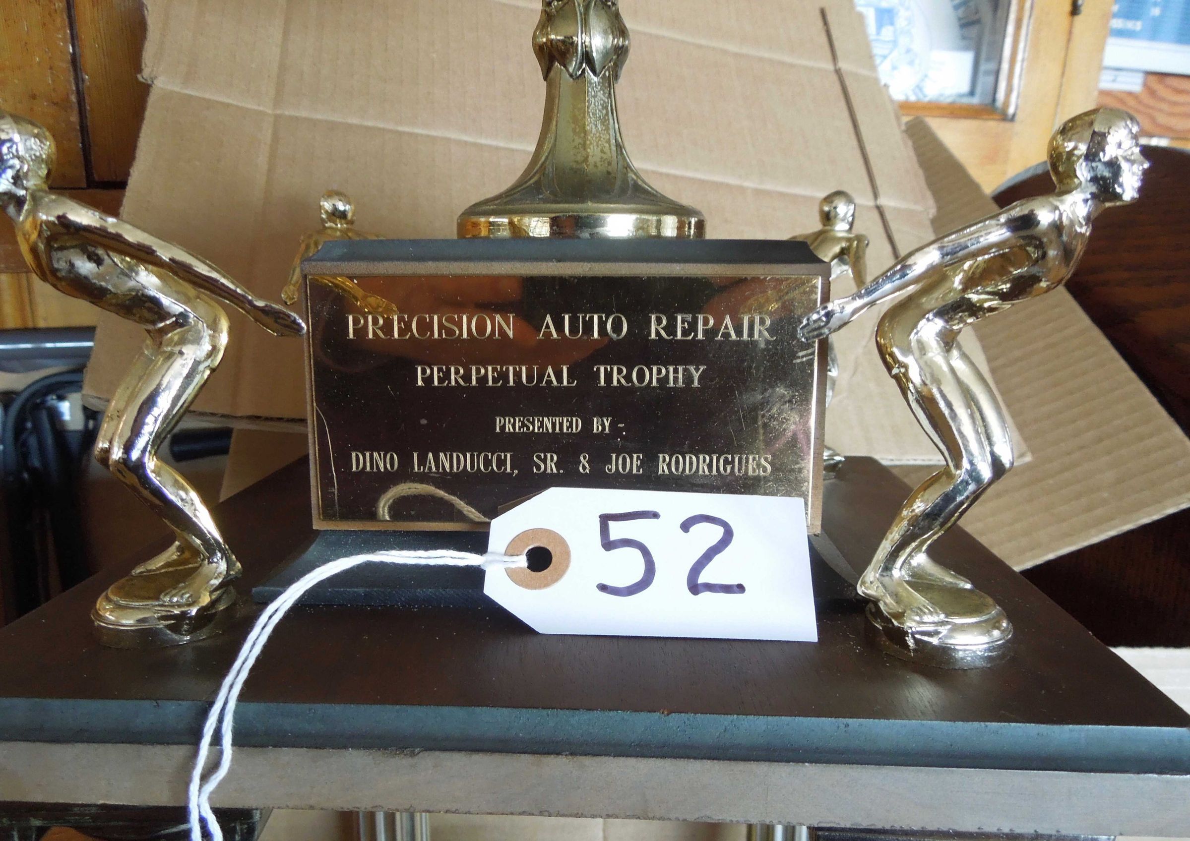 1.On front of middle wood base of cup: "Precision Auto Repair Perpetual Trophy, presented by Dino Landucci, Sr. & Joe Rodriguez"