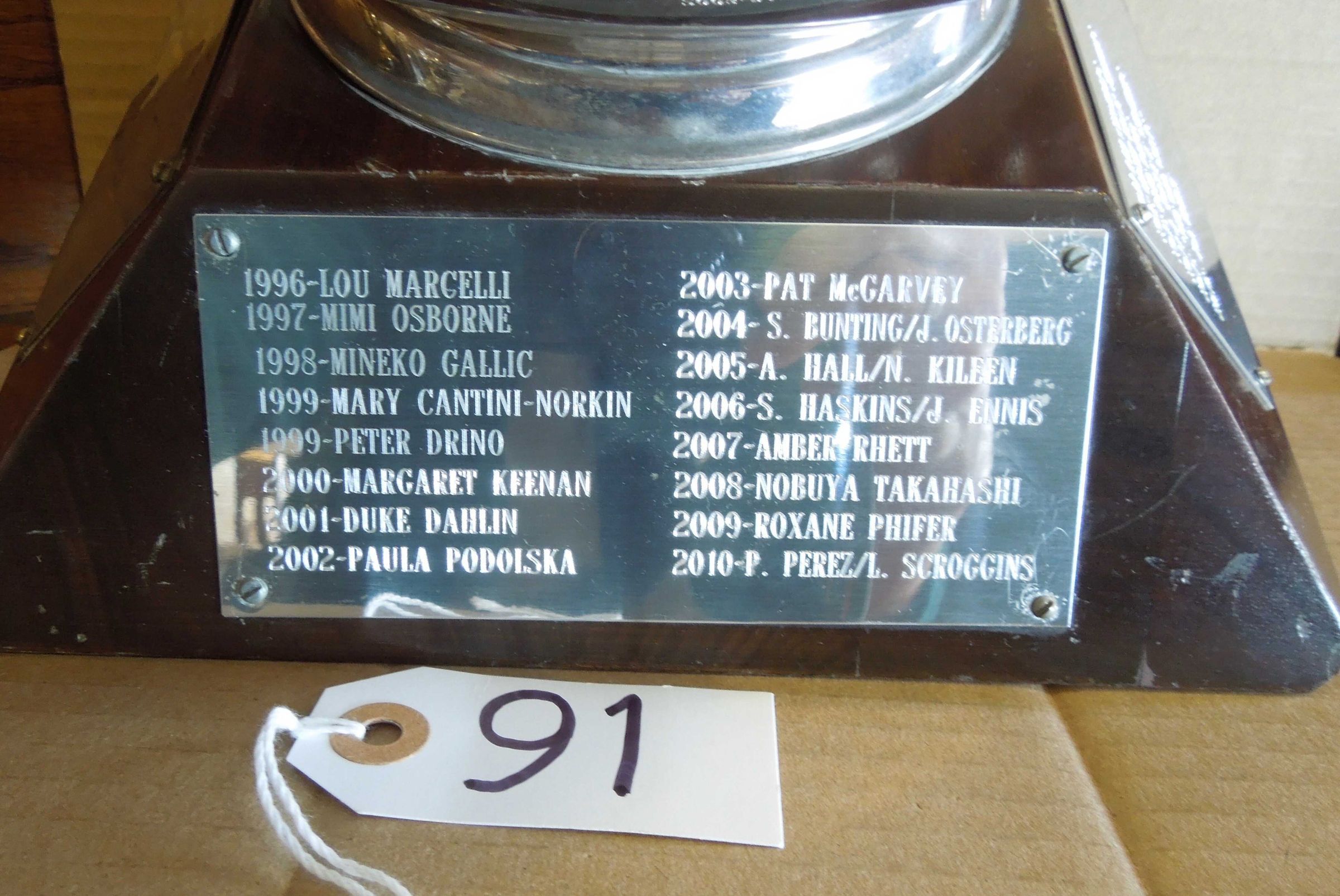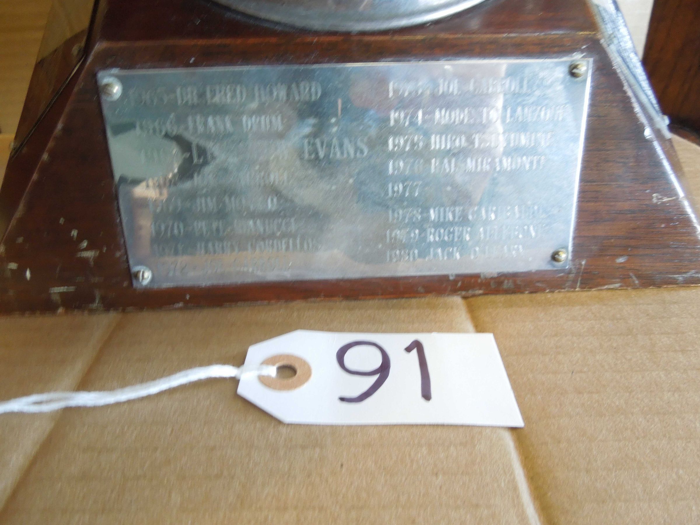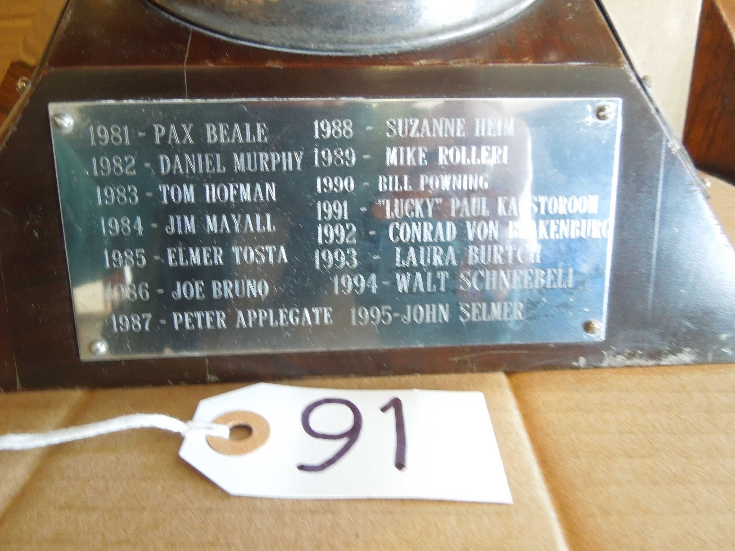 Inscription on bowl: "Bache & Co. Incorporated trophy -James E. Small Memorial Award - Most Inspirational Swimmer" On each plaque is year followed by name of awardee, from 1965 to present.Use