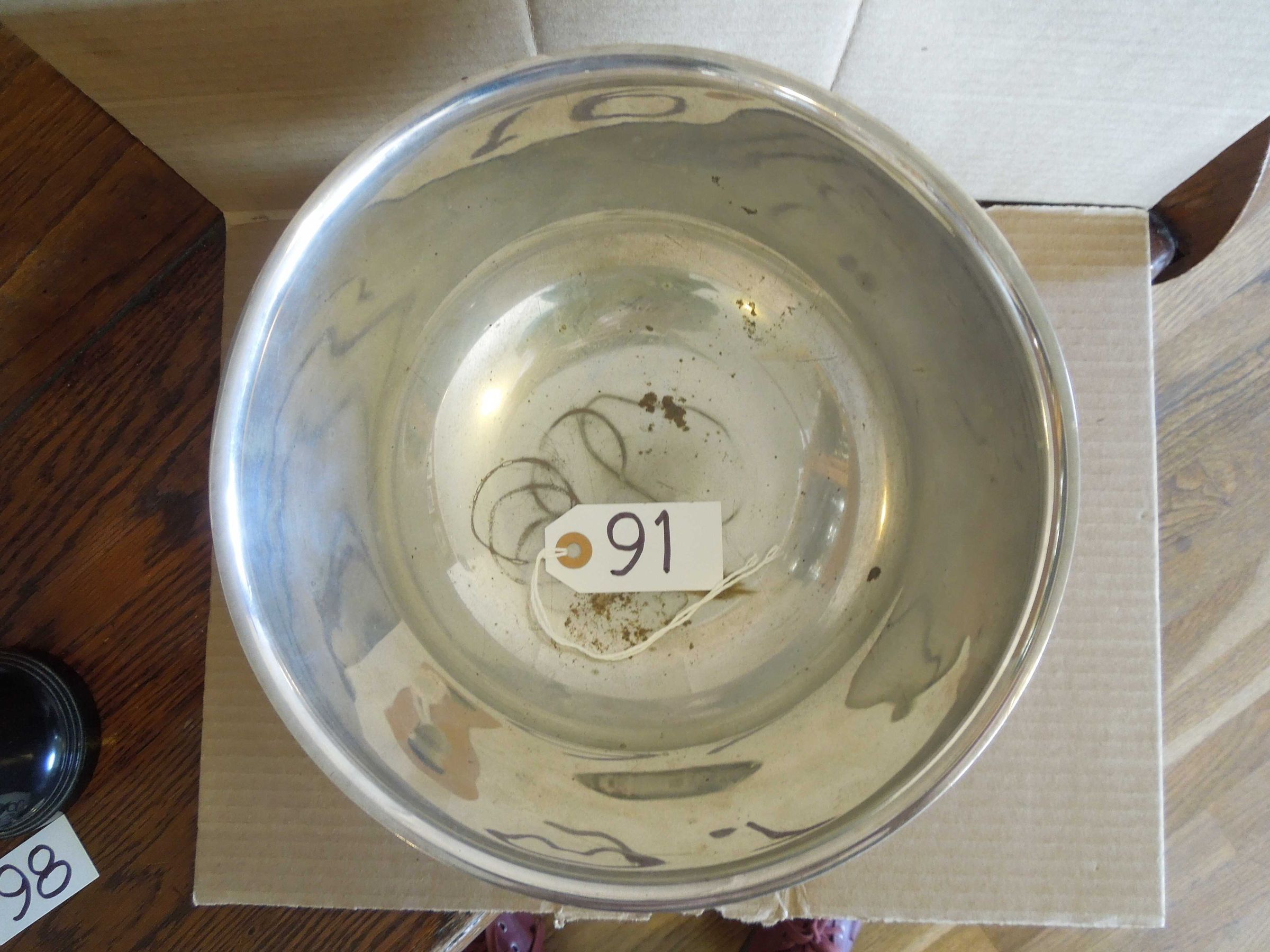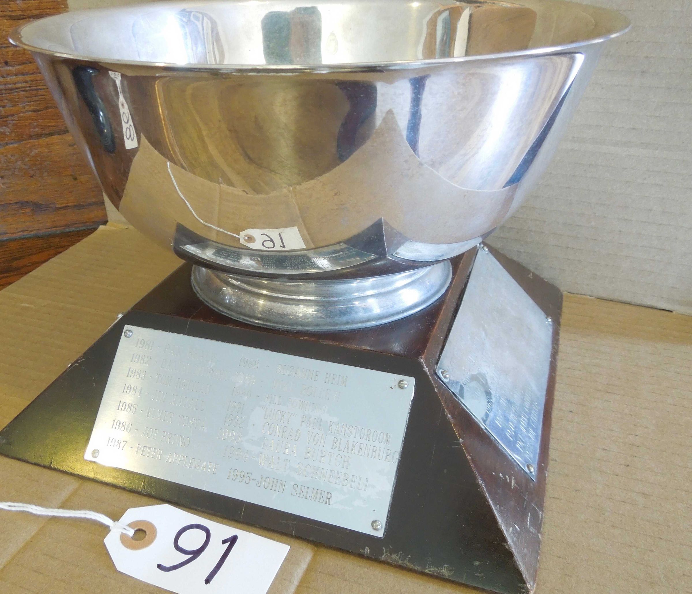 Silver bowl on trapezoidal wood base with four engraved silver plates on all each of four sides of base