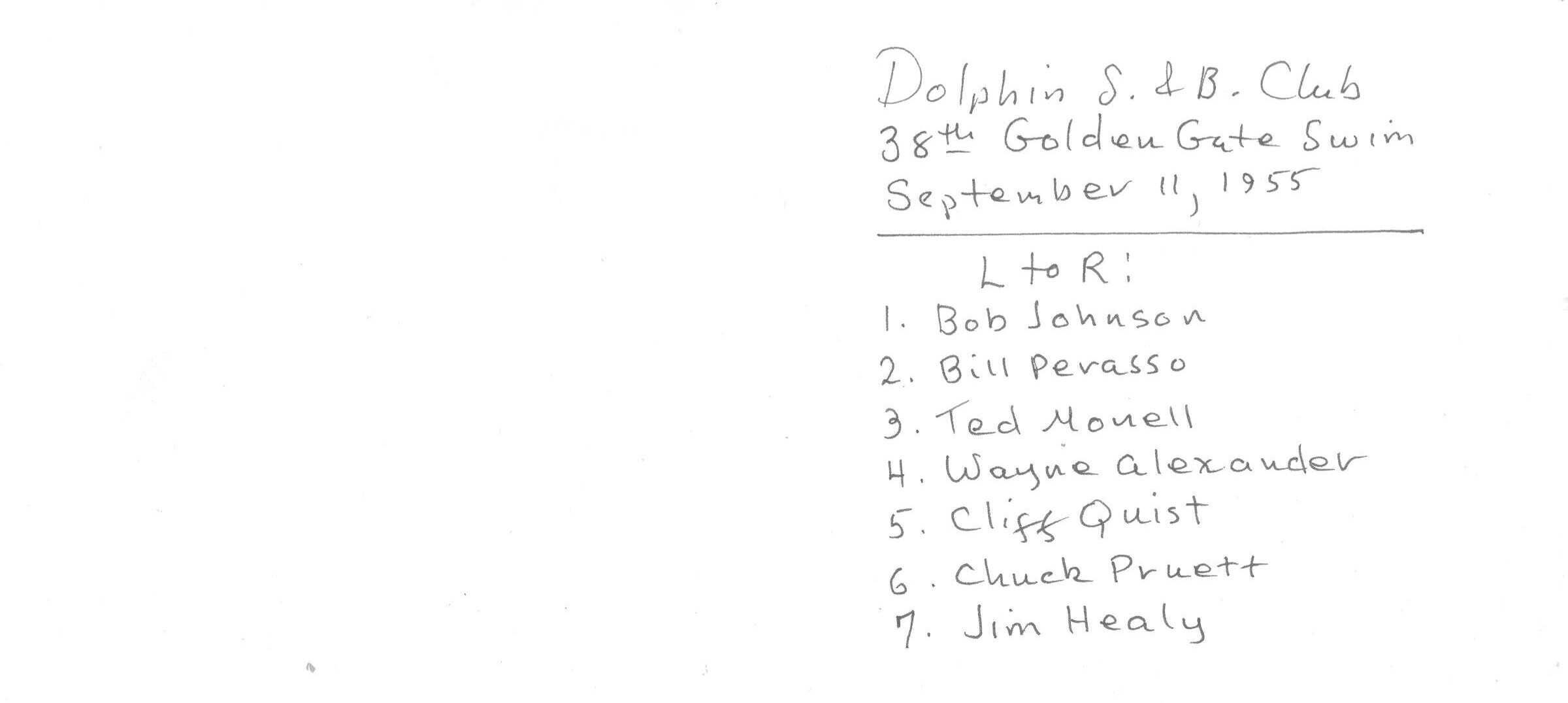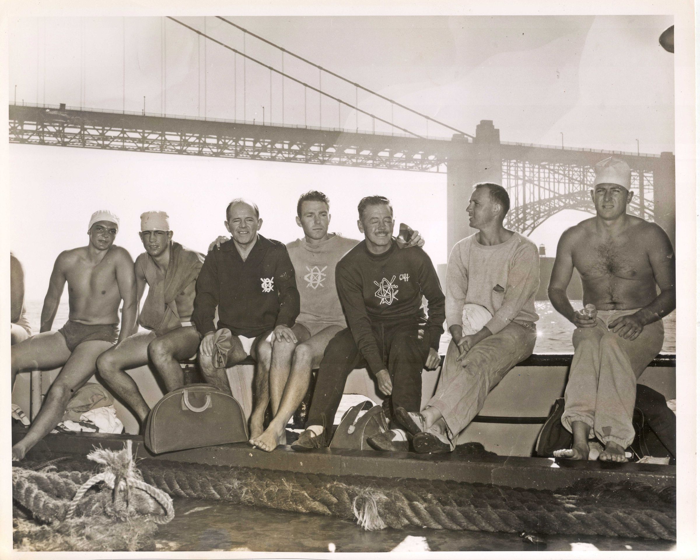 Golden Gate Swim 1955 - L to R: Johnson, Perasso, Monell, Alexander, Quist, Pruett, HealySubject Person or Organization