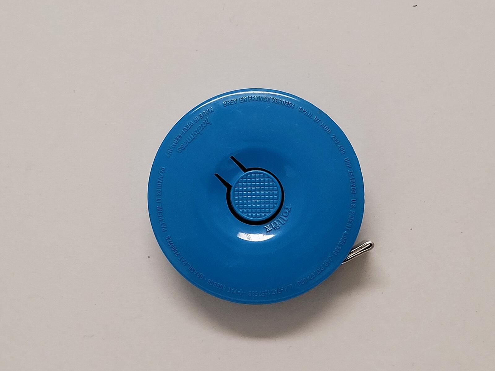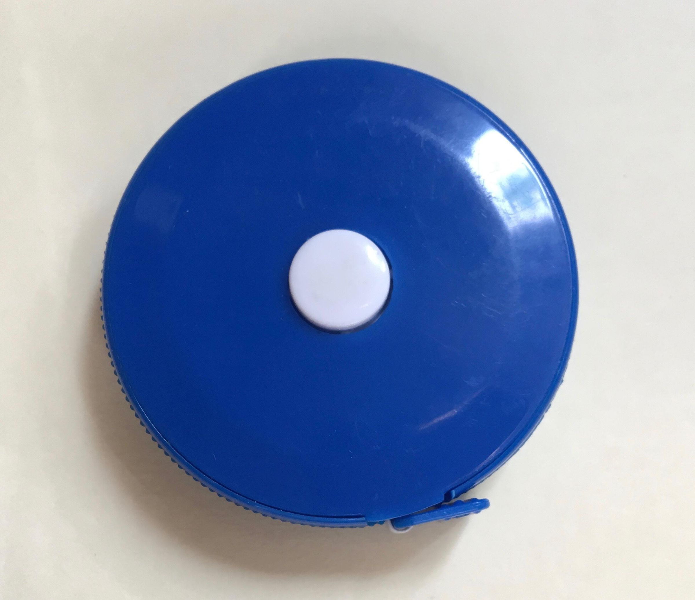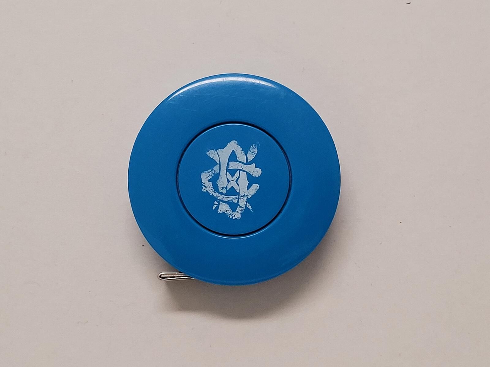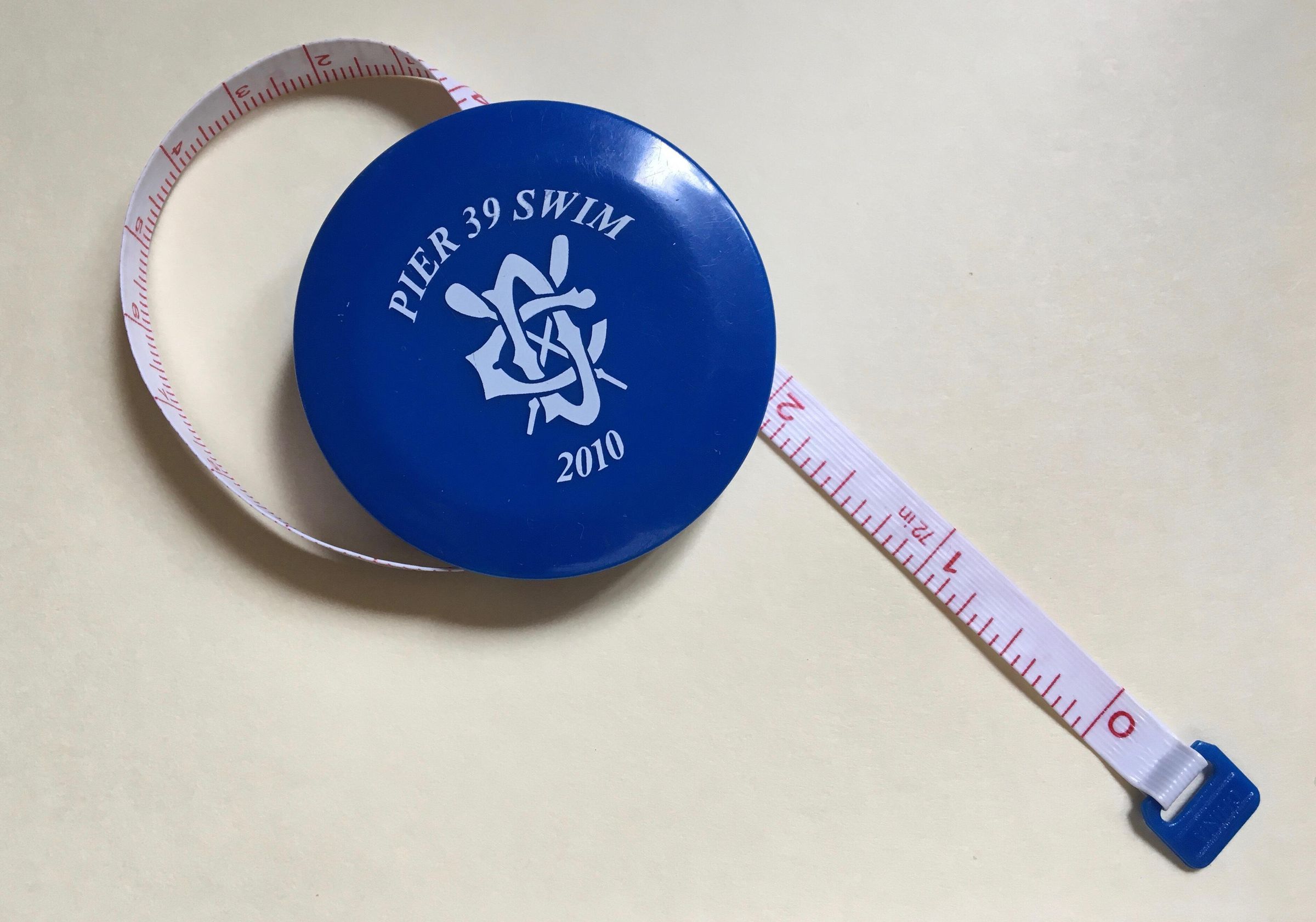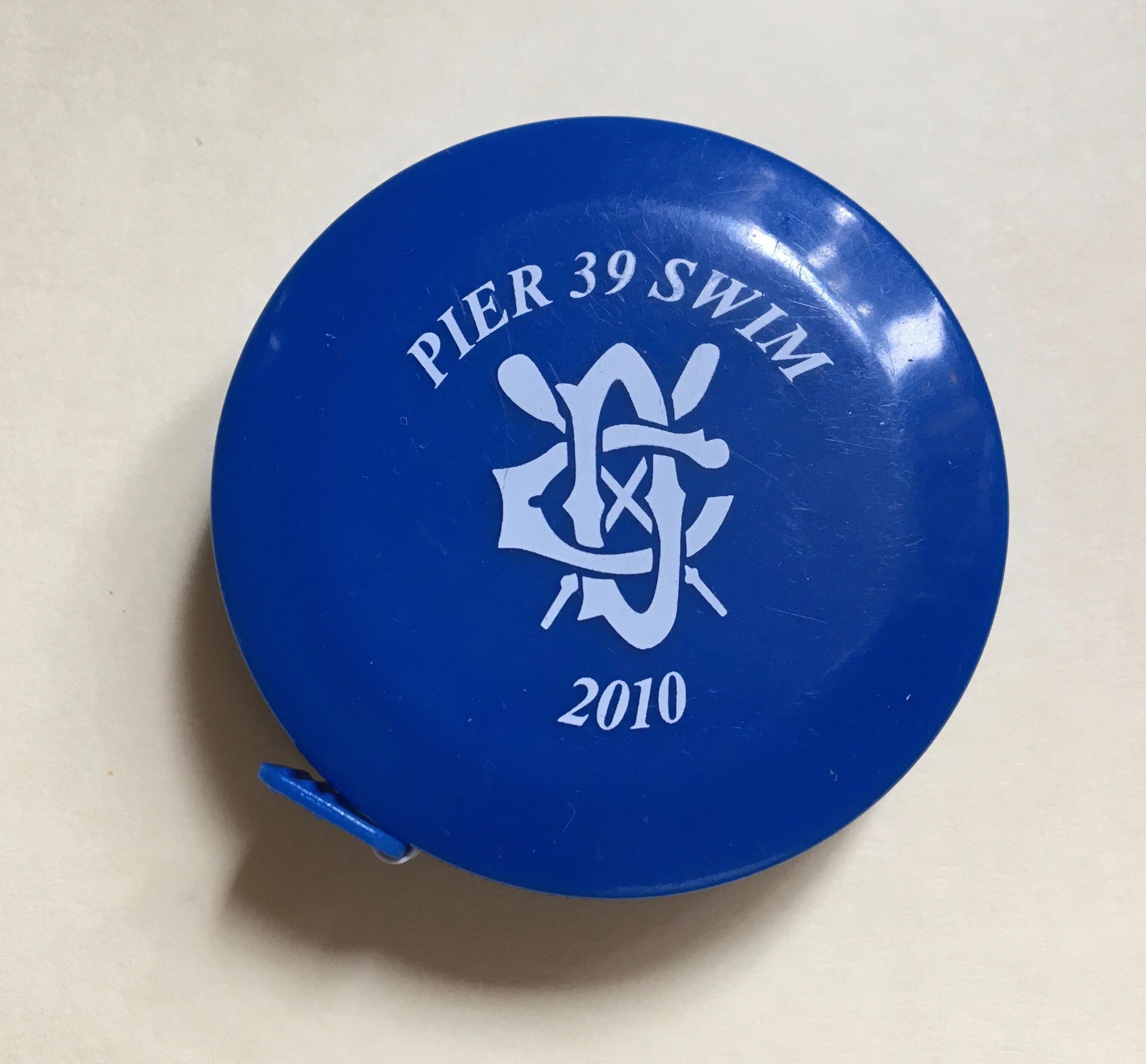 Round retractable tape measure, blue plastic. White text: Pier 39 Swim - 2010 with DC crossed oars logo in center. Tape measures 72 in/180 cm.Use
