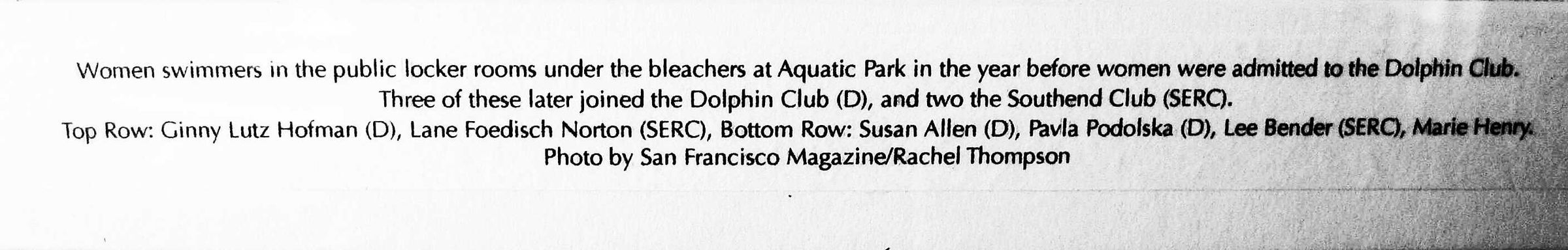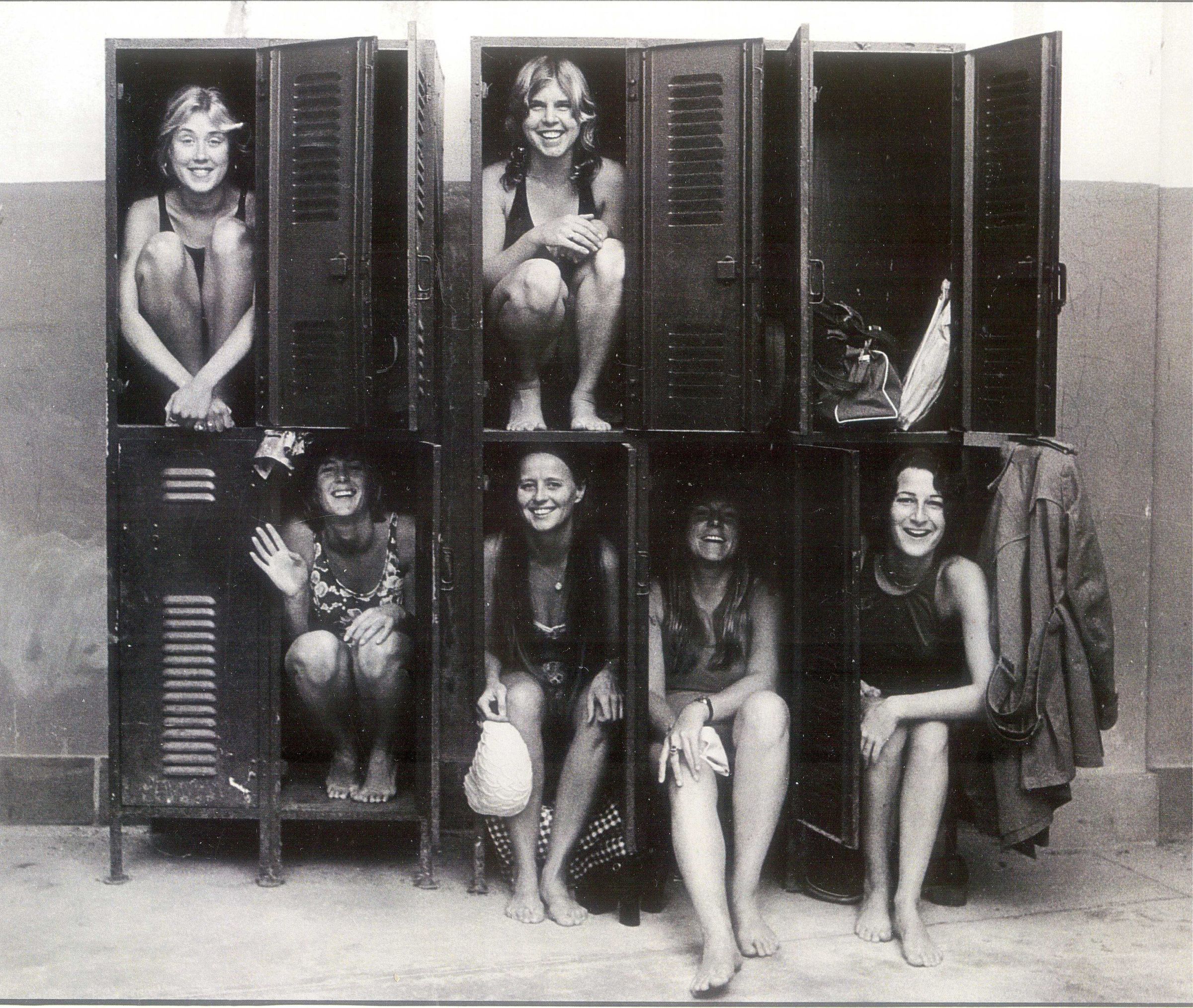 Six smiling girls squeezing inside lockers in public locker room under Aquatic Park bleachers prior to women's admission to Dolphin Club and SERC.