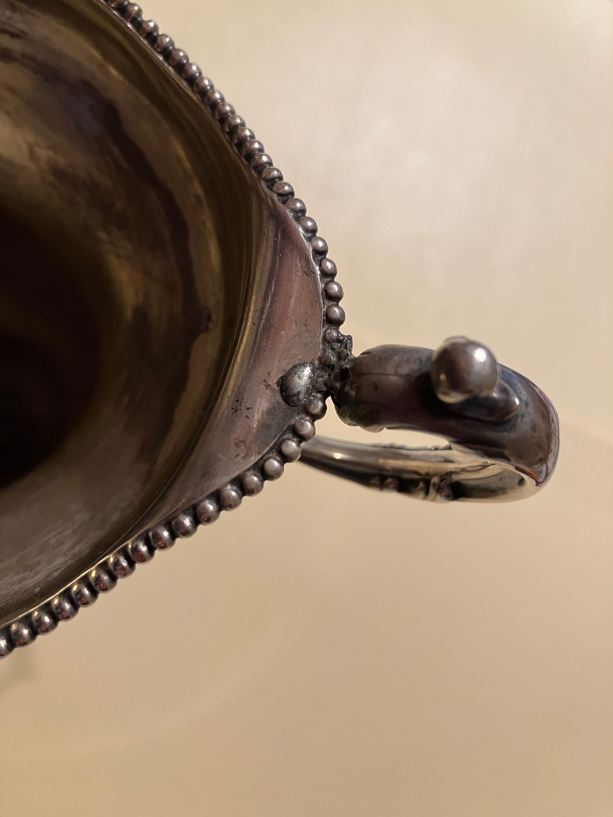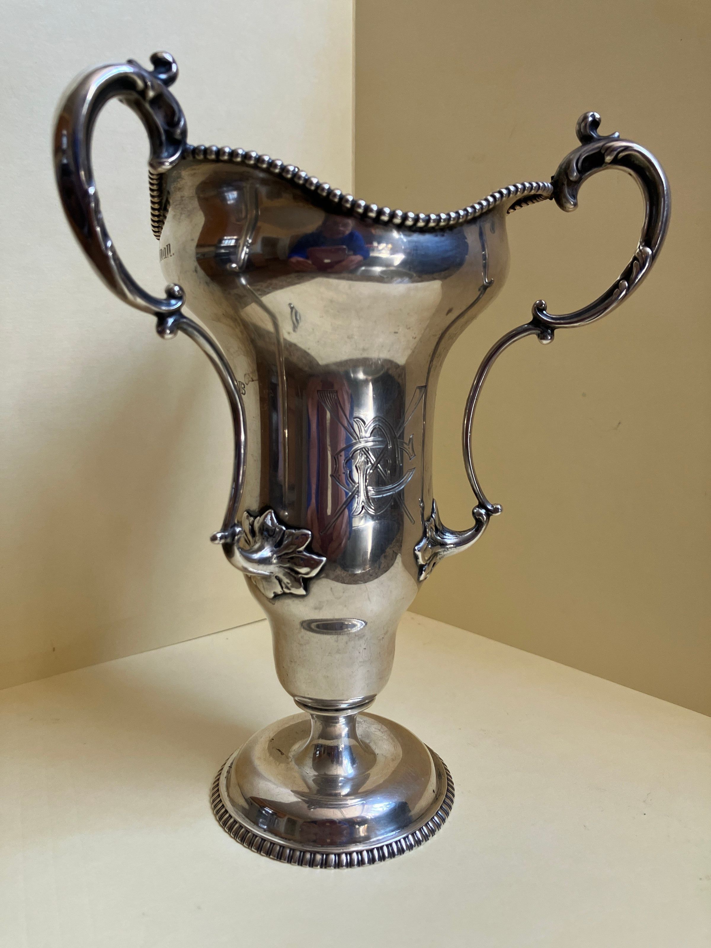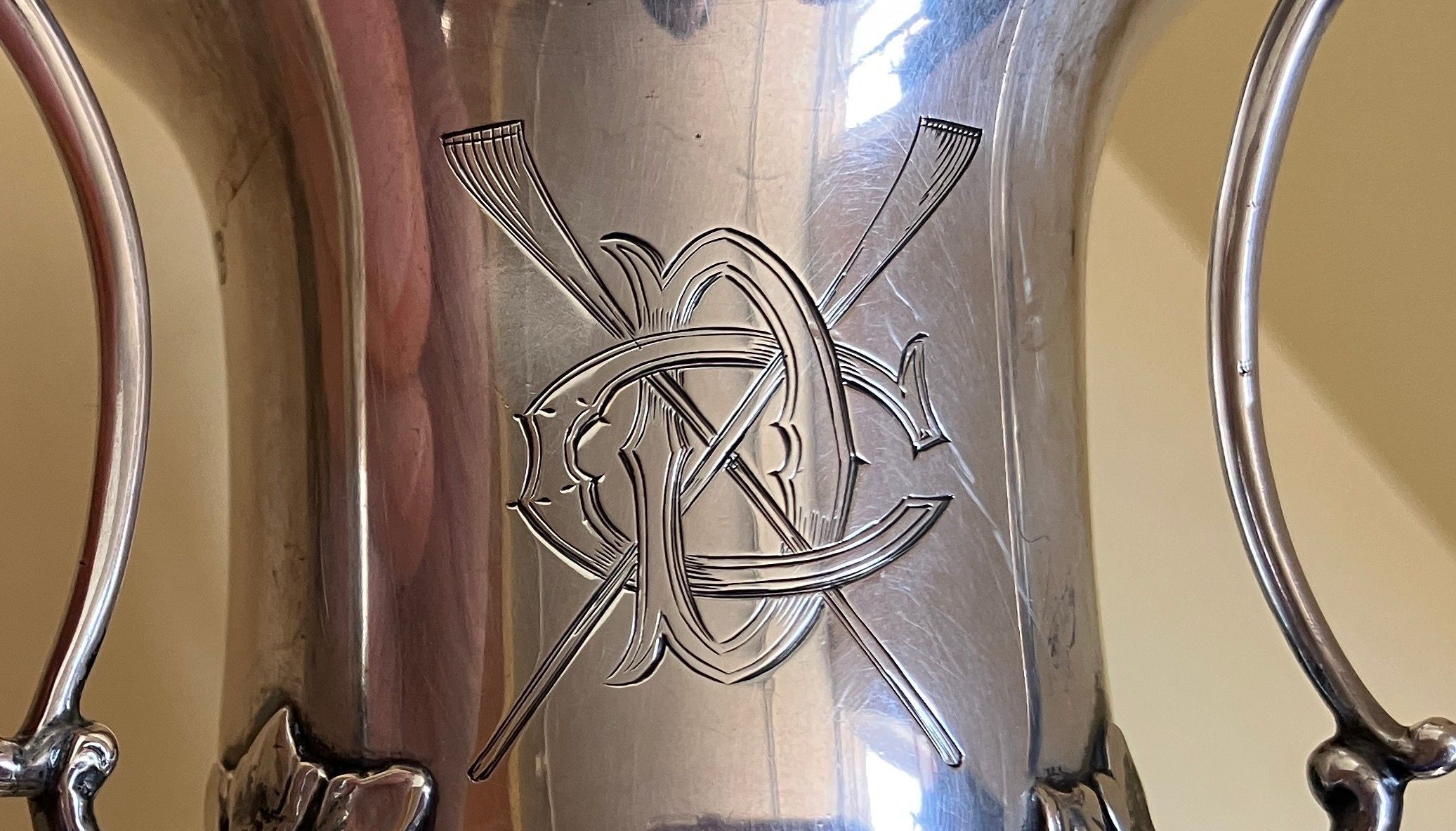 Ornate small three handled trophy cup. Top edge rises at handles and then dips down between and edge, and is decorated with tiny beads. Inscription on side 1, line drawing of DC boathouse on side 2, ornate crossed oars logo outline on side 3.