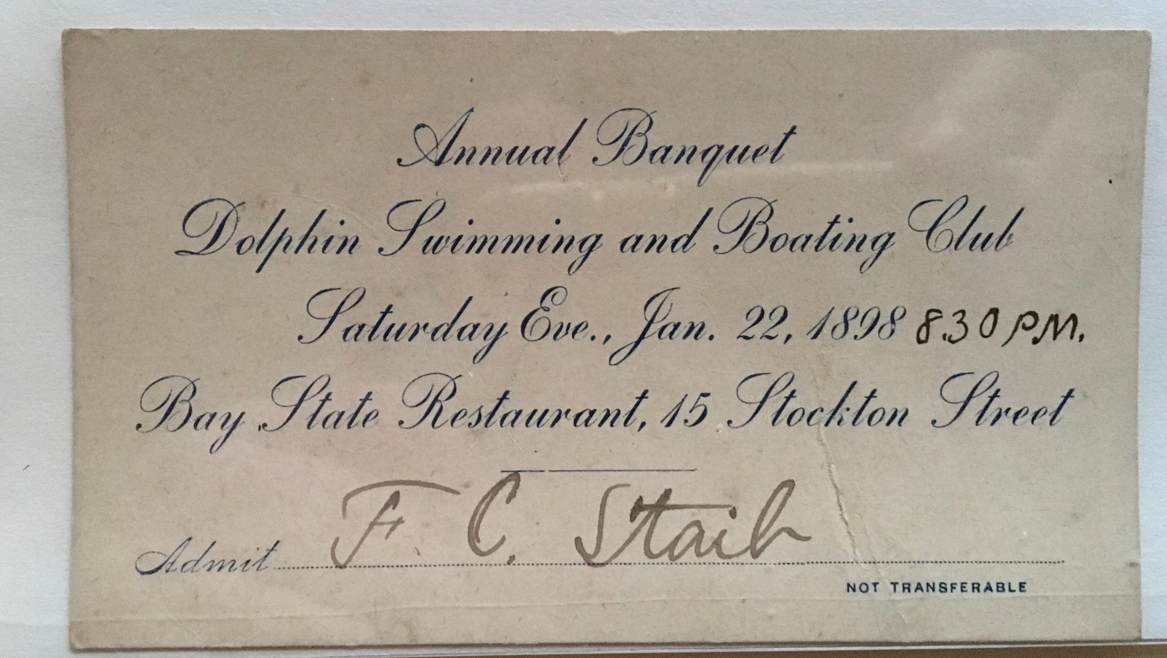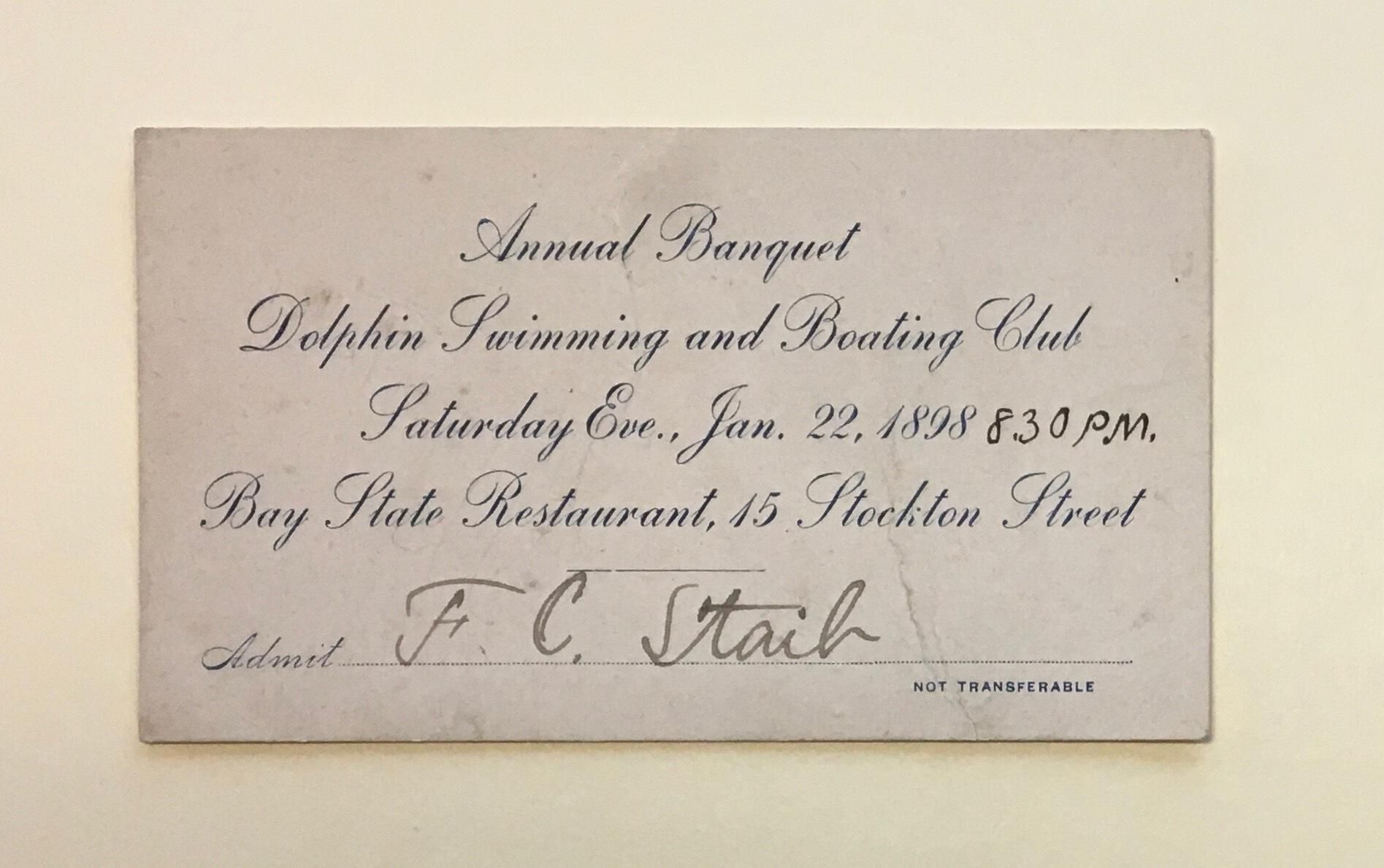 Ticket for annual banquet on January 22, 1898 at 8:30pm. Venue is Bay State Restaurant, 15 Stockton Street.