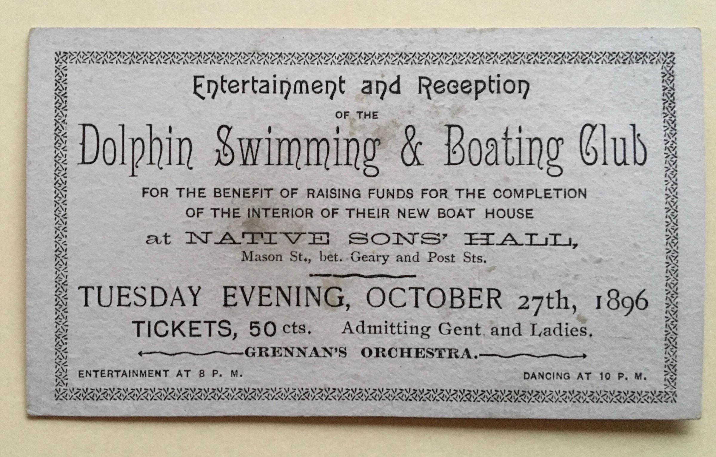 Ticket for entertainment and reception on October 27, 1896 for the Dolphin Swimming & Boating Club" for the benefit of raising funds for the completion of the interior of their new boat house."