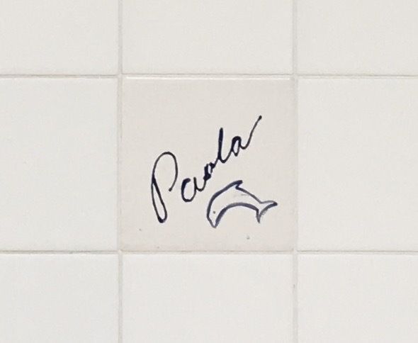 Tile 95 on south wall. Text: Pavla with drawing of a dolphin.