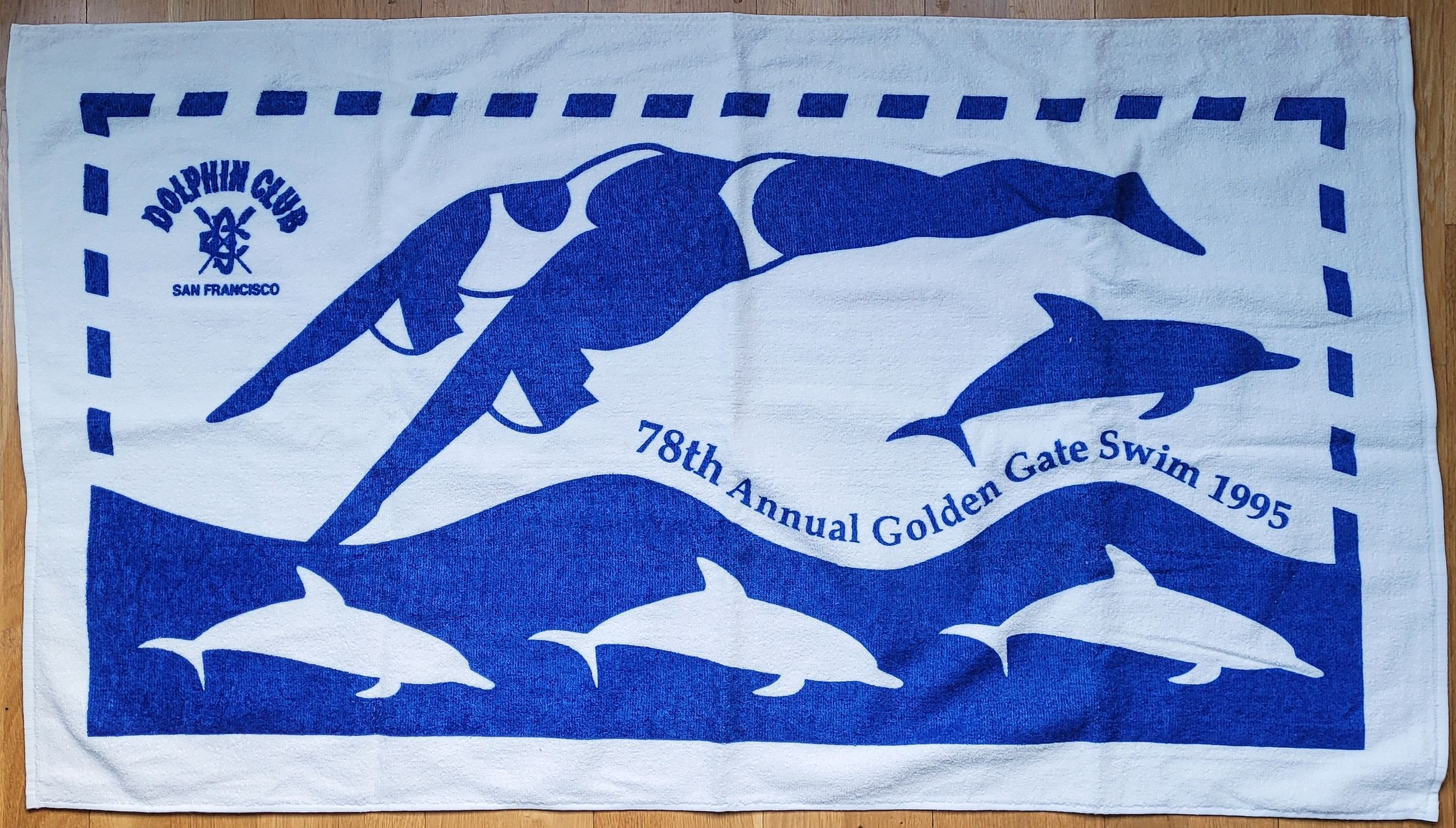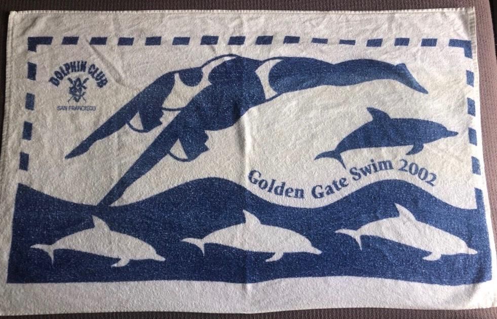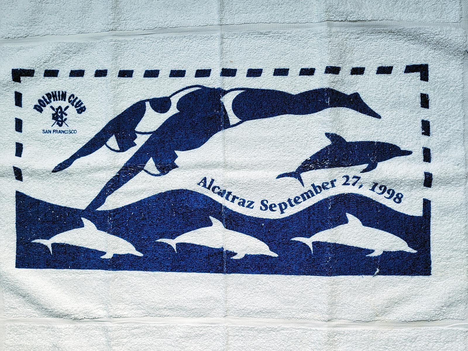 White towel with blue color border and figures. A female and male swimmer are shown diving on top, while four dolphins, one blue and three white, swim below. DC logo and Dolphin Club/San Francisco upper left corner.