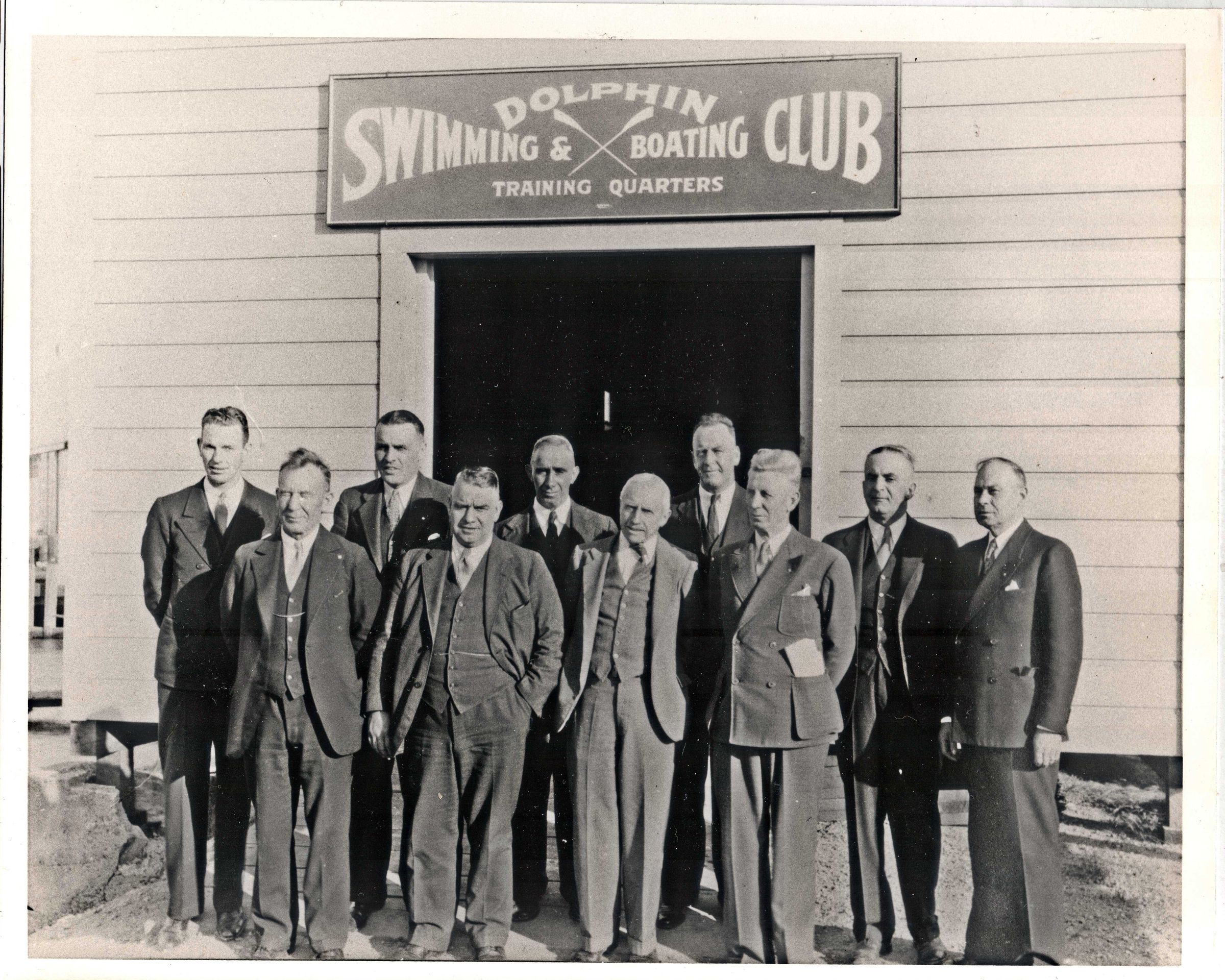 Board of Governors at dedication of training quarters in 1935 at Pier 54. In 1951 that location was taken over for a rail yard expansion. The building along with rowing training were soon relocated to Lake Merced.