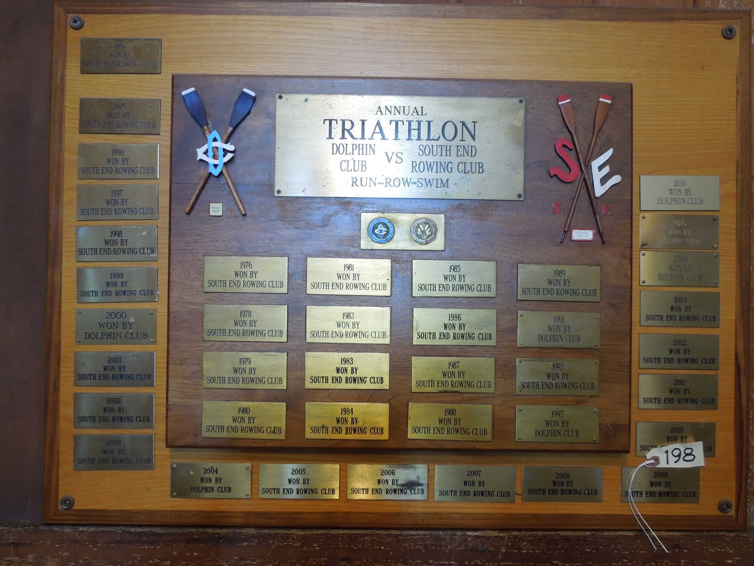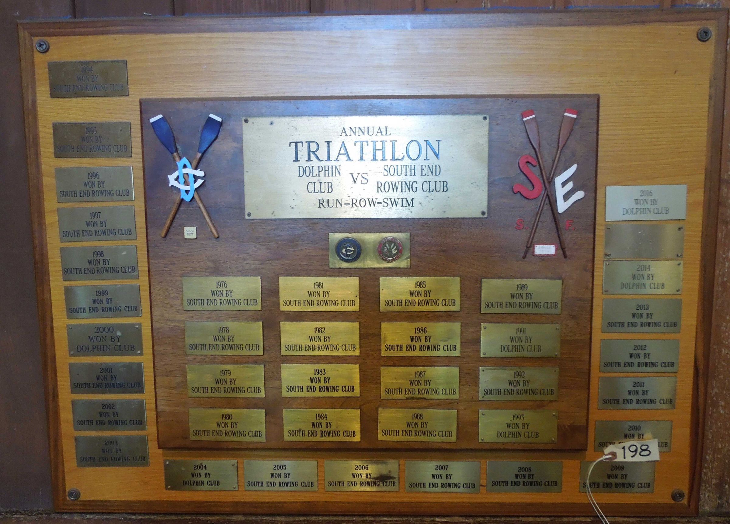 Text on large brass plate: Annual triathlon Dolphin Club vs. South End Rowing Club, Run-Row-Swim; Small plates: date and winning club name
