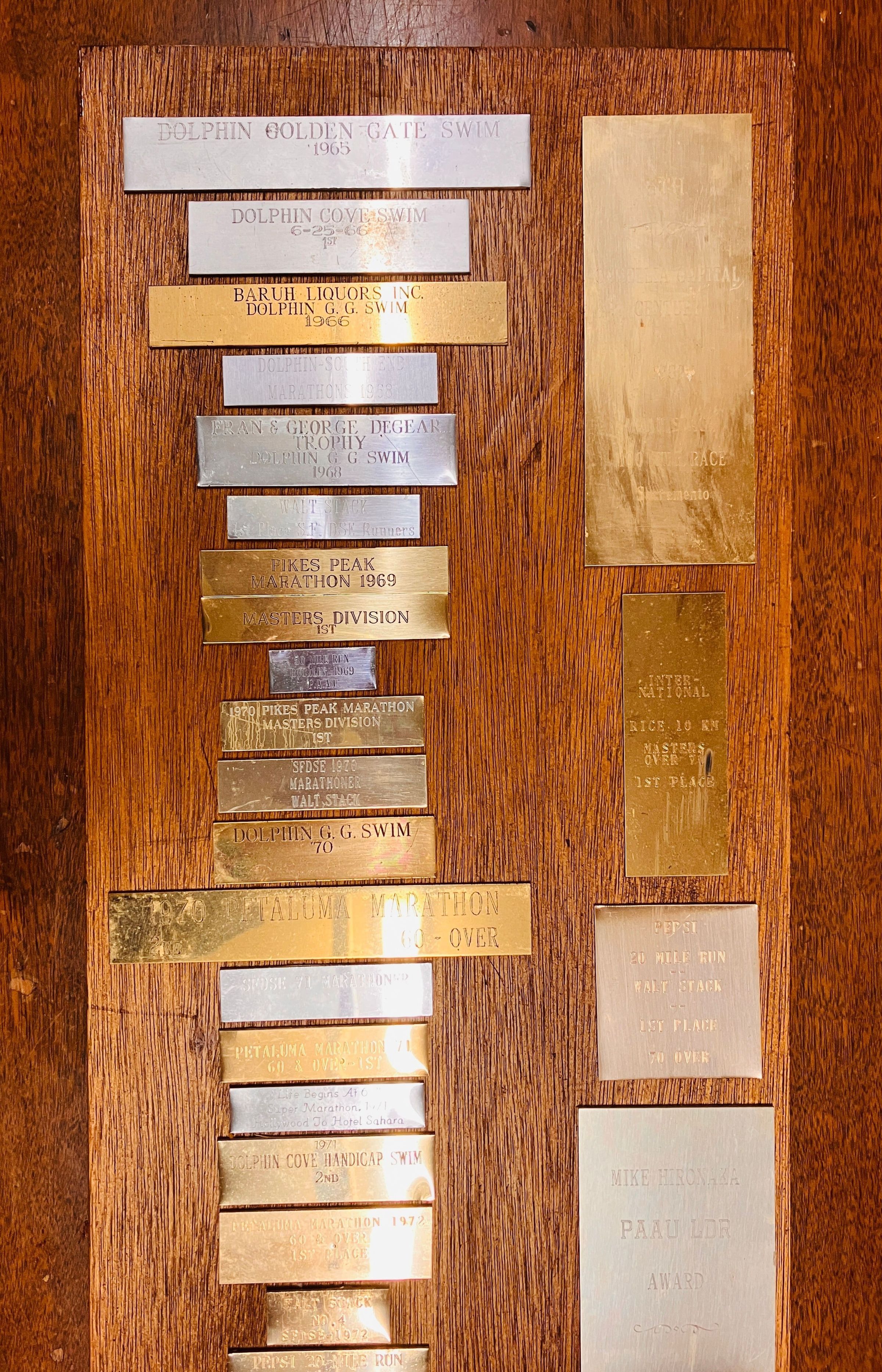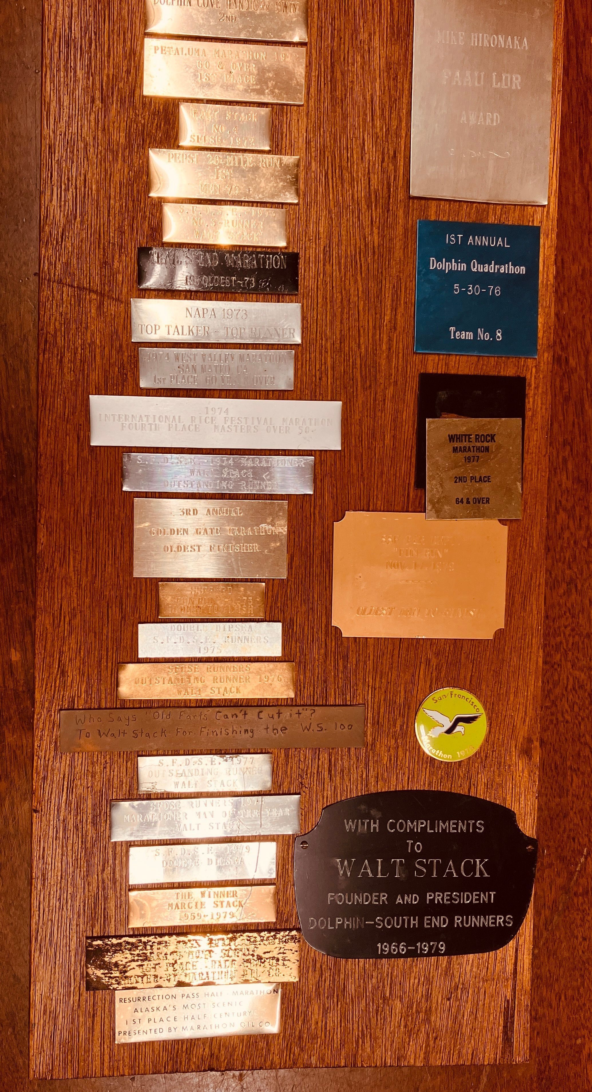 Brown wooden plank with plates from running trophies won by Walt Stack.
