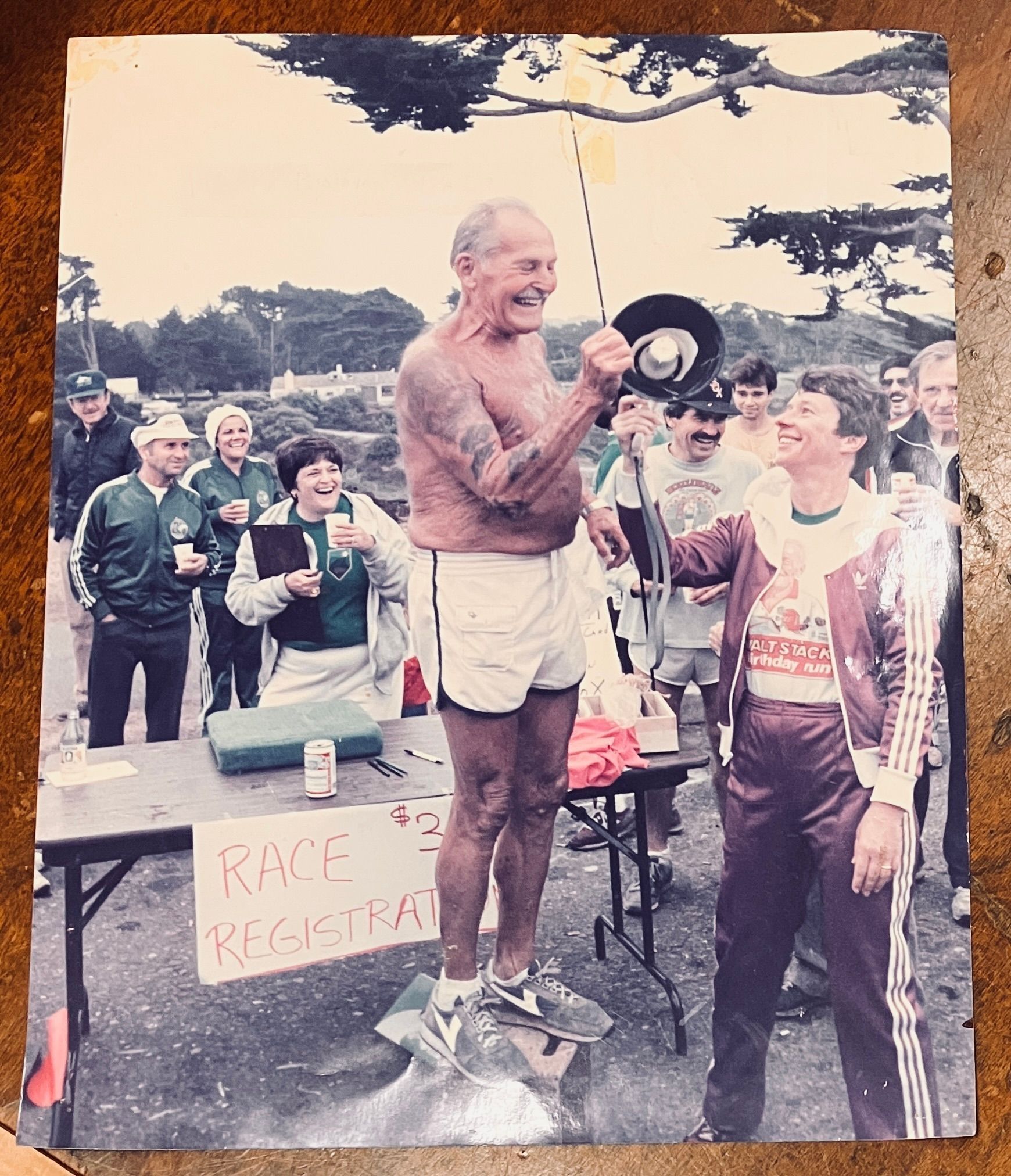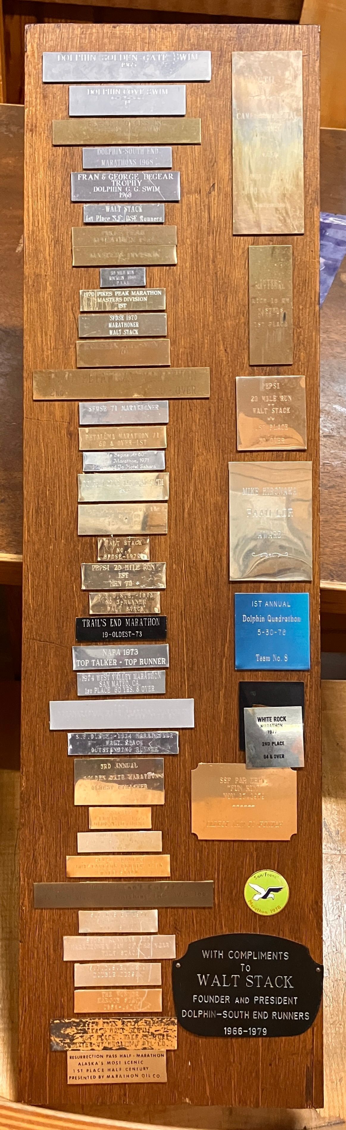 Bottom right ,dark color metal shield with text: With Compliments - to - Walt Stack - Founder and President - Dolphin-South End Runners - 1966-1979Location