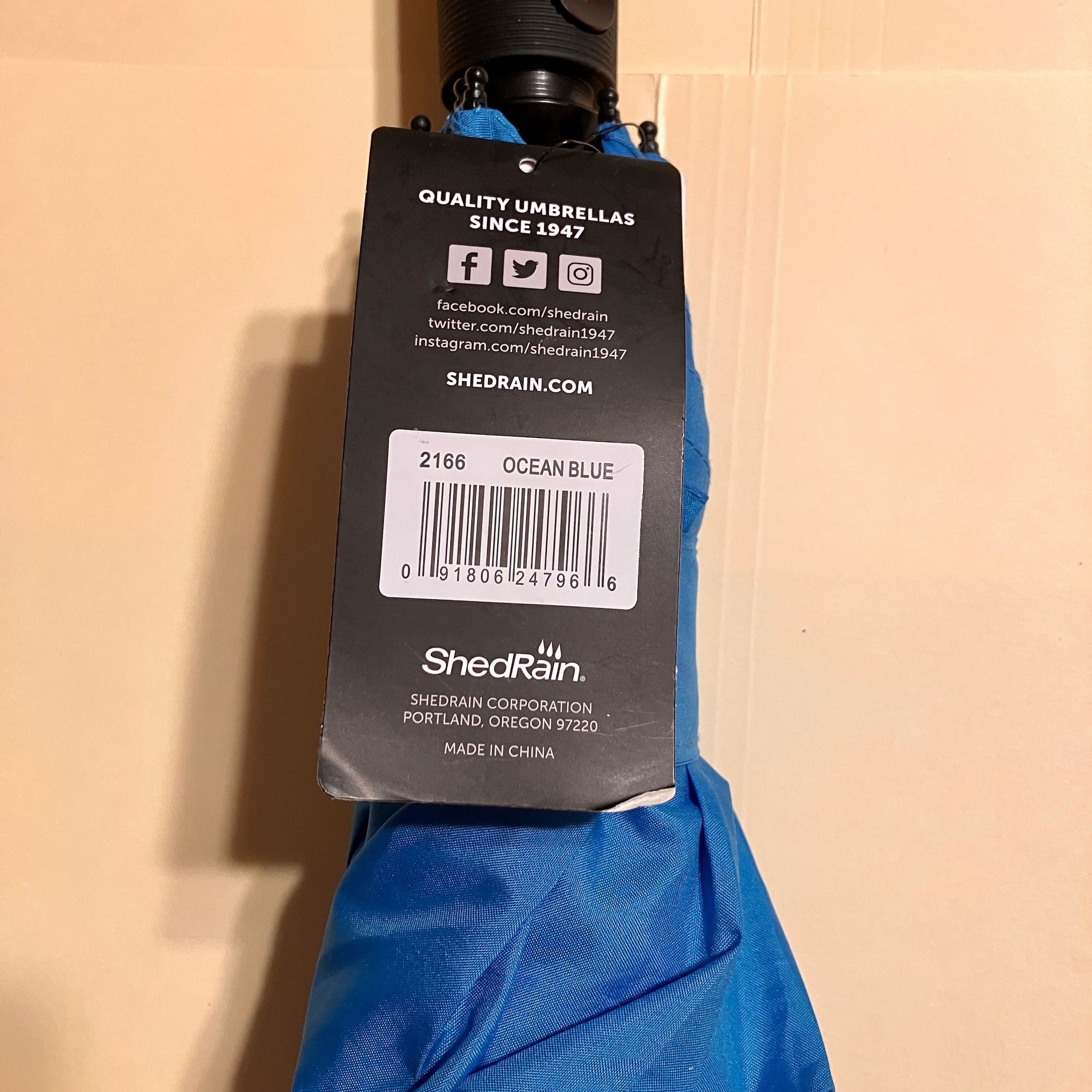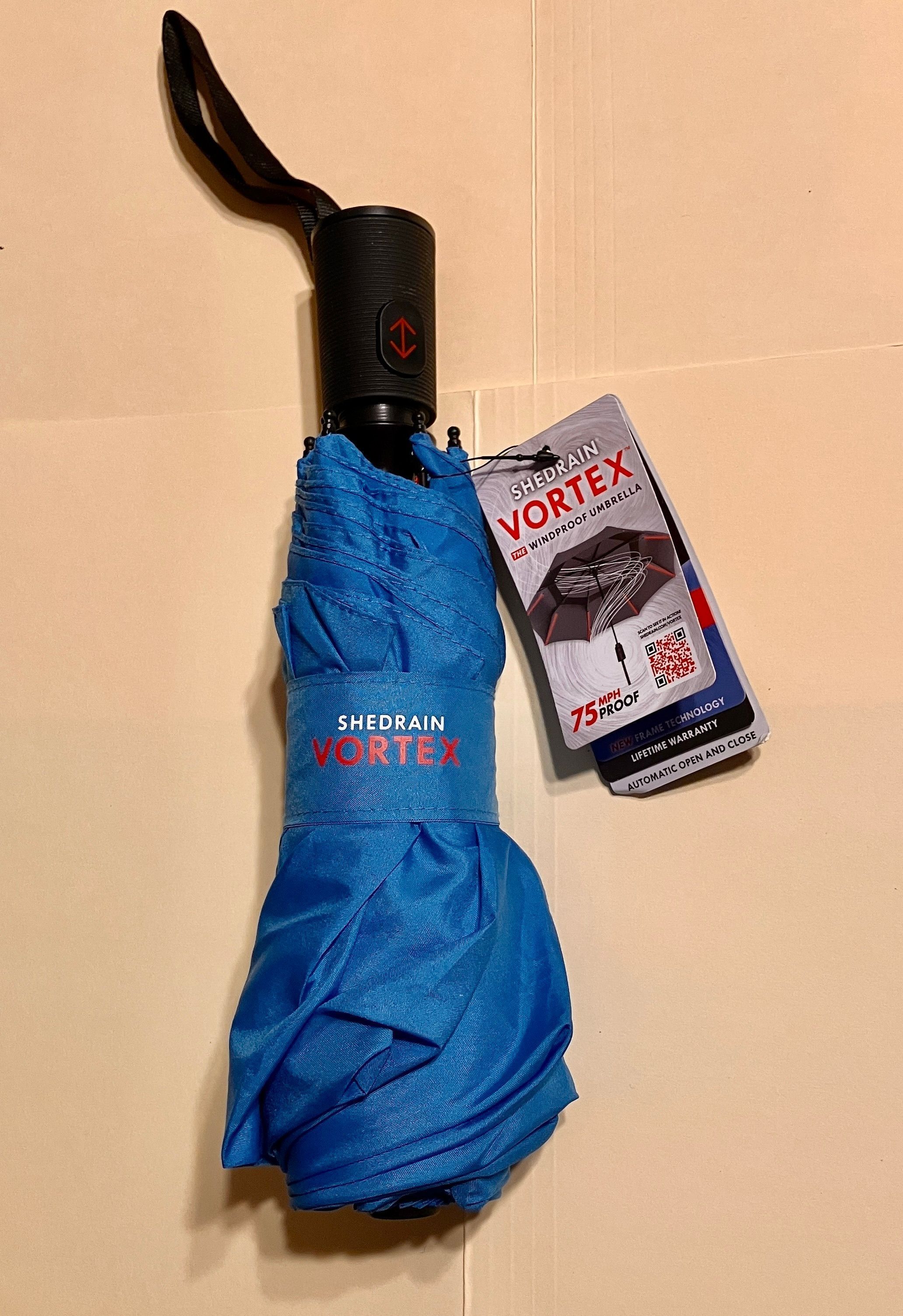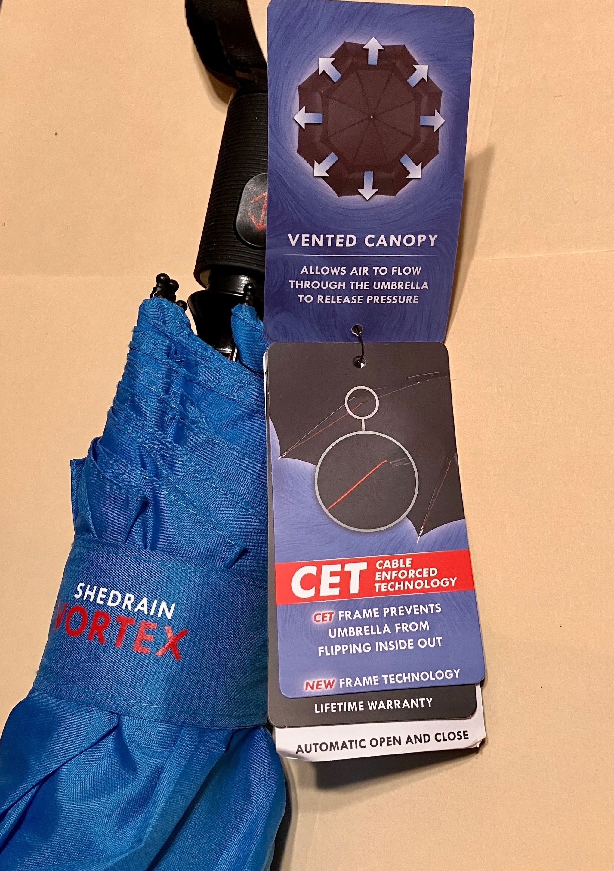 Manufacturer label: Shredrain Vortex - The Windproof Umberella - 75 mph Proof - Portland, Oregon - Made in ChinaMade/Created