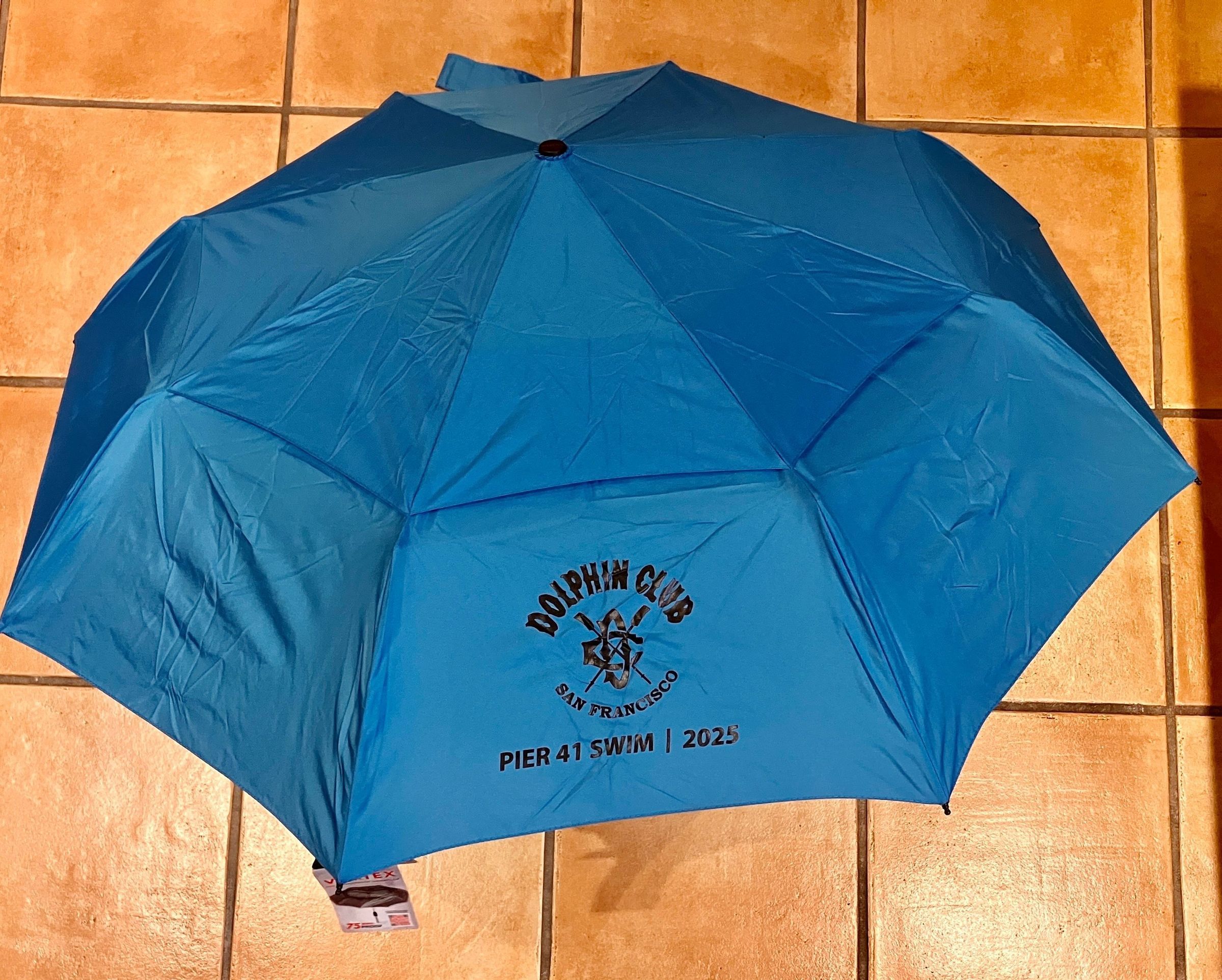 Blue folding umbrella given as trinket for 2025 Pier 41 Swim.
