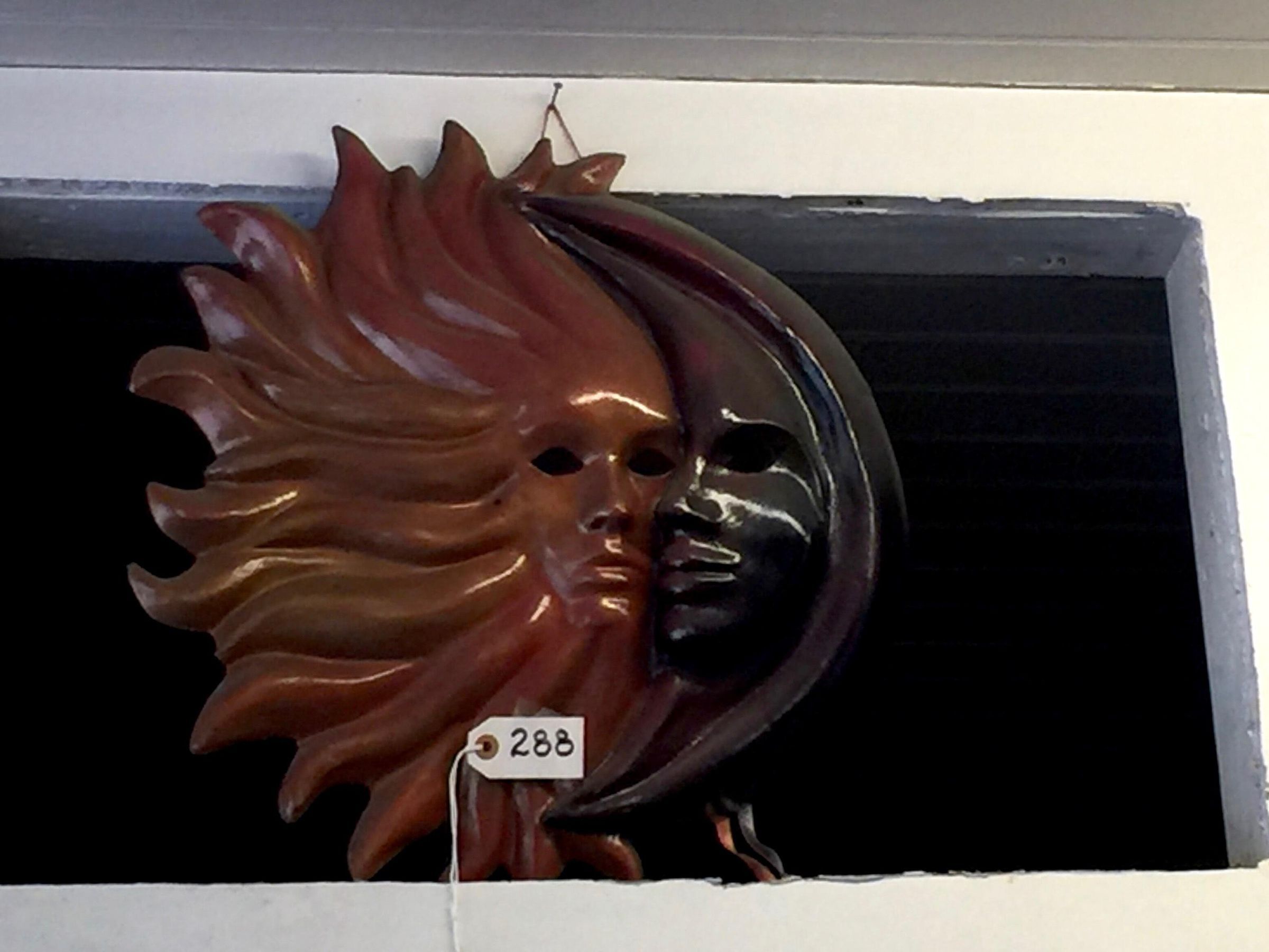Paper mache mask of brown half sun and black quarter moon with ribbon ties in back. Inscriptions read: "Fatta a Mano" (handmade), "in Venezia 1990," and "Sole Luna."Made/Created