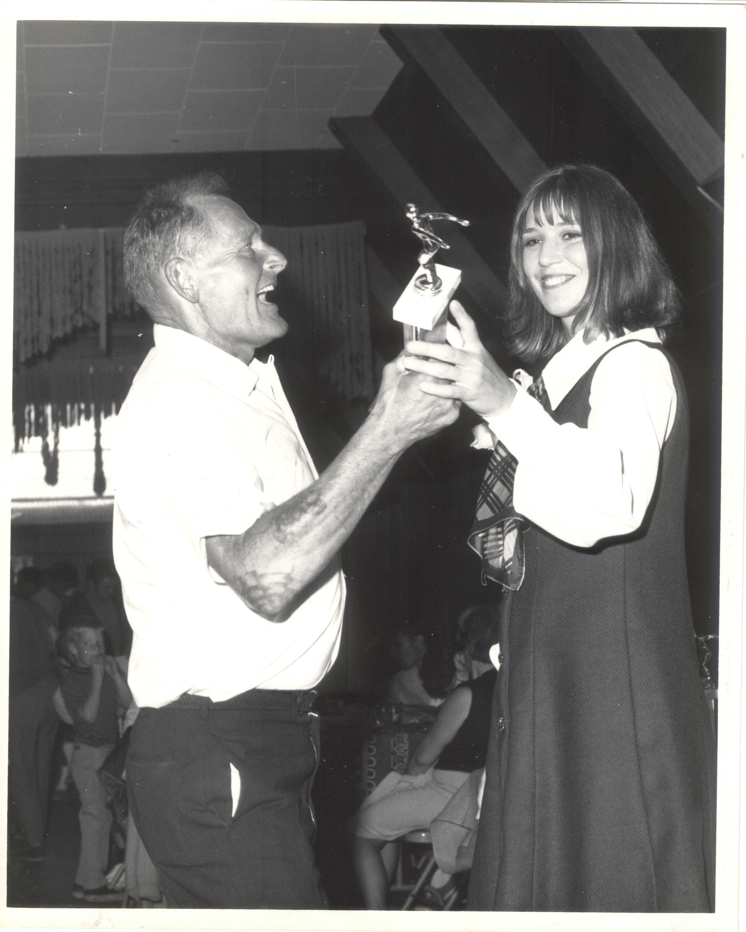 Swim Queen Shirley Rose presenting trophy to Walt Stack