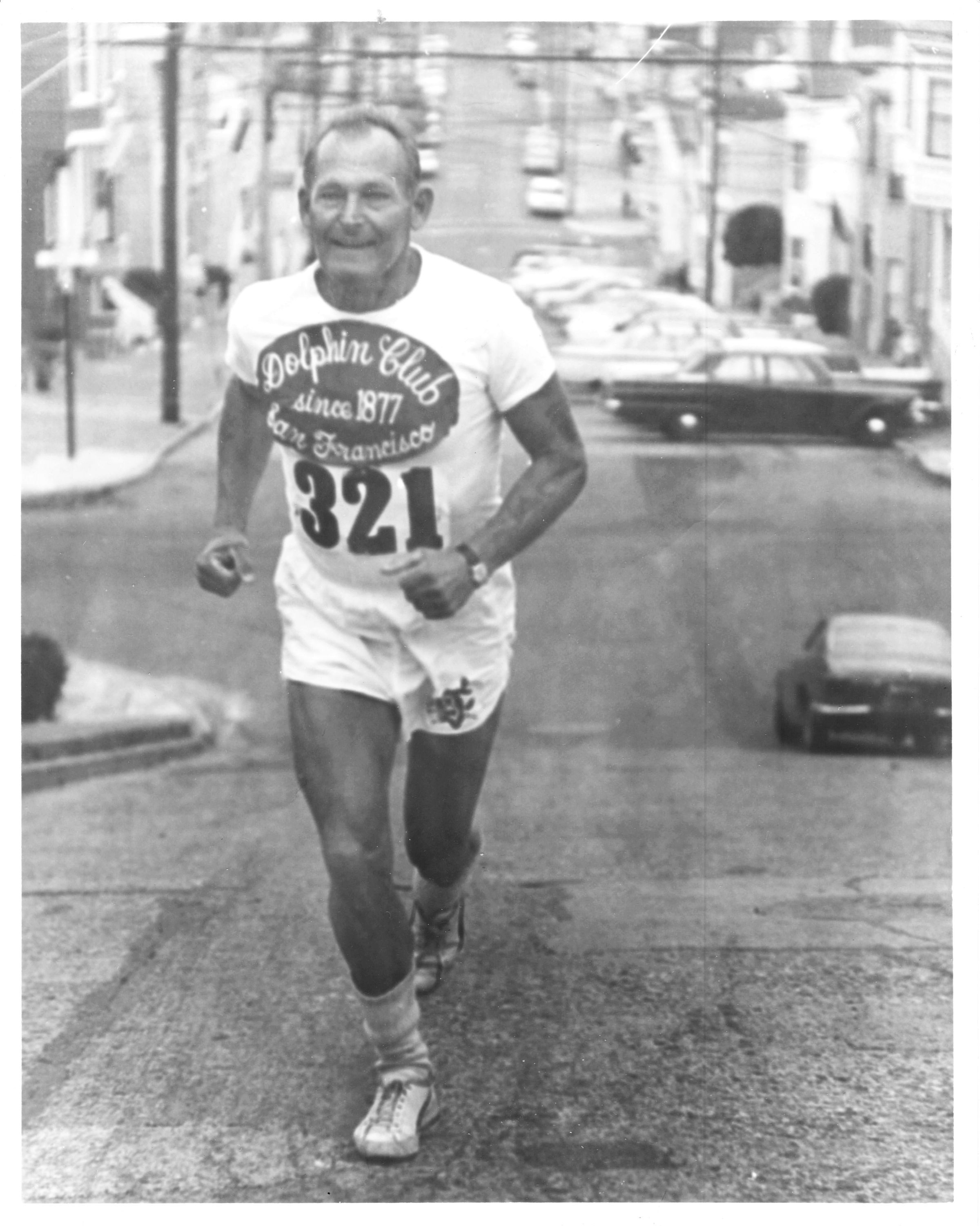 Walt Stack running the hills of San Francisco displaying his 1968 Boston Marathon number.