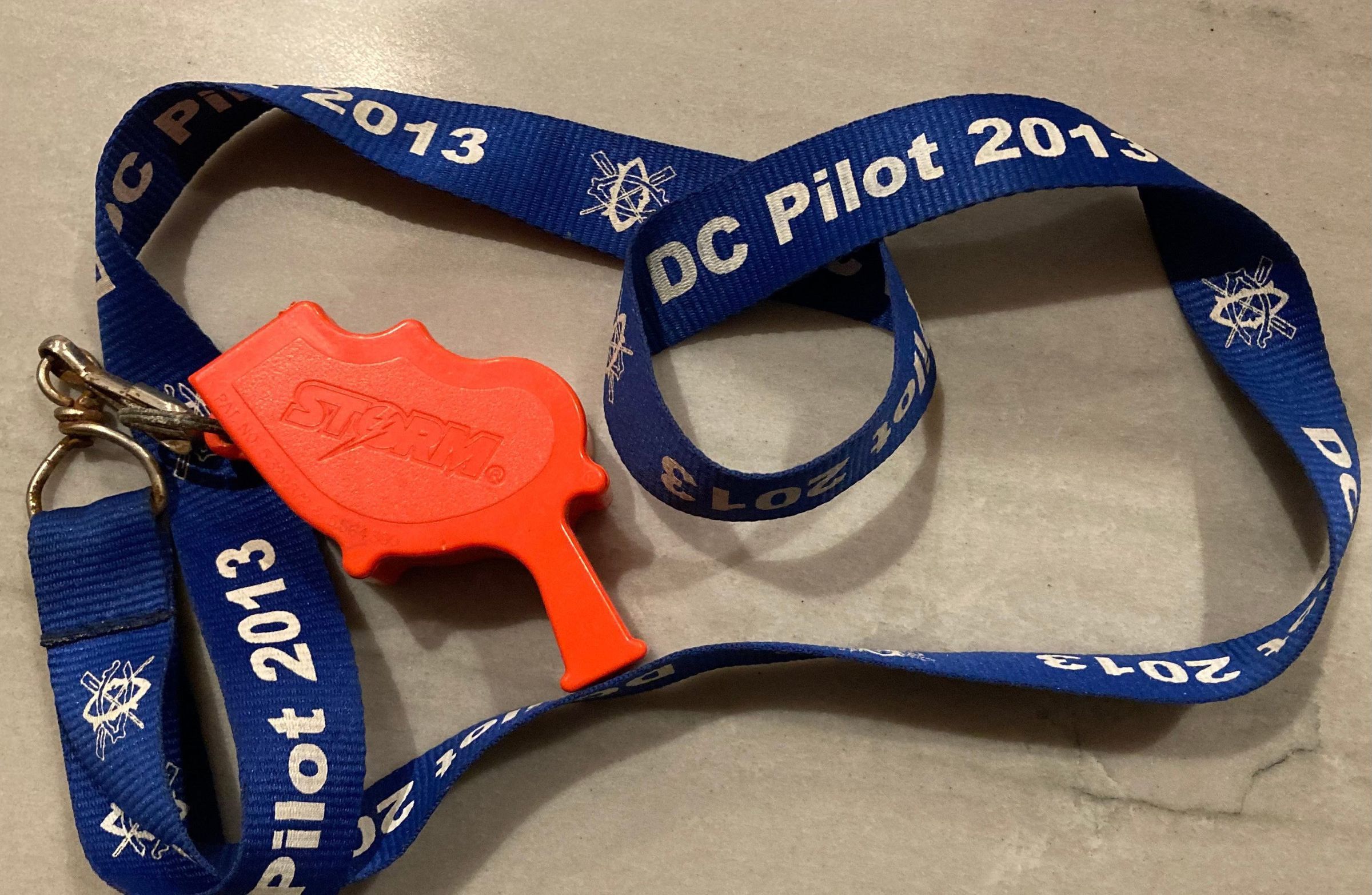 Red "Storm" brand plastic whistle on blue ribbon lanyard with white text.
