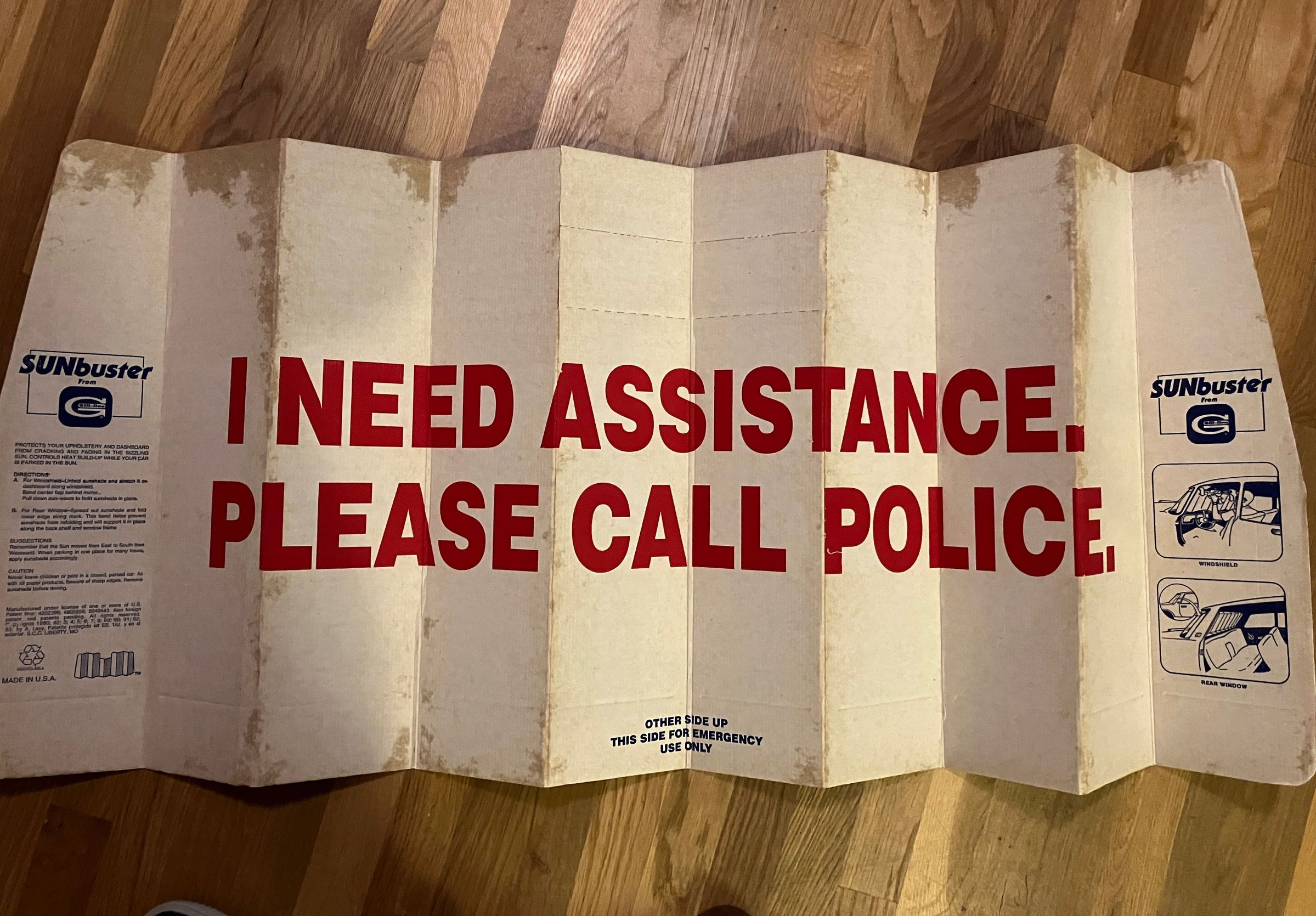 Sun shade for car windshield. Made of folding cardboard.