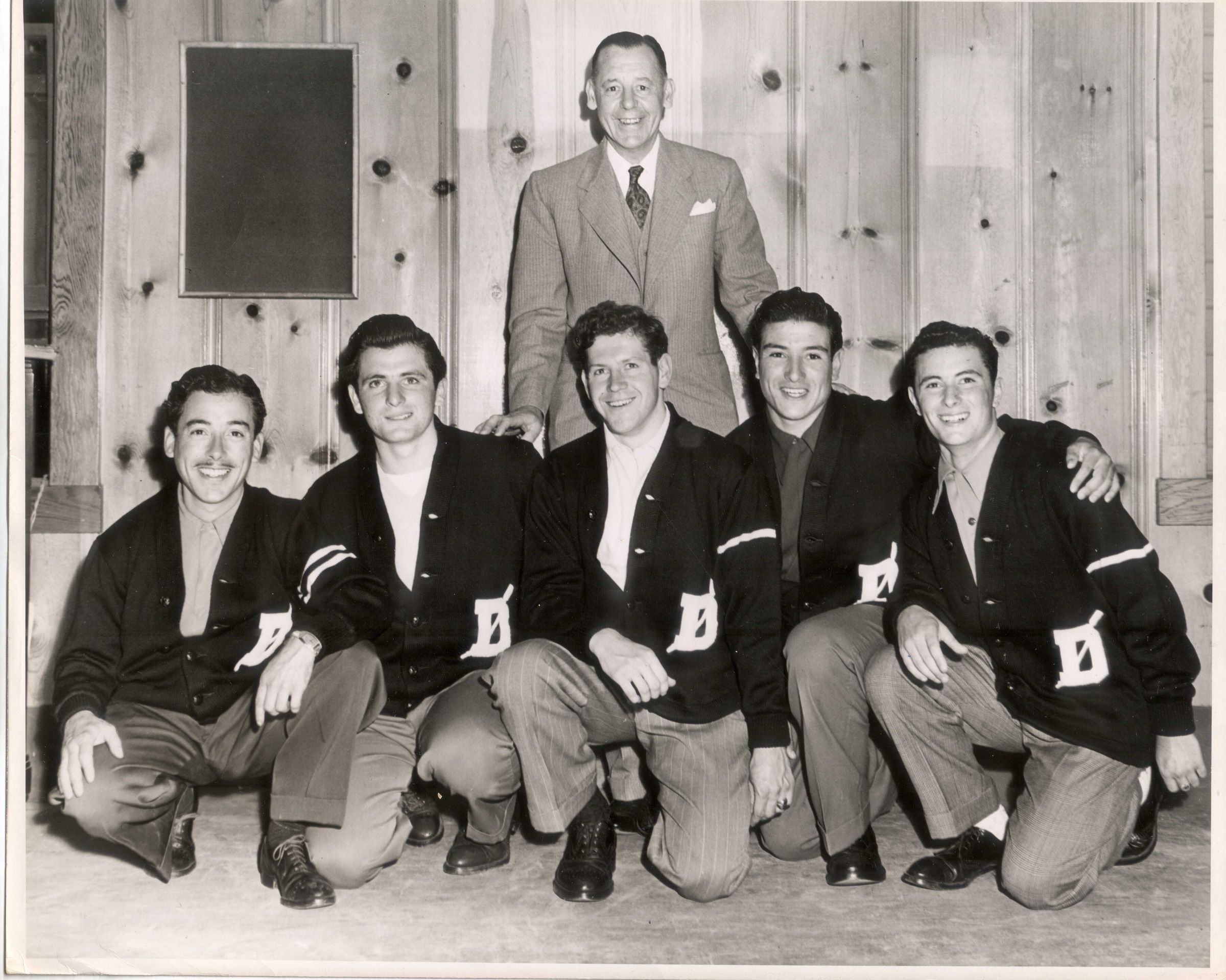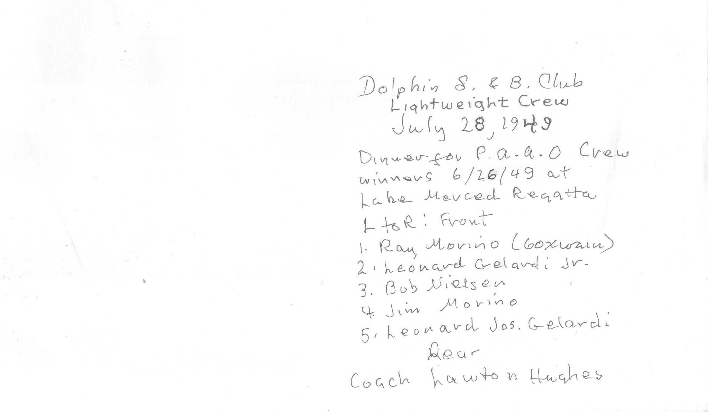Dinner honoring Dolphin crews and coach Hughes: Ray Morino, Leonard Gelardi Jr, Bob Nielsen, Jim Morino, Leonard Jos. Gelardi, rear Coach Lawton HughesSubject Person or Organization