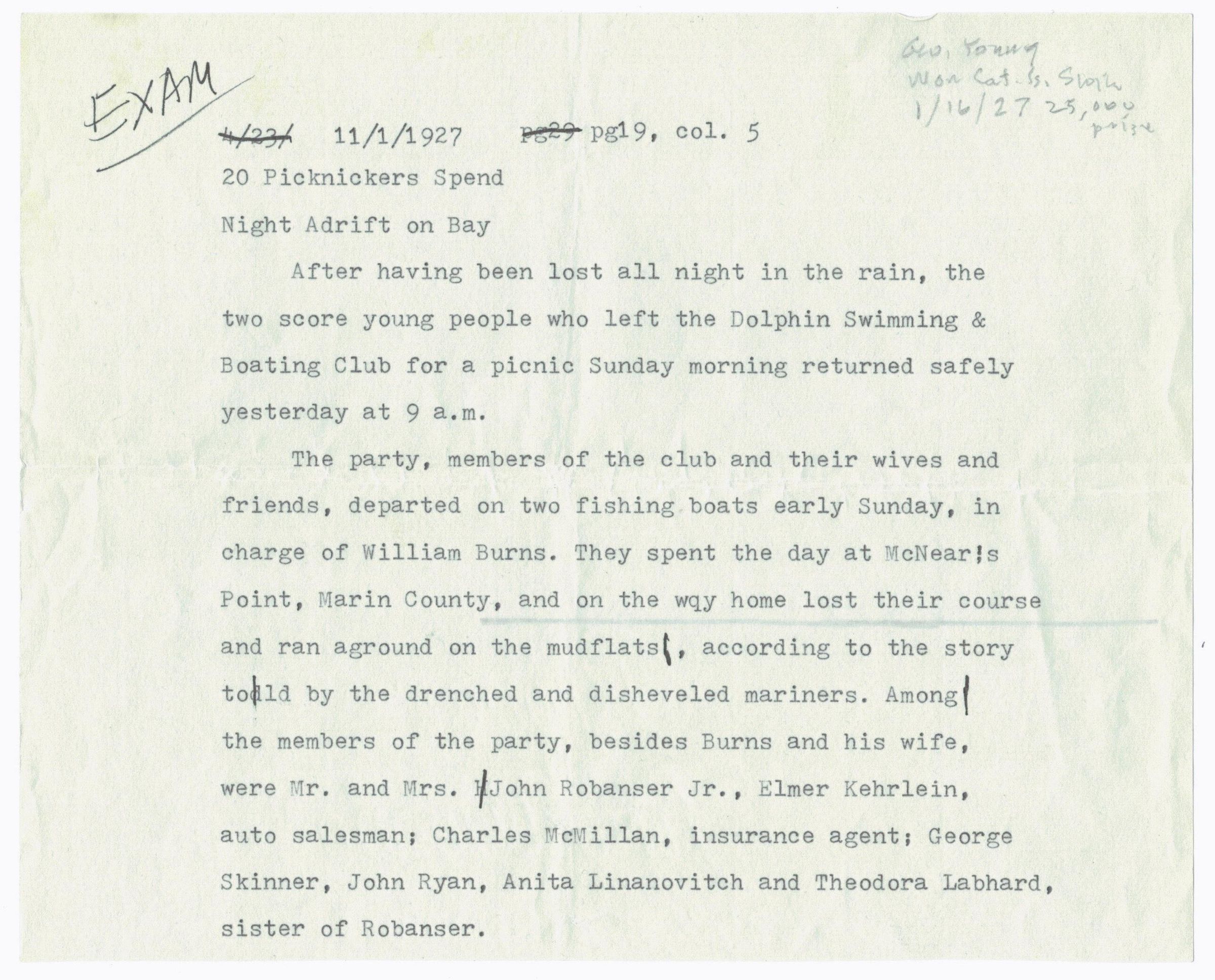 Typed draft of news article on greenish paper with title "20 Picnickers Spend Night Adrift on Bay," and dated "11/1/1927, pg19, col. 5.